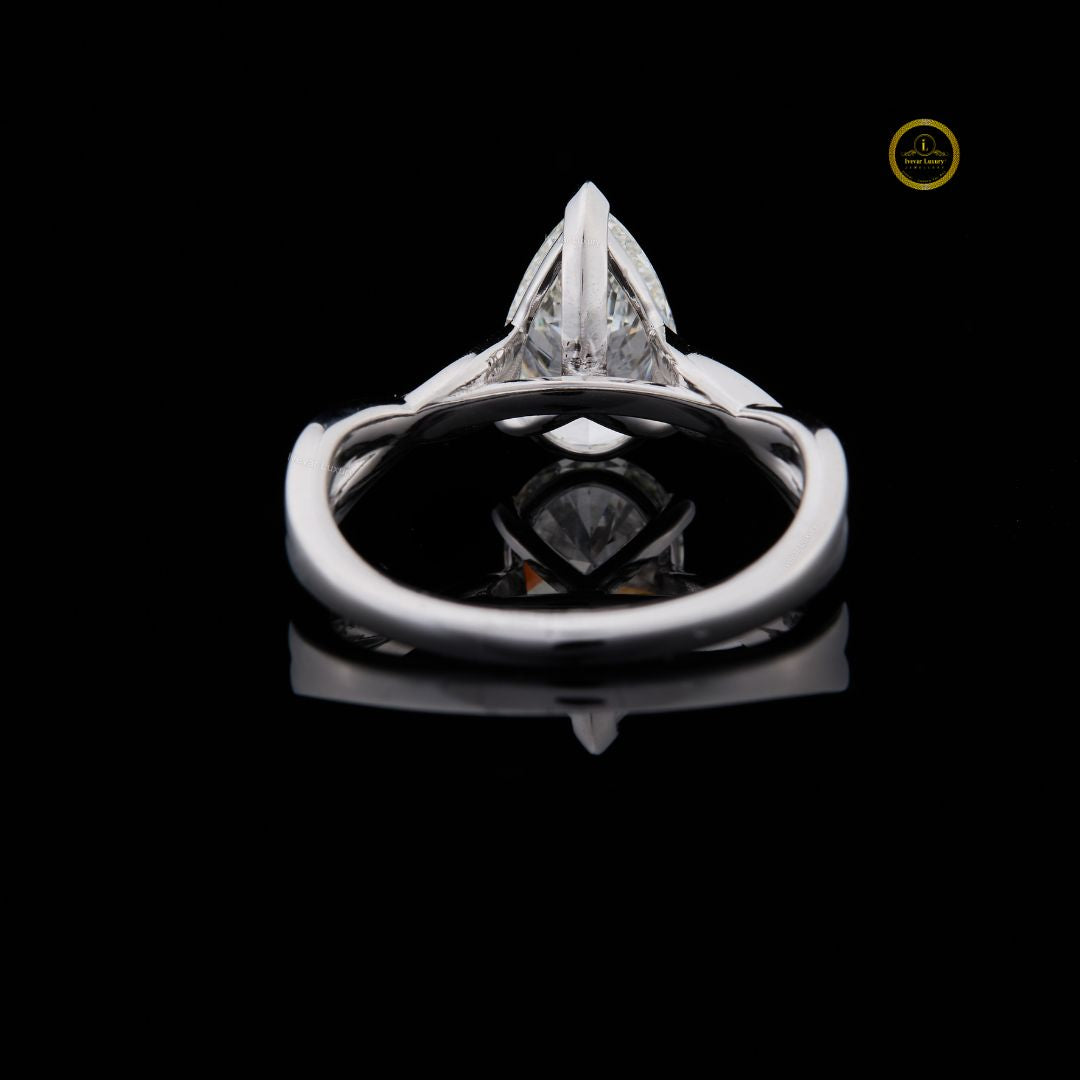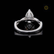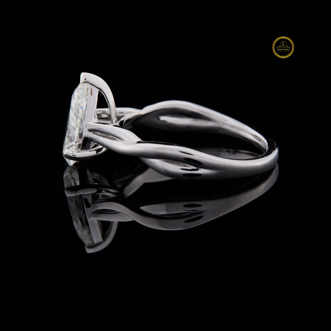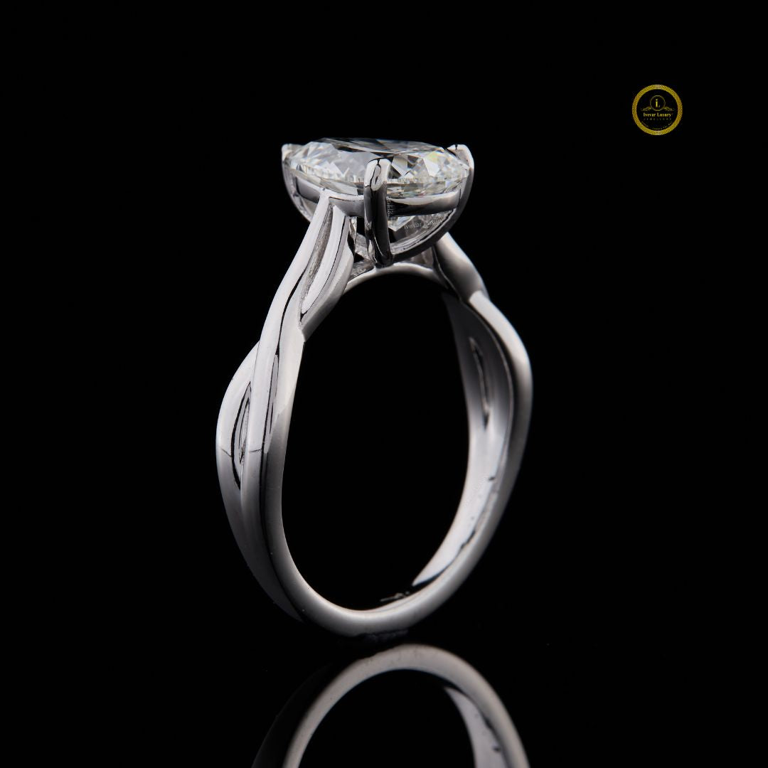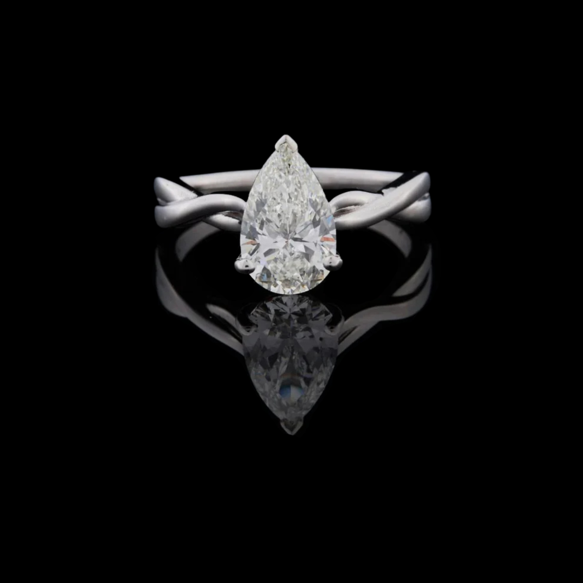 This stunning engagement ring features a brilliant pear-cut diamond as its captivating centerpiece, renowned for its elegant, teardrop shape that beautifully elongates the finger. The center stone is securely set atop a modern and sophisticated intertwined band crafted from polished white gold or platinum. The unique twist in the band symbolizes the joining of two paths, offering a contemporary yet timeless appeal. Presented against a dramatic black backdrop with a reflective surface, the diamond's fire and brilliance are intensely highlighted. This piece is a perfect blend of classic elegance and modern design, ideal for a memorable proposal.