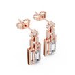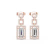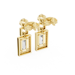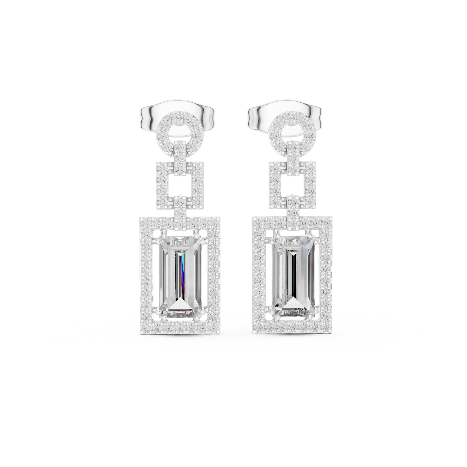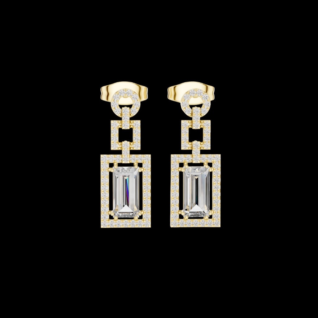 These striking gold drop earrings feature a bold geometric design highlighted by a radiant baguette-cut diamond at the center. Suspended from diamond-accented links, the rectangular halo frame enhances brilliance while adding architectural elegance. The layered structure creates graceful movement and refined sparkle with every turn. Crafted for modern sophistication, these earrings are ideal for evening events, celebrations, or statement styling, offering a perfect blend of contemporary design and timeless luxury.
