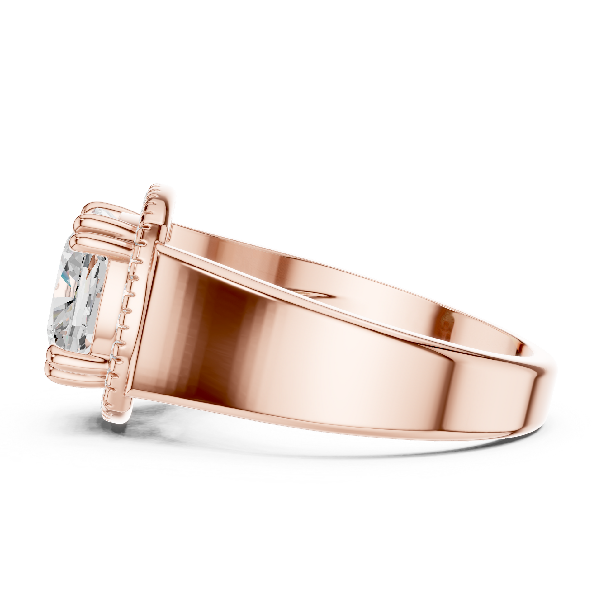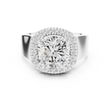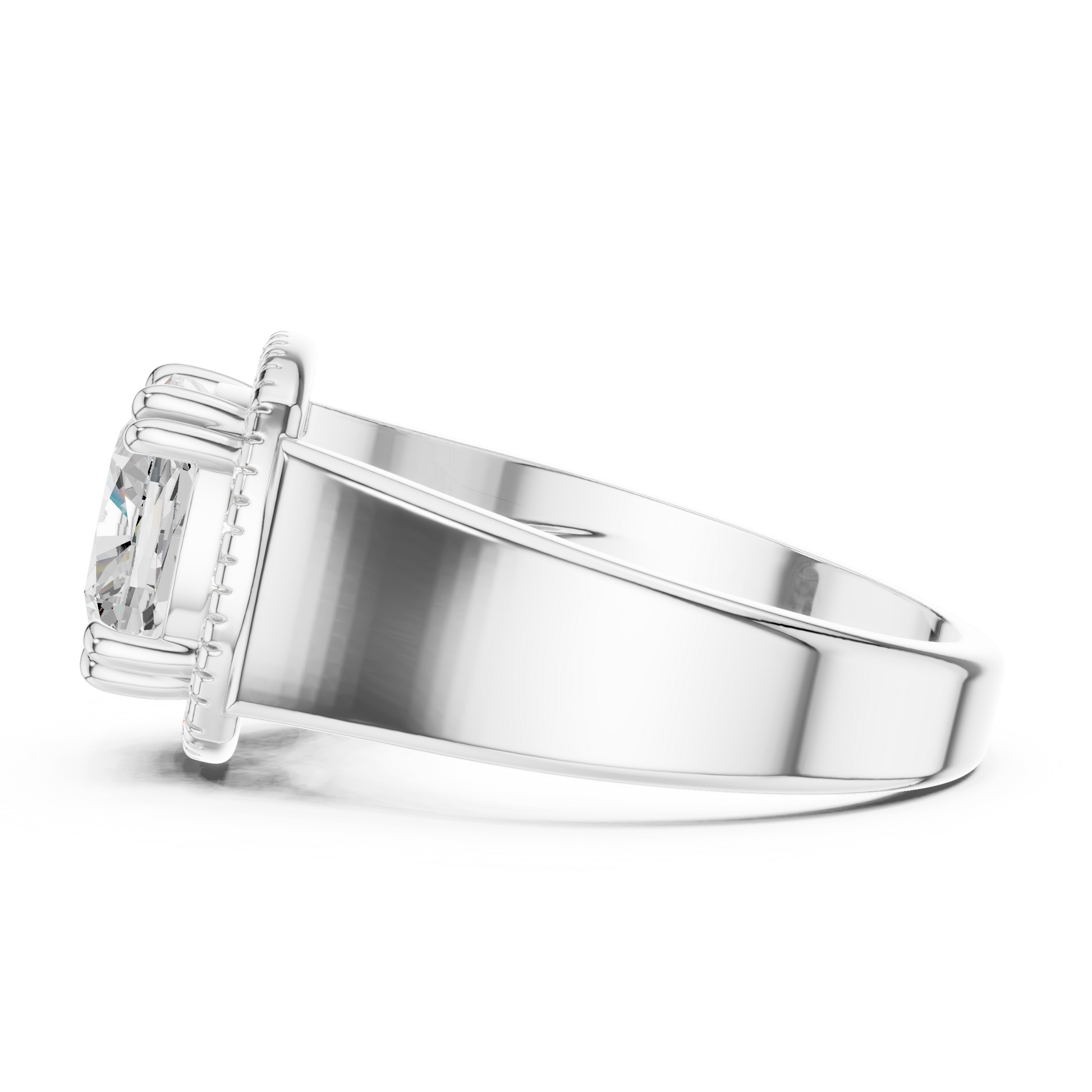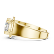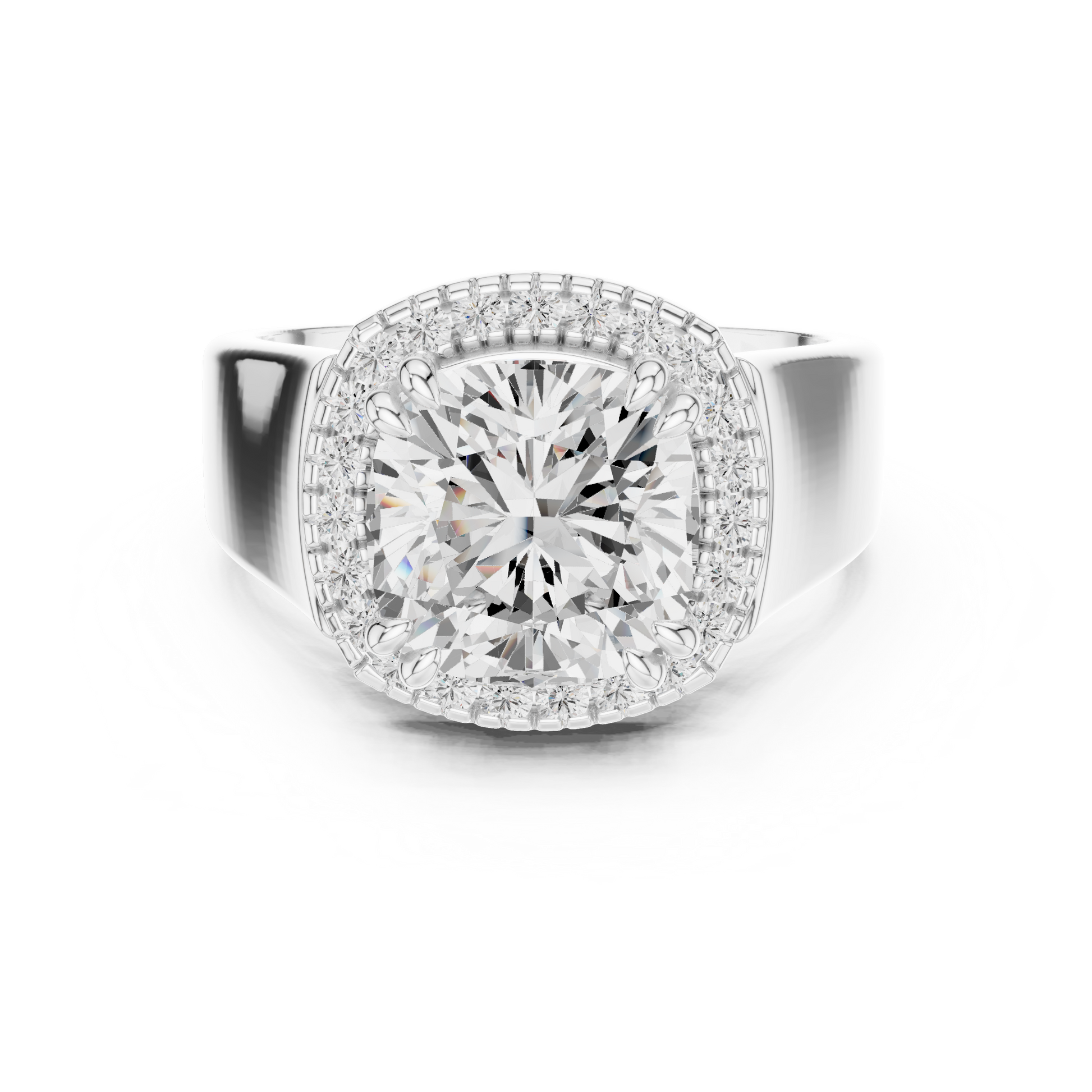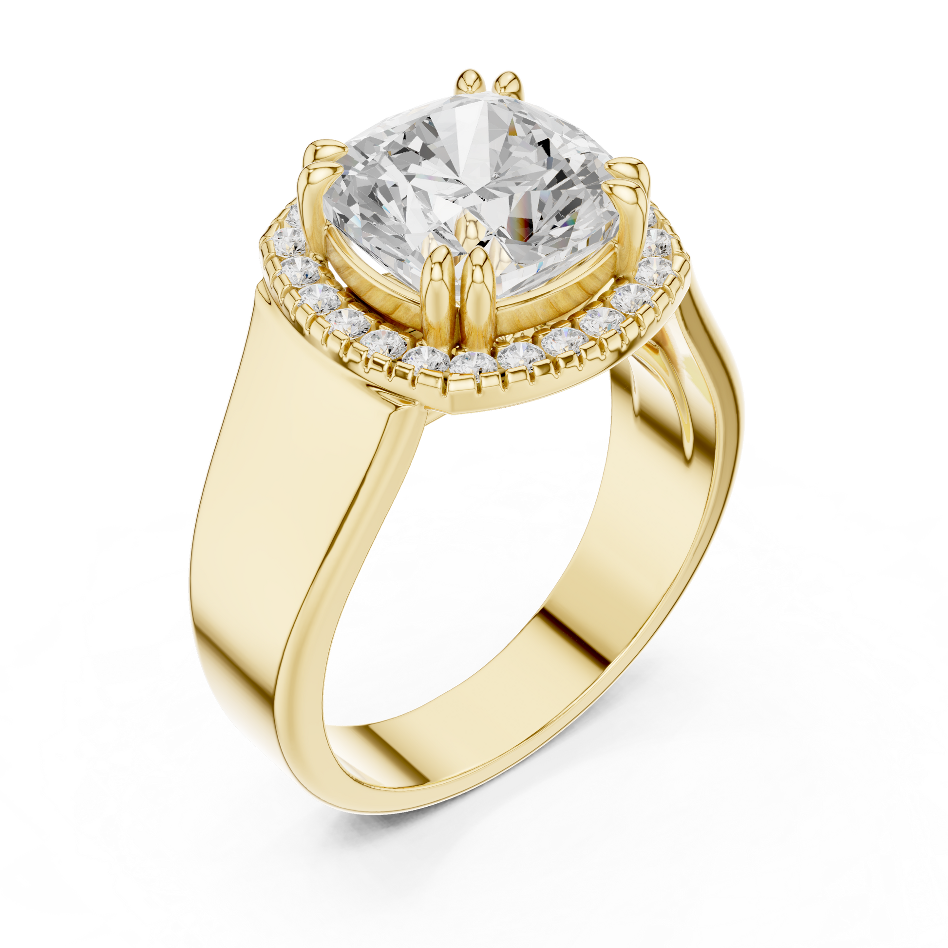 This statement-making ring features a brilliant cushion-cut center diamond framed by a sparkling halo that enhances its fire and brilliance. Set in rich yellow gold, the ring is finished with a bold, thick band that adds presence, strength, and luxury. The combination of a radiant cushion cut, shimmering halo, and smooth comfort-fit band creates a timeless yet powerful piece perfect for modern elegance and everyday glamour.
