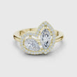 This elegant gold ring features a captivating fusion of marquise-cut and pear-cut diamonds, embraced by a shared, gracefully curved halo of pave brilliance. The interplay of the two shapes creates a fluid, romantic silhouette that feels both modern and timeless. With its sculptural form and radiant sparkle, this piece stands out as a refined statement ring—perfect for celebrating love, style, or any special moment by Ivevar.