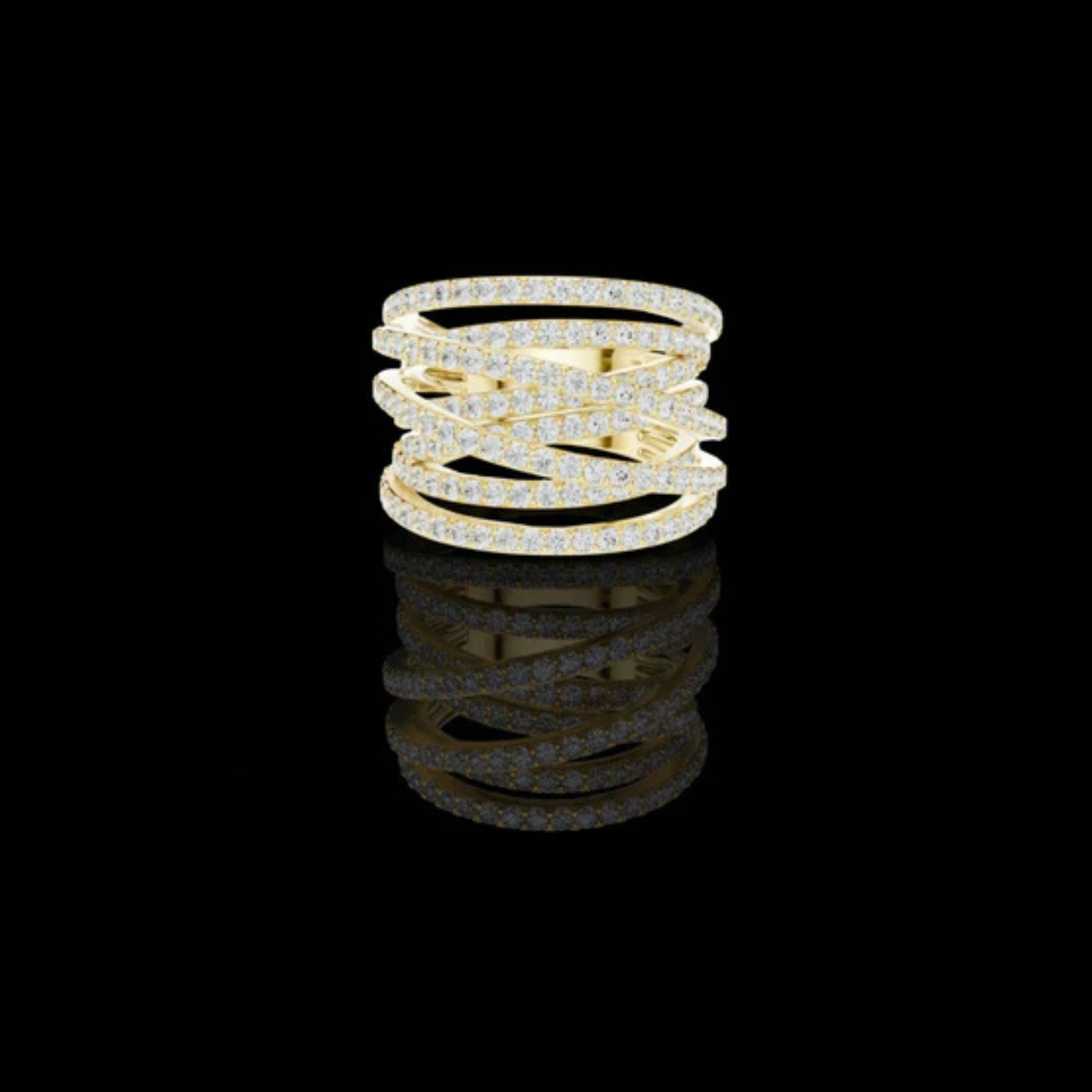 Experience the essence of modern luxury with this stunning multi-layer spiral diamond ring, masterfully crafted in gold. Each band is intricately set with brilliant-cut diamonds, creating a radiant and elegant sparkle from every angle. This statement piece showcases a bold criss-cross design, blending sophistication with contemporary charm. Perfect for women who love unique, premium, and handcrafted diamond jewelry, this ring elevates any look with its timeless elegance and luxurious shine.