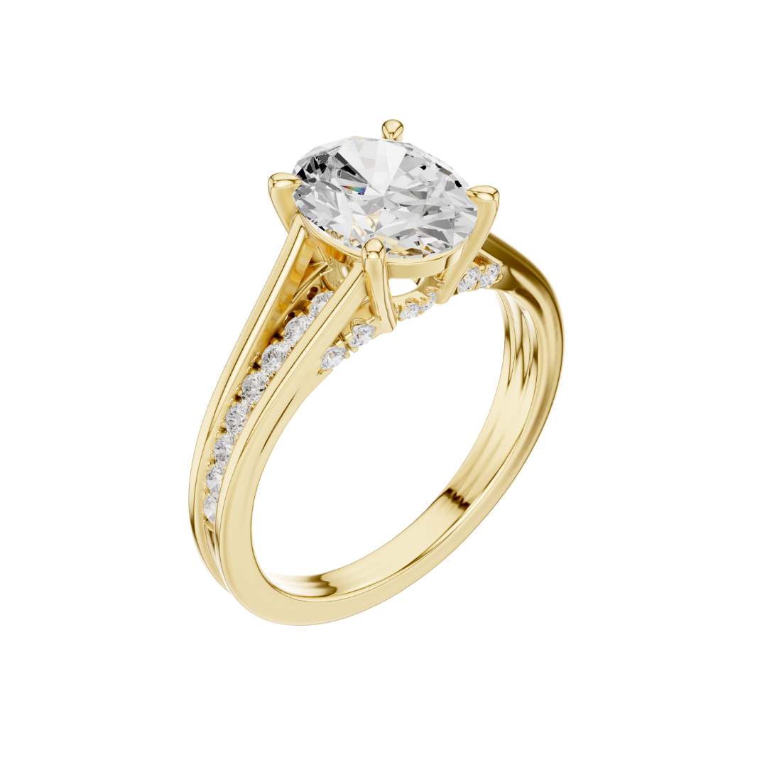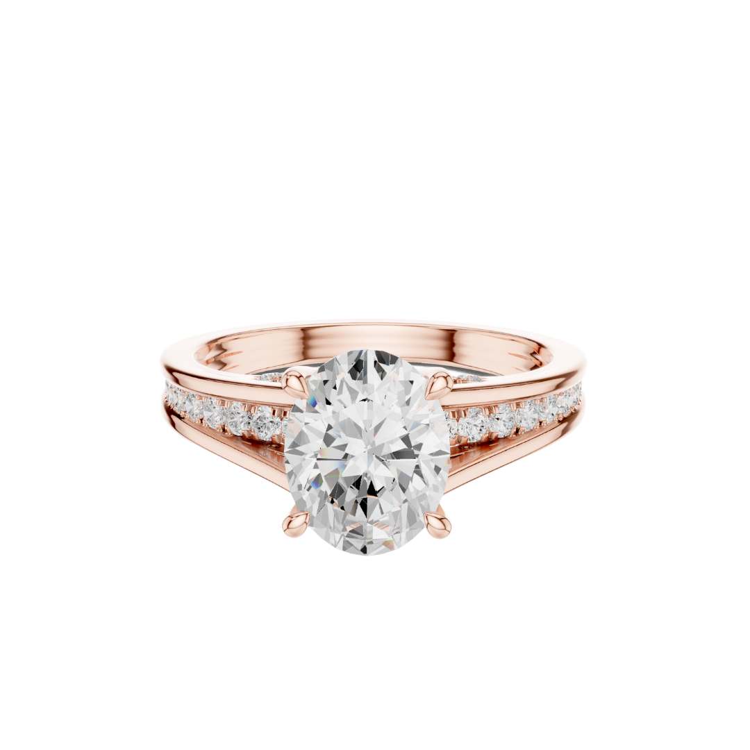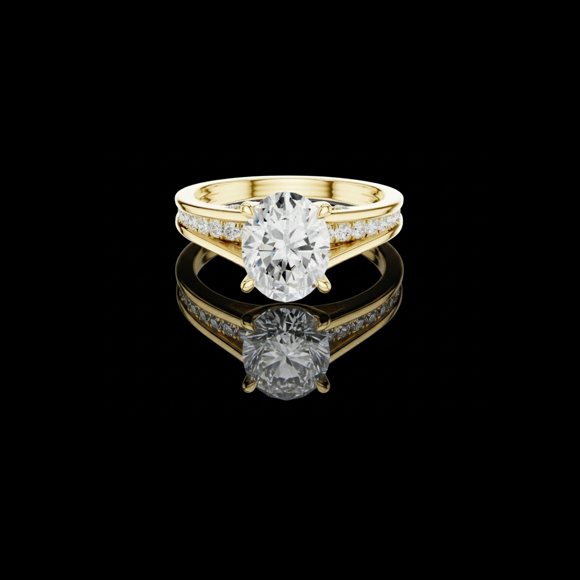 This exquisite ring features a stunning oval-cut diamond as its centerpiece, set in a graceful gold split shank band adorned with pave-set round diamonds. The elongated oval shape adds elegance and brilliance, while the split shank design enhances the ring’s visual interest and sophistication. The pave accents provide a delicate sparkle that complements the main stone beautifully, making this ring a perfect blend of classic charm and modern luxury.