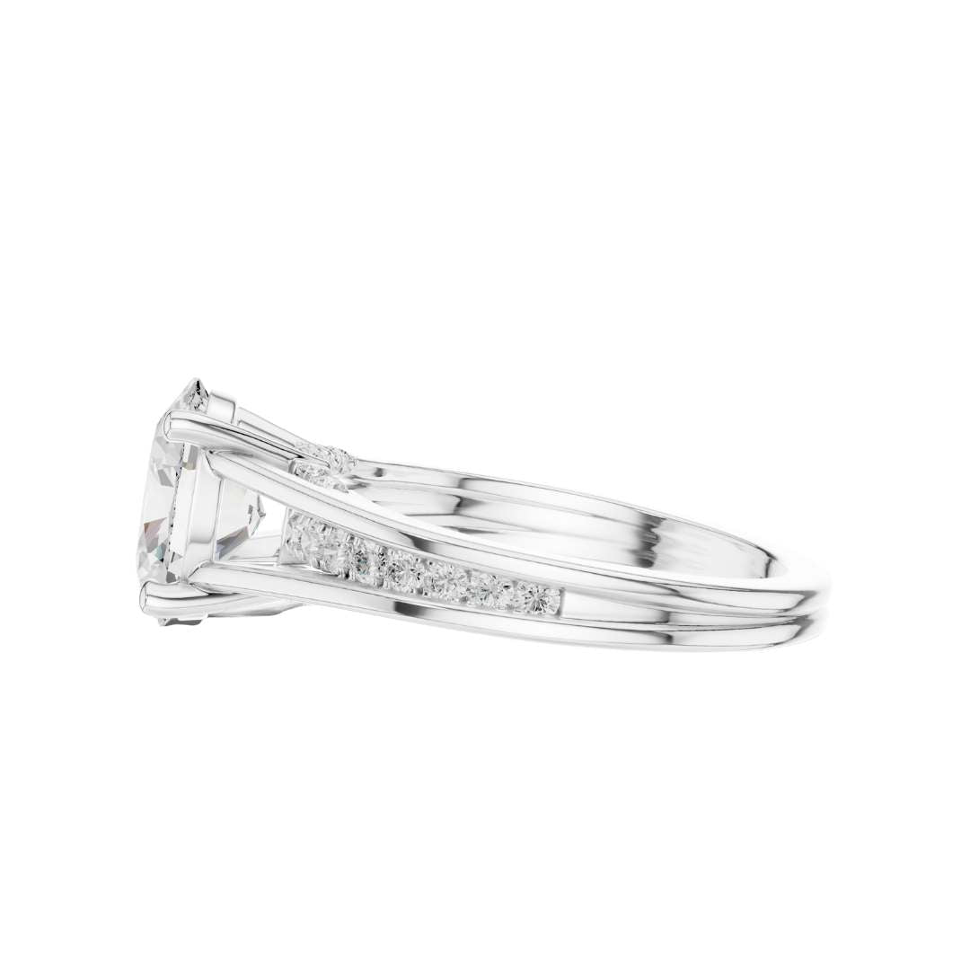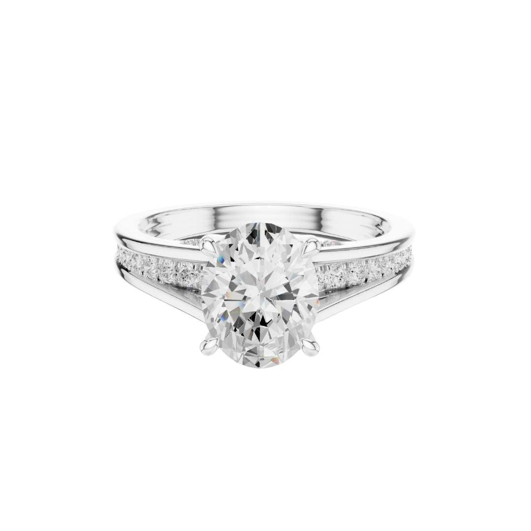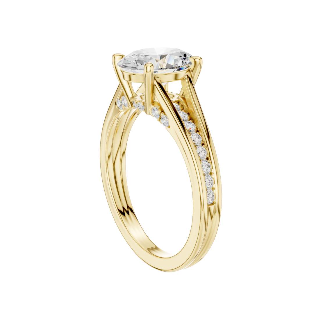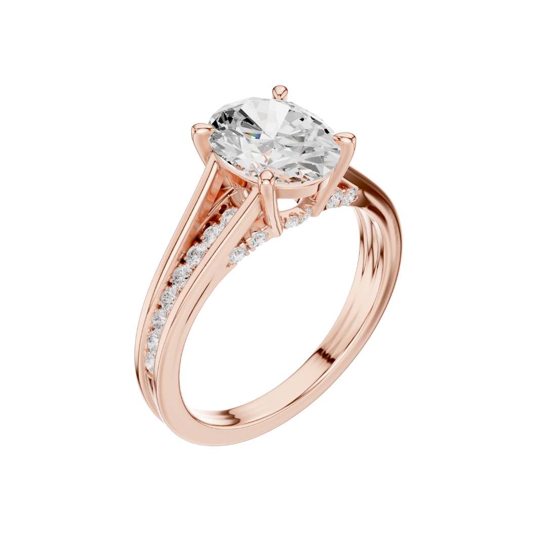 This exquisite ring features a stunning oval-cut diamond as its centerpiece, set in a graceful gold split shank band adorned with pave-set round diamonds. The elongated oval shape adds elegance and brilliance, while the split shank design enhances the ring’s visual interest and sophistication. The pave accents provide a delicate sparkle that complements the main stone beautifully, making this ring a perfect blend of classic charm and modern luxury.