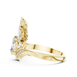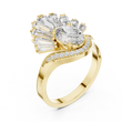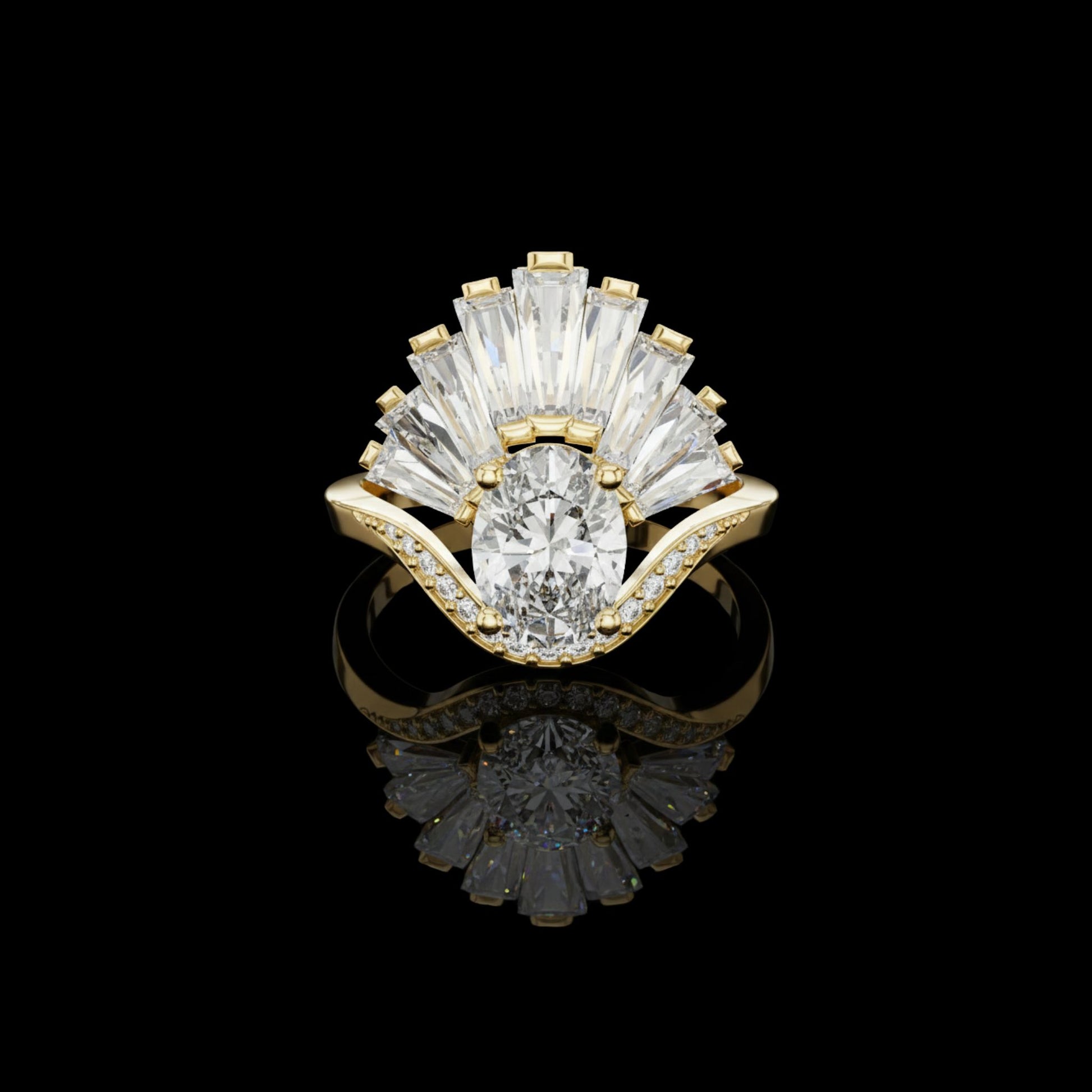 This extraordinary ring showcases a luxury oval cut diamond at the center, elevated by a stunning fan style arrangement of diamonds that create a bold, dazzling flare. Crafted in premium gold, the design features a graceful diamond-studded wave band that adds elegance and brilliance from every angle. A perfect statement piece for those who love unique, high-end, and eye-catching jewelry.