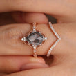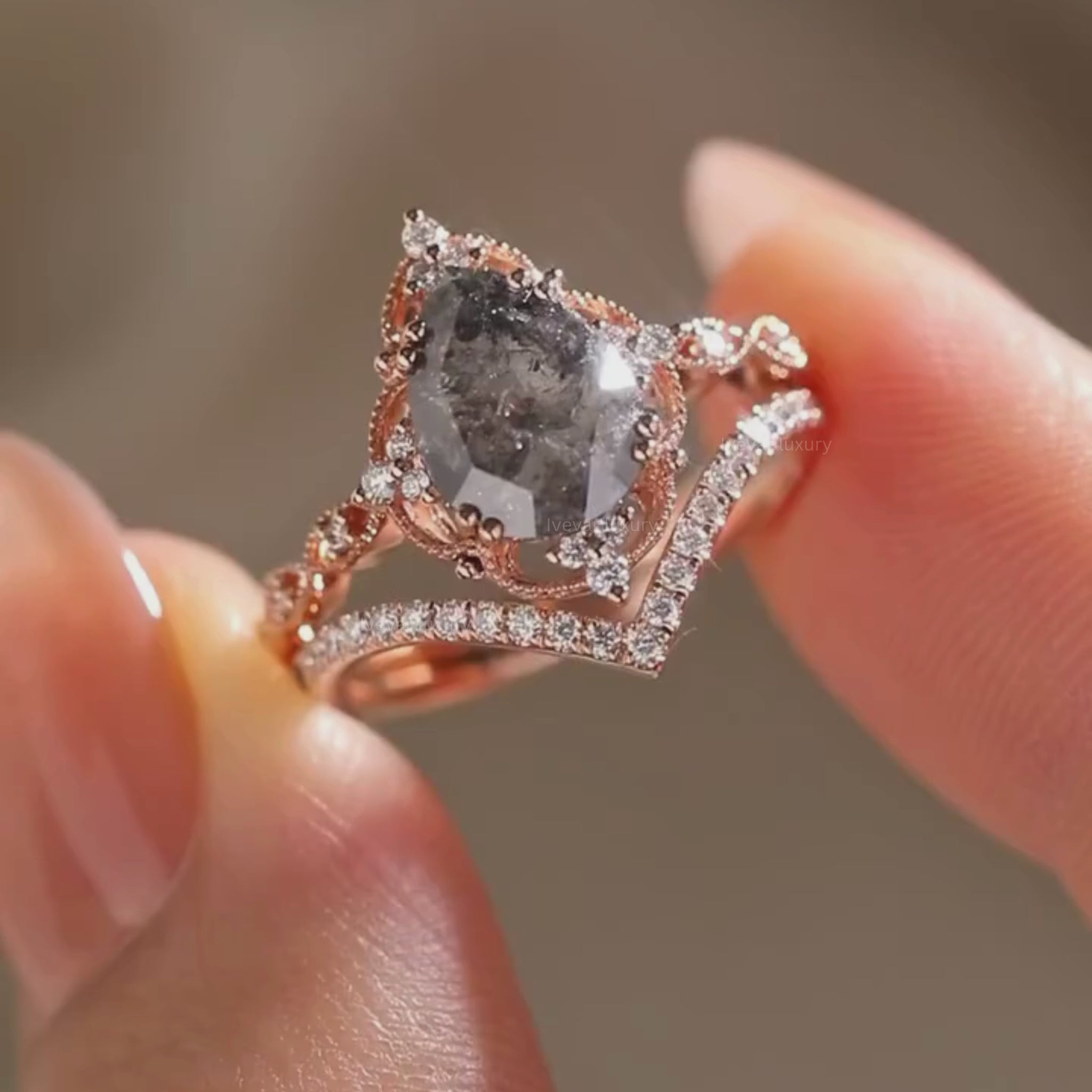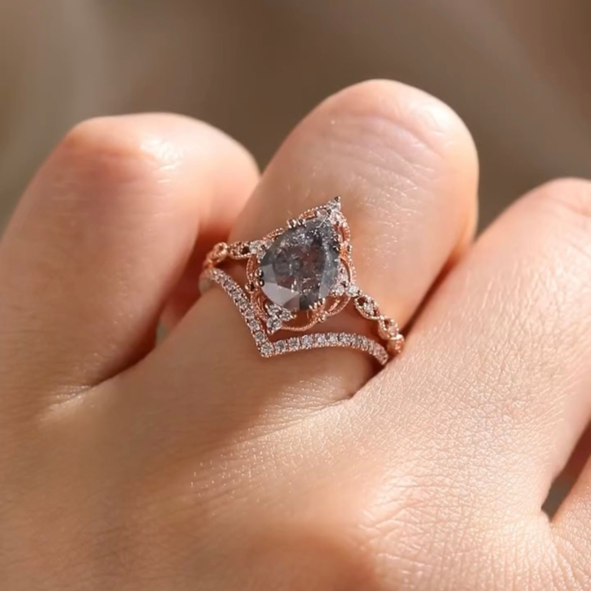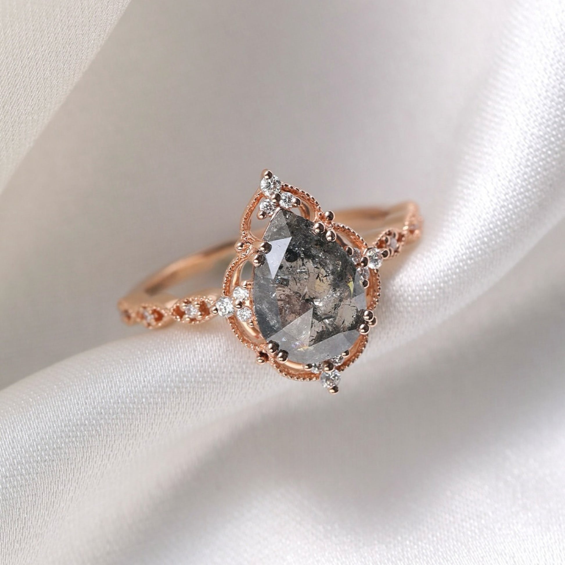 This elegant ring features a mesmerizing pear-shaped salt & pepper diamond, celebrated for its natural inclusions and one-of-a-kind character. Set in warm rose gold, the center stone is framed by a delicate vintage-style halo accented with brilliant pave diamonds, adding refined sparkle from every angle. Perfect for those who appreciate unique, non-traditional engagement rings, this piece blends antique charm with modern craftsmanship.