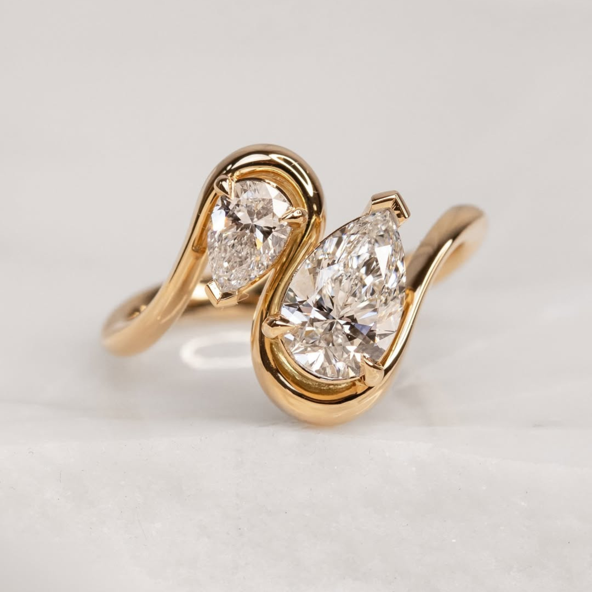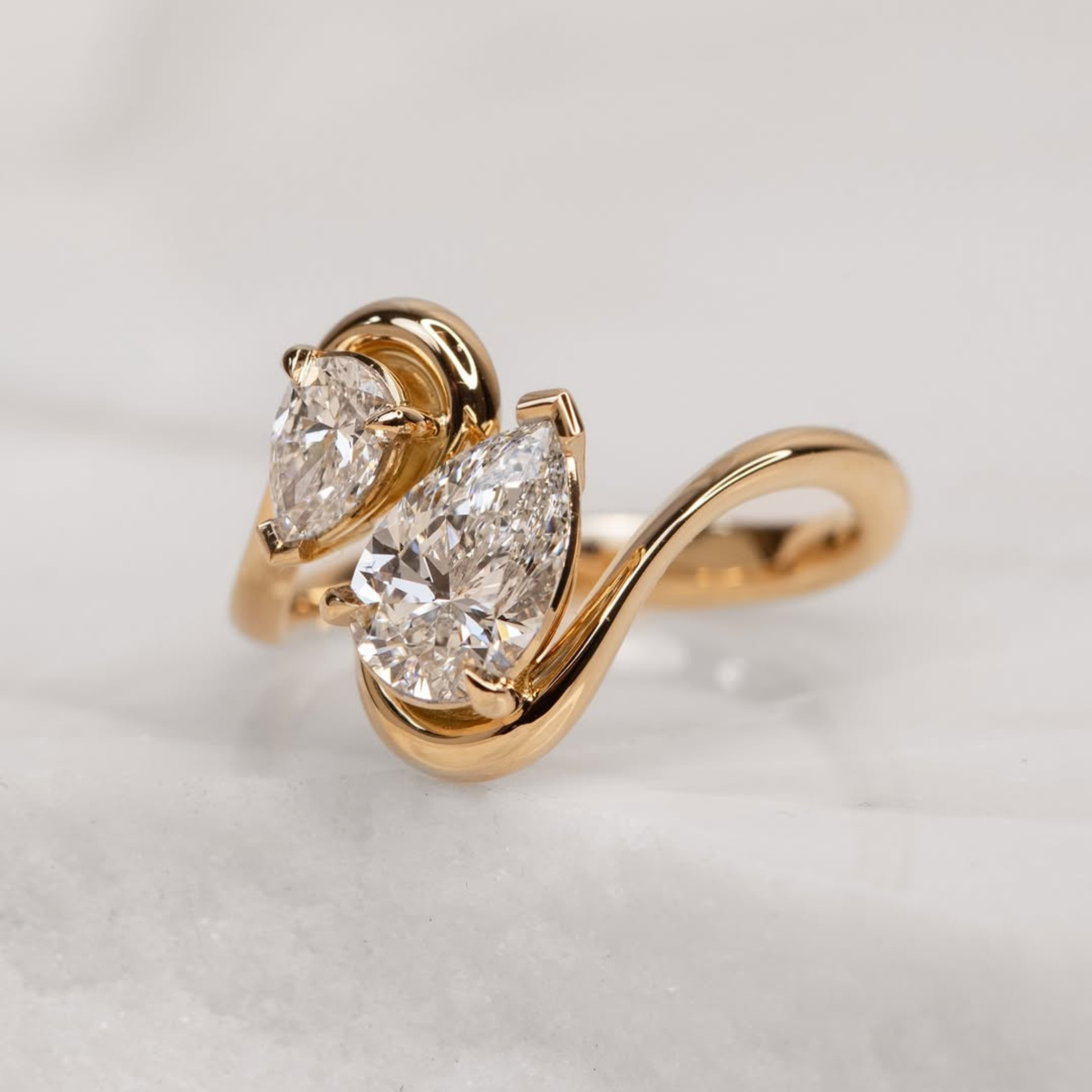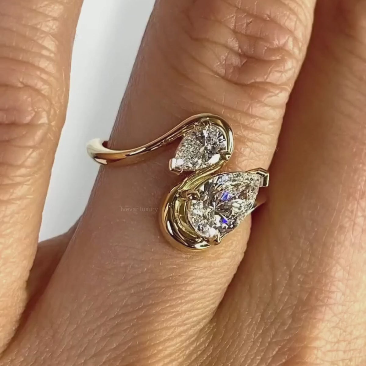 This exceptional creation from Ivevar Luxury embodies contemporary elegance with a refined Toi et Moi bypass design, featuring two exquisite pear-cut diamonds that flow together in perfect harmony. the sculptural curves gracefully embrace each diamond, creating a fluid silhouette that symbolizes unity and balance. The open, modern setting allows light to enhance the diamonds’ brilliance while maintaining a bold yet sophisticated presence.