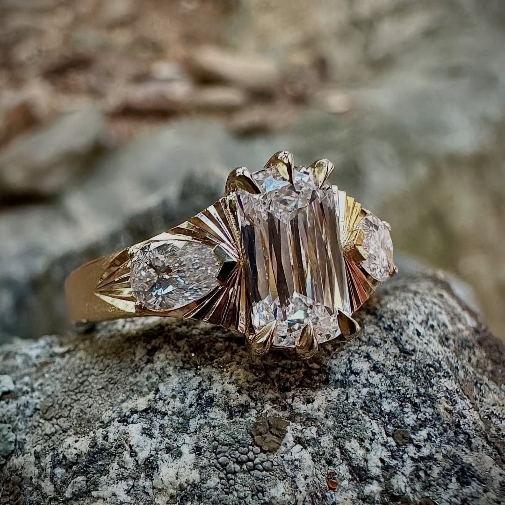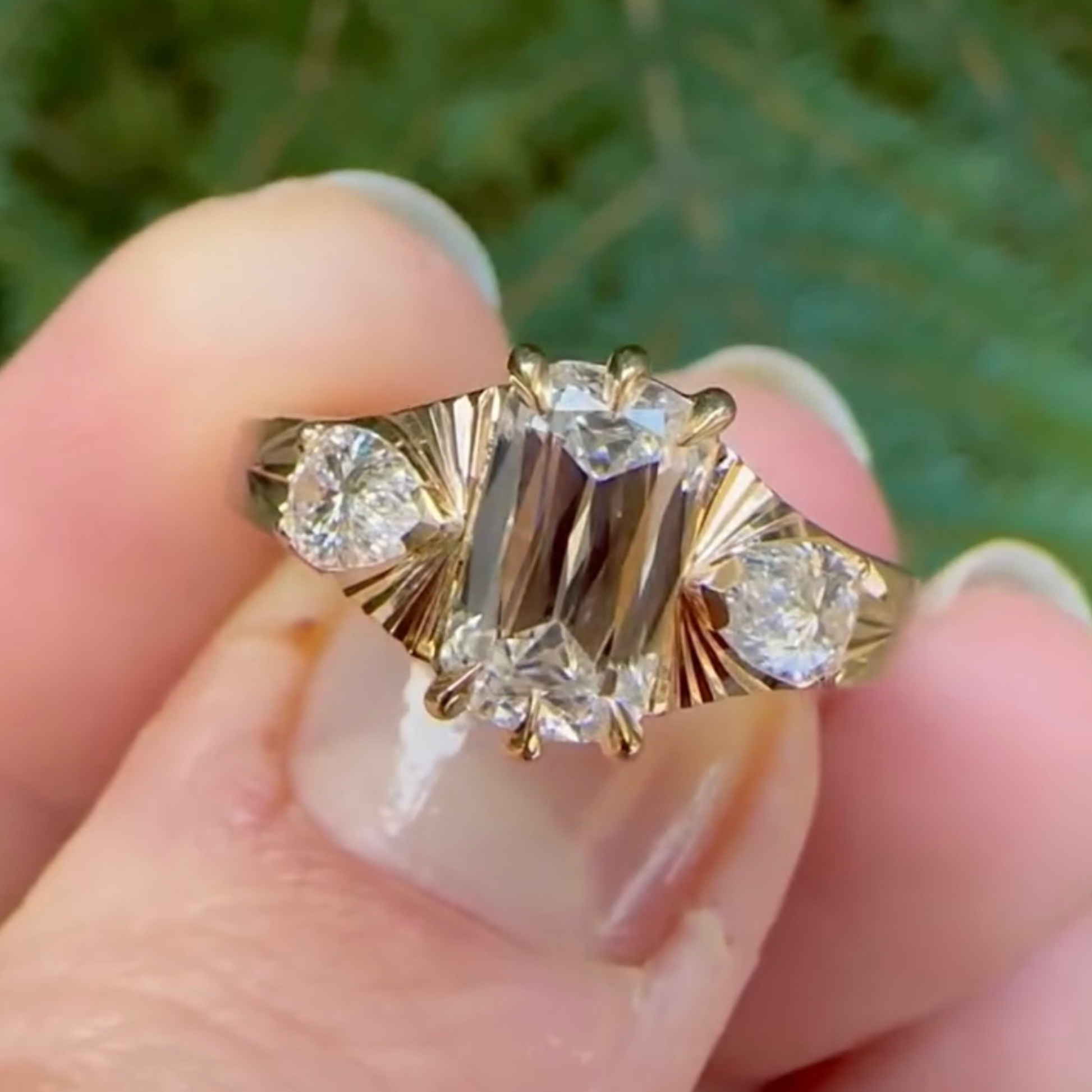At Ivevar Luxury, we believe fine jewelry should speak without words. This breathtaking ring showcases a bold emerald-cut center stone, gracefully framed by brilliant Pear side stones, creating a striking balance of modern elegance and timeless luxury. The sculpted gold band features refined fan-style detailing that enhances brilliance from every angle, making this ring an unforgettable statement piece.