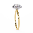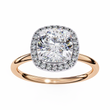 This stunning ring features a brilliant cushion-cut diamond encircled by a sparkling halo of smaller diamonds, all set atop a sleek and polished band that enhances its timeless beauty. The contrast between the radiant center stone and the delicate halo creates an enchanting display of light, clarity, and sophistication, making this piece a perfect expression of elegance, romance, and enduring luxury.