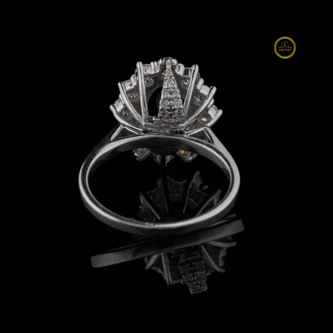This exquisite ring features a striking oval-cut at its center, radiating a deep, fancy vivid green hue. The central stone is magnificently framed by a glittering halo of brilliant round cut diamonds, creating a dramatic floral or sunburst cluster effect that maximizes sparkle and visual impact.Set in a polished silver or white gold band, this piece evokes timeless elegance, reminiscent of classic royal jewelry designs. Its sophisticated and luxurious appearance makes it an ideal statement piece, perfect for special occasions, or as a breathtaking gift.