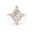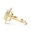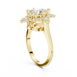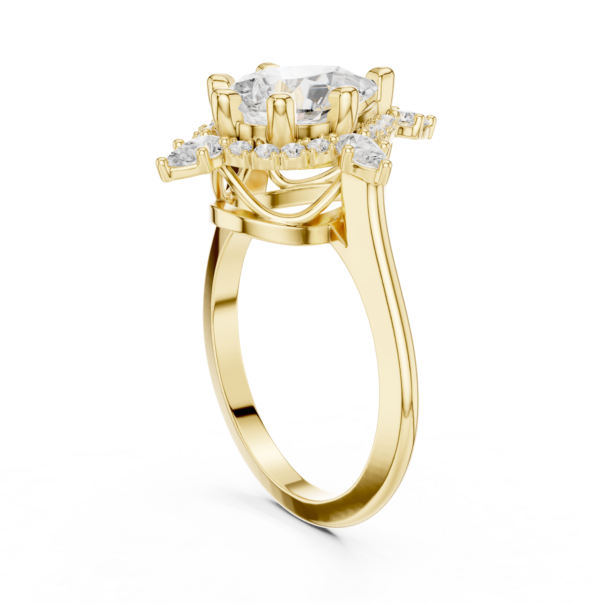 Gracefully sculpted with radiant symmetry, this pear-cut diamond ring captures elegance through its striking silhouette and refined craftsmanship. The luminous center stone is framed by pear and round accent diamonds arranged in a celestial-inspired halo, creating a balanced play of brilliance and light. Polished yellow gold prongs secure each stone with precision, while the slender band enhances the dramatic presence of the design.
