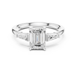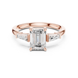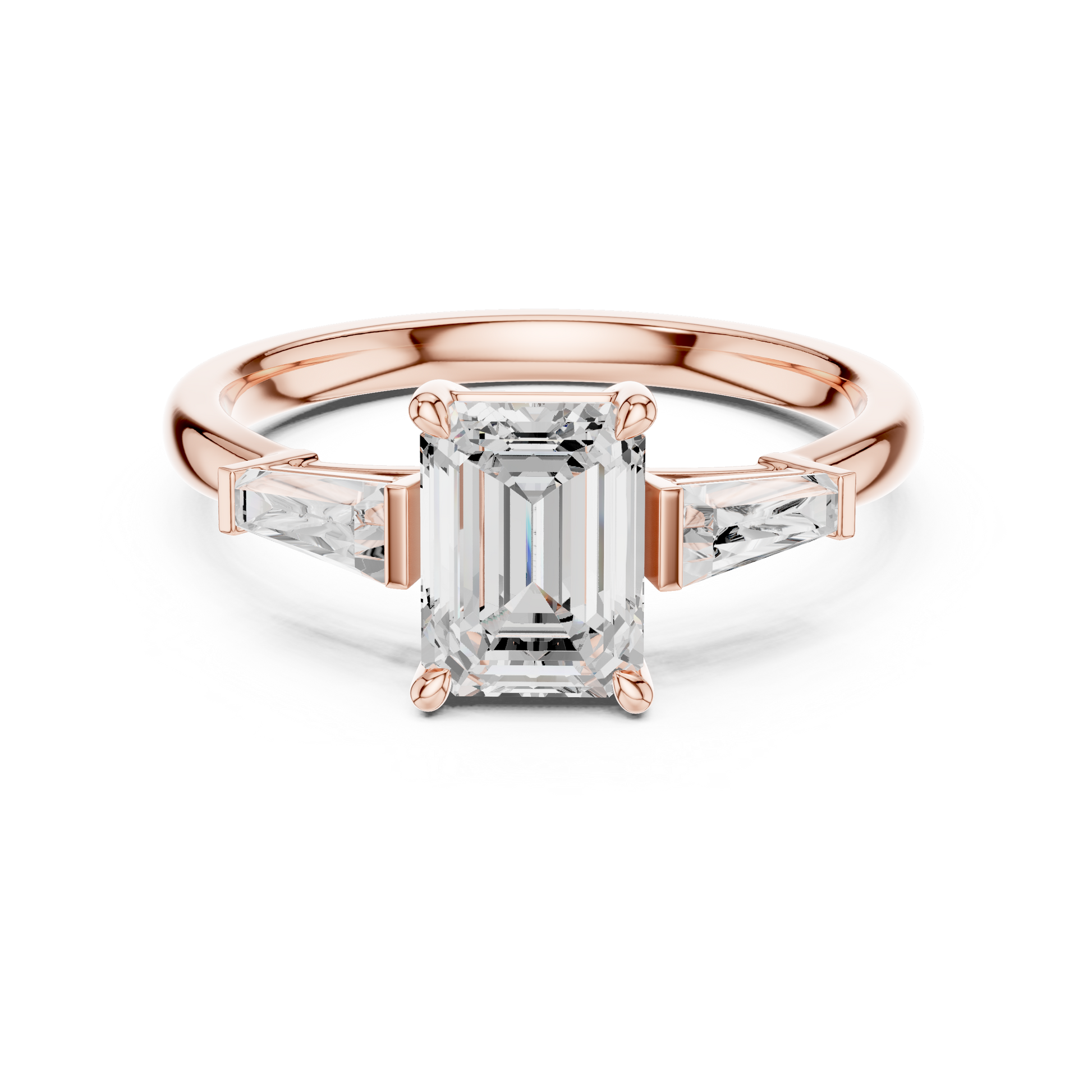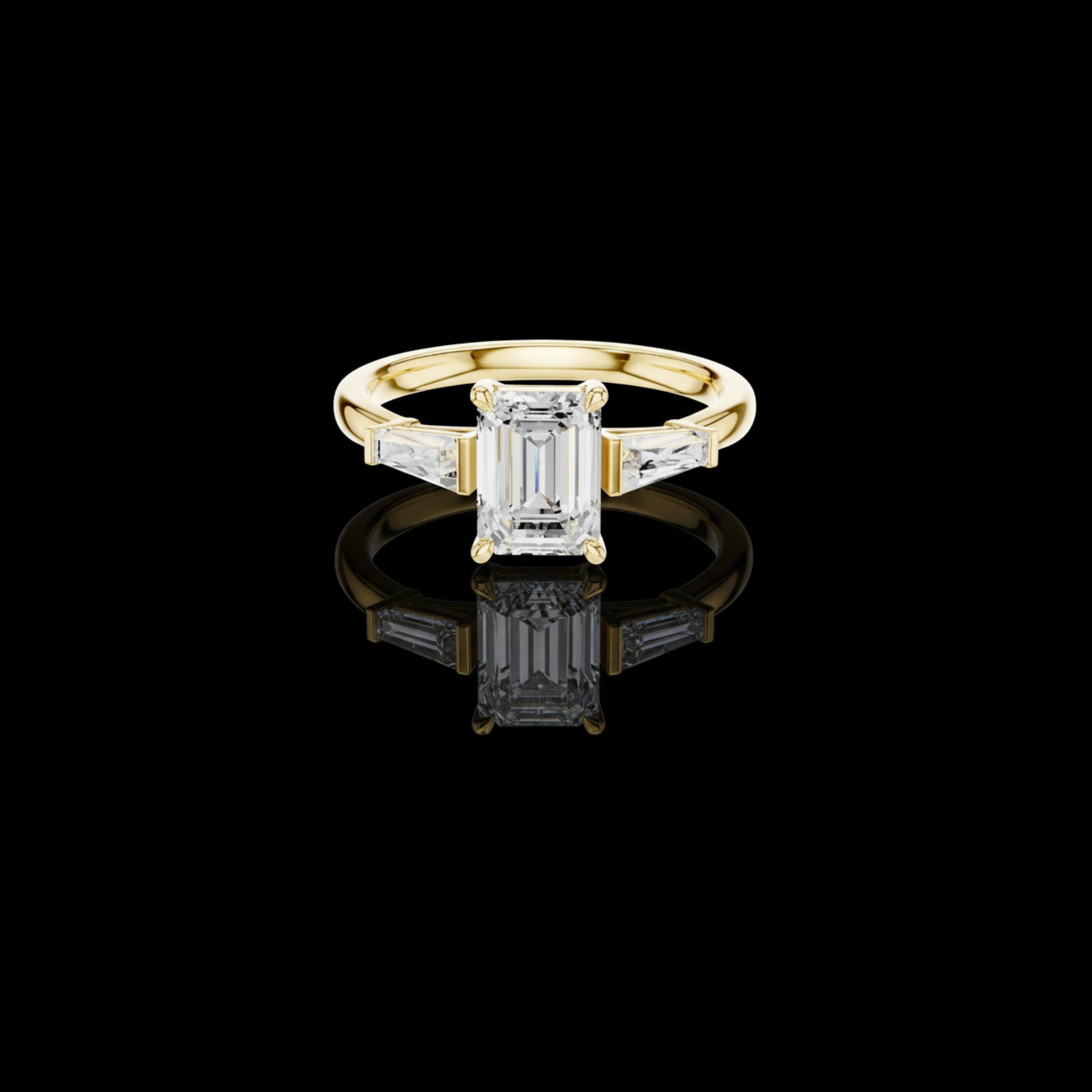 This elegant engagement ring features a captivating emerald-cut diamond at its center, admired for its clean lines and sophisticated step-cut brilliance. Flanked by two tapered baguette diamonds, the three-stone design creates a balanced silhouette that highlights the center stone’s clarity and elongated shape. Crafted in polished gold, the sleek band offers a timeless contrast that enhances the ring’s refined, architectural beauty. Classic yet striking, this ring is a meaningful symbol of past, present, and future—perfect for those drawn to understated luxury and enduring style.