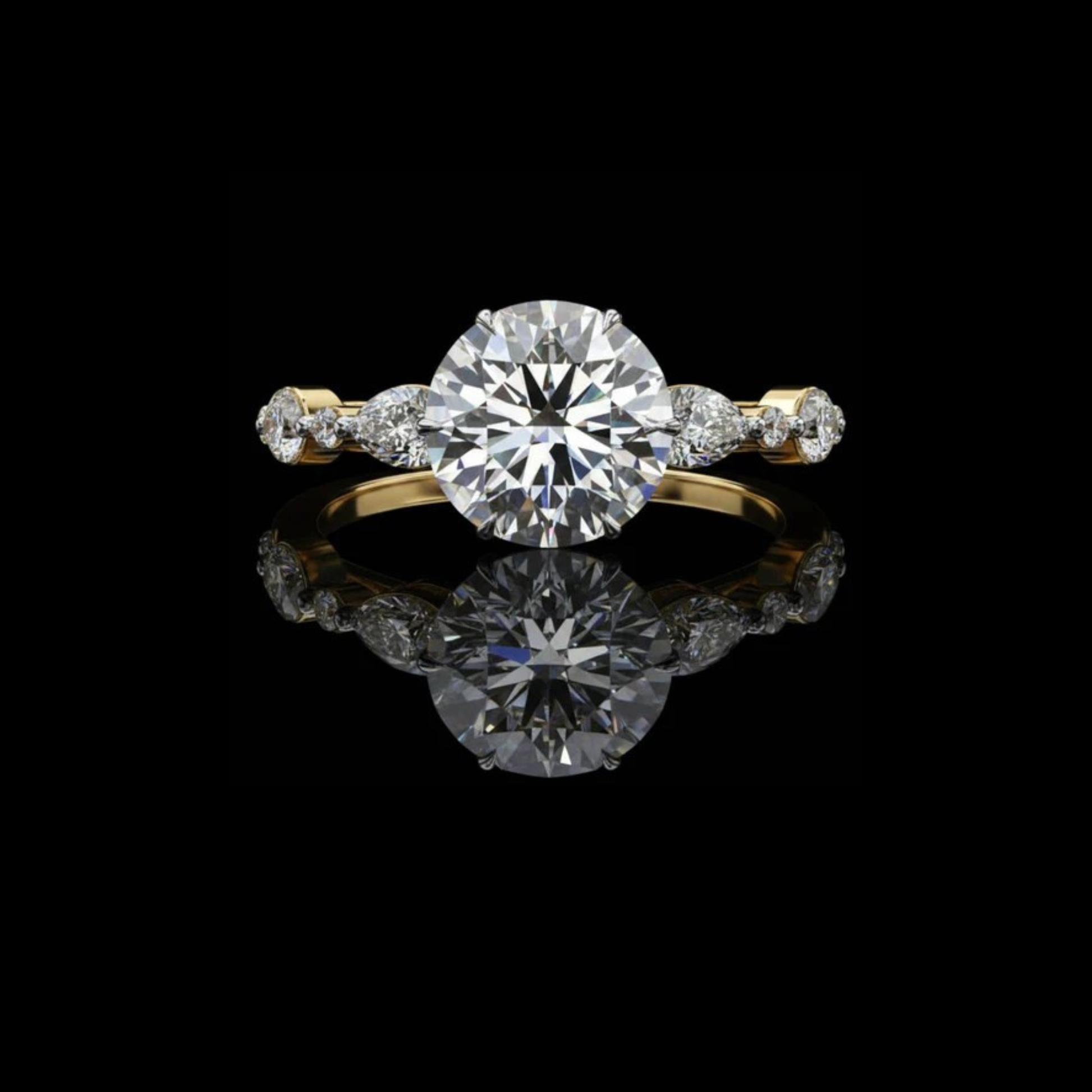 This exquisite ring showcases a brilliant round-cut center diamond set on a polished gold ring. Flanked by sparkling graduated marquise and round side diamonds, the design offers a perfect balance of brilliance and sophistication. Its timeless silhouette makes it an ideal choice for engagements or fine jewelry collections. Every detail is crafted to highlight the fire and clarity of each diamond. A timeless piece that embodies elegance, commitment, and enduring beauty from Ivevar Luxury.