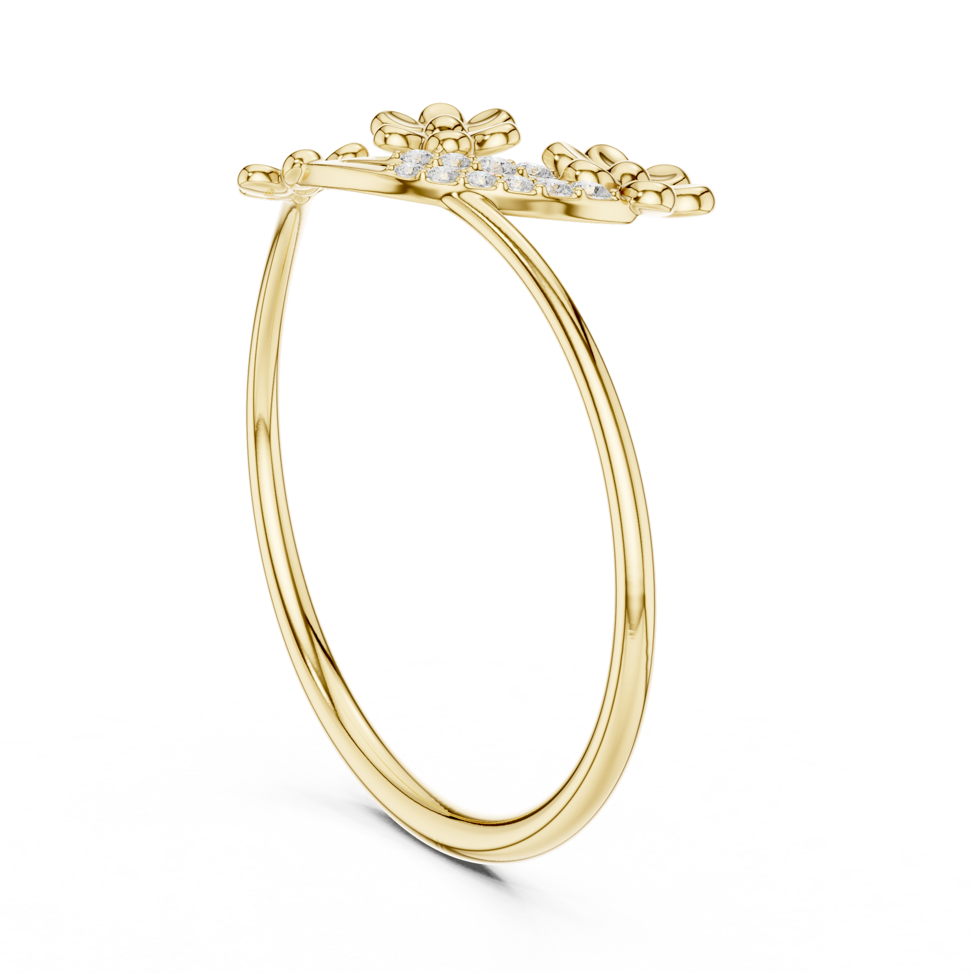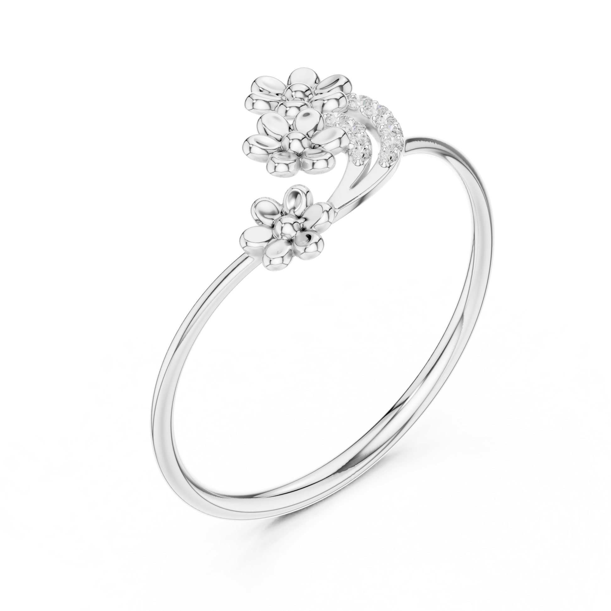 This elegant ring features three delicate flowers arranged gracefully along a sleek split band. Sparkling Round-accented curved stems connect the blossoms, adding movement and brilliance to the design. Crafted in lustrous , it captures the charm of nature with a refined, luxurious touch. Perfect for those who love feminine, floral-inspired jewelry that stands out with elegance.