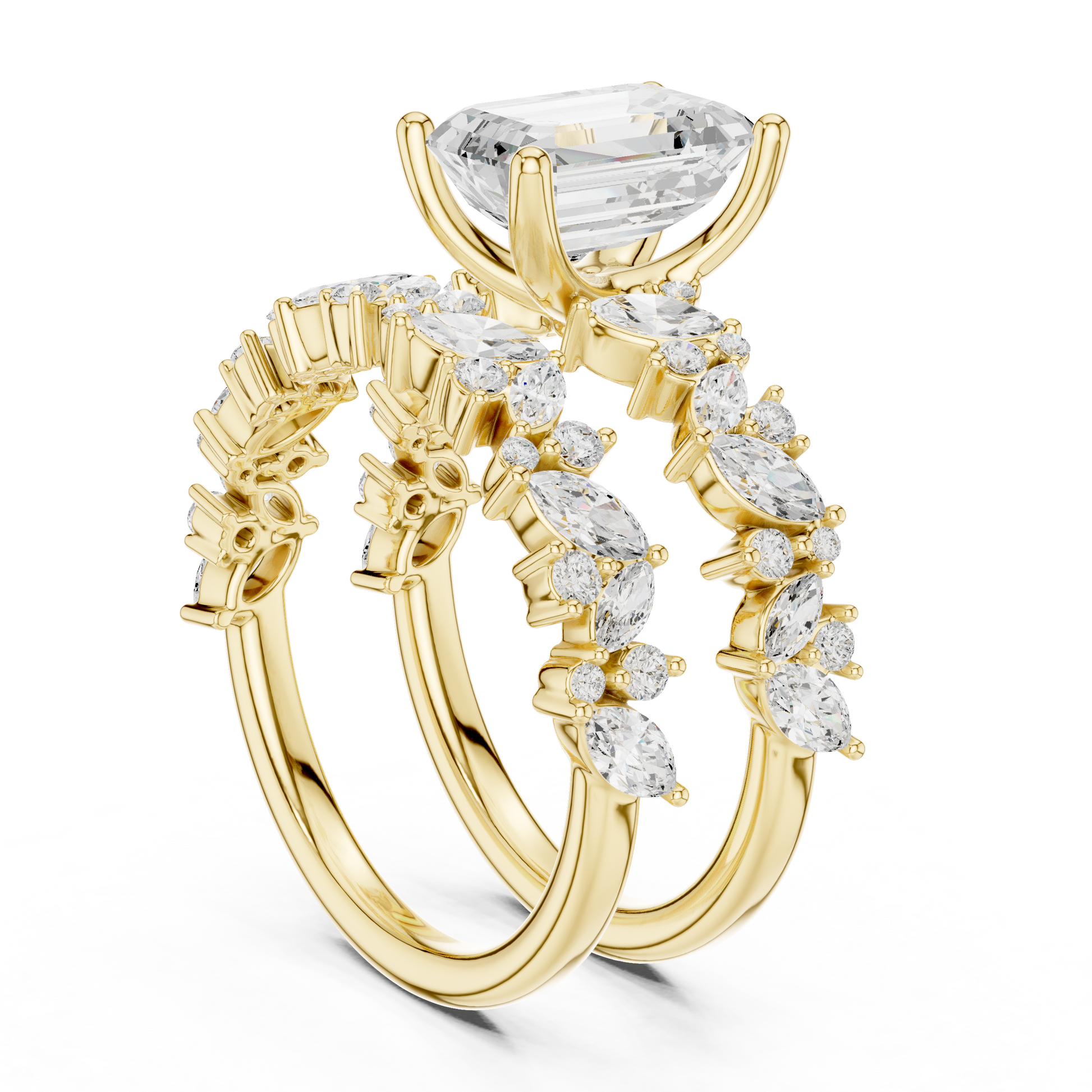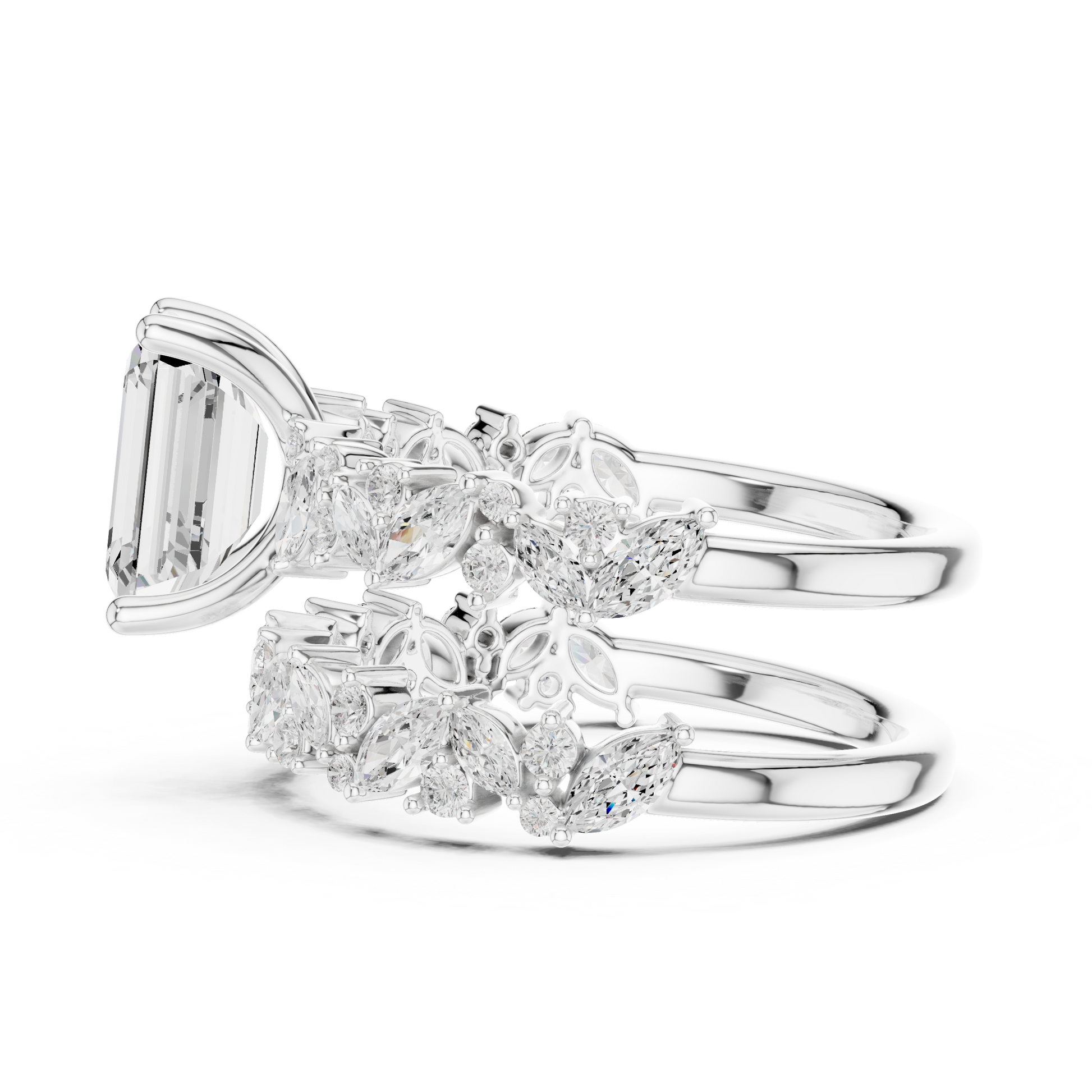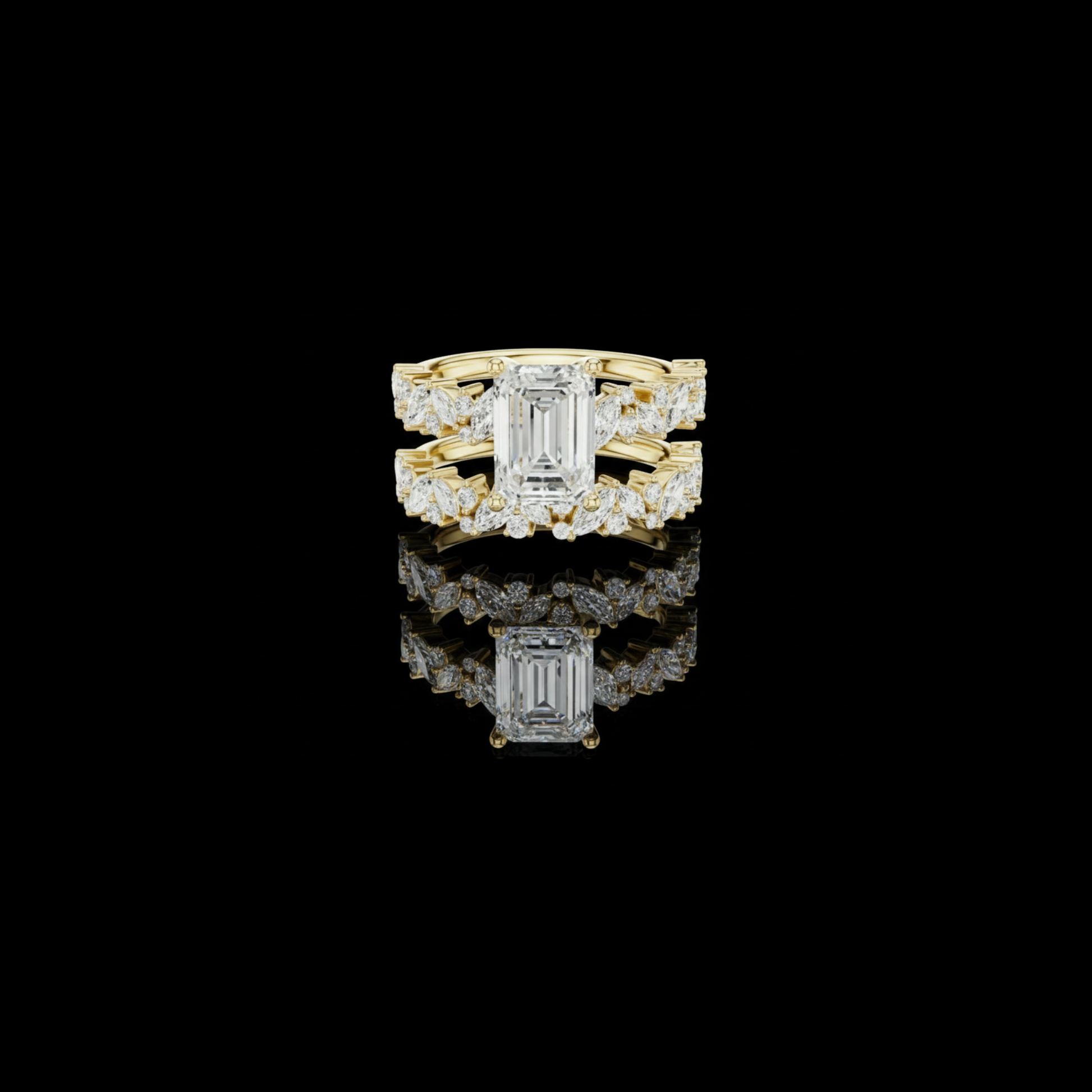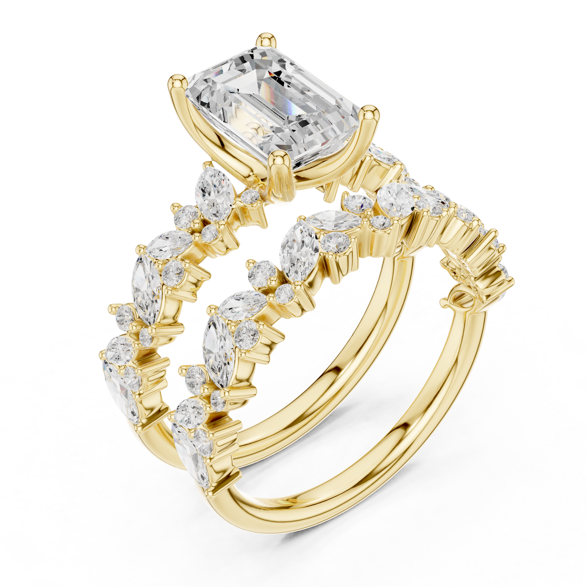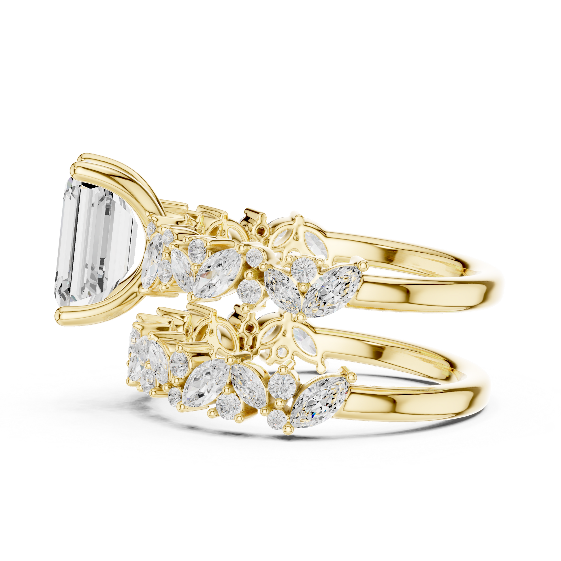 This elegant bridal set features a stunning emerald-cut center diamond secured in a refined gold setting, paired perfectly with a coordinating diamond wedding band. Marquise and round diamonds are artfully arranged along both bands, creating a graceful leaf-like pattern that adds dimension, brilliance, and timeless charm. The clean lines of the emerald cut contrast beautifully with the soft sparkle of the accent stones, resulting in a sophisticated yet romantic design. Together, the rings create a harmonious and radiant statement, ideal for celebrating enduring love and modern luxury.