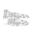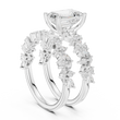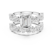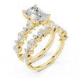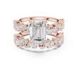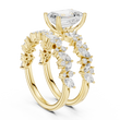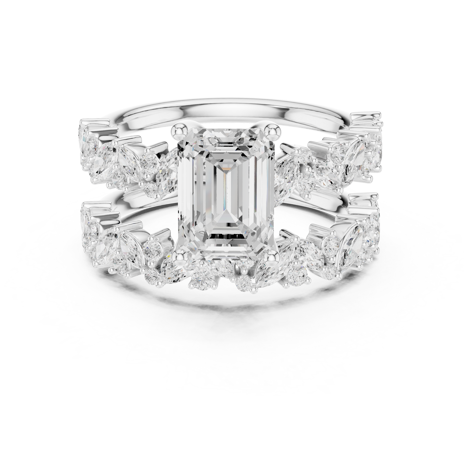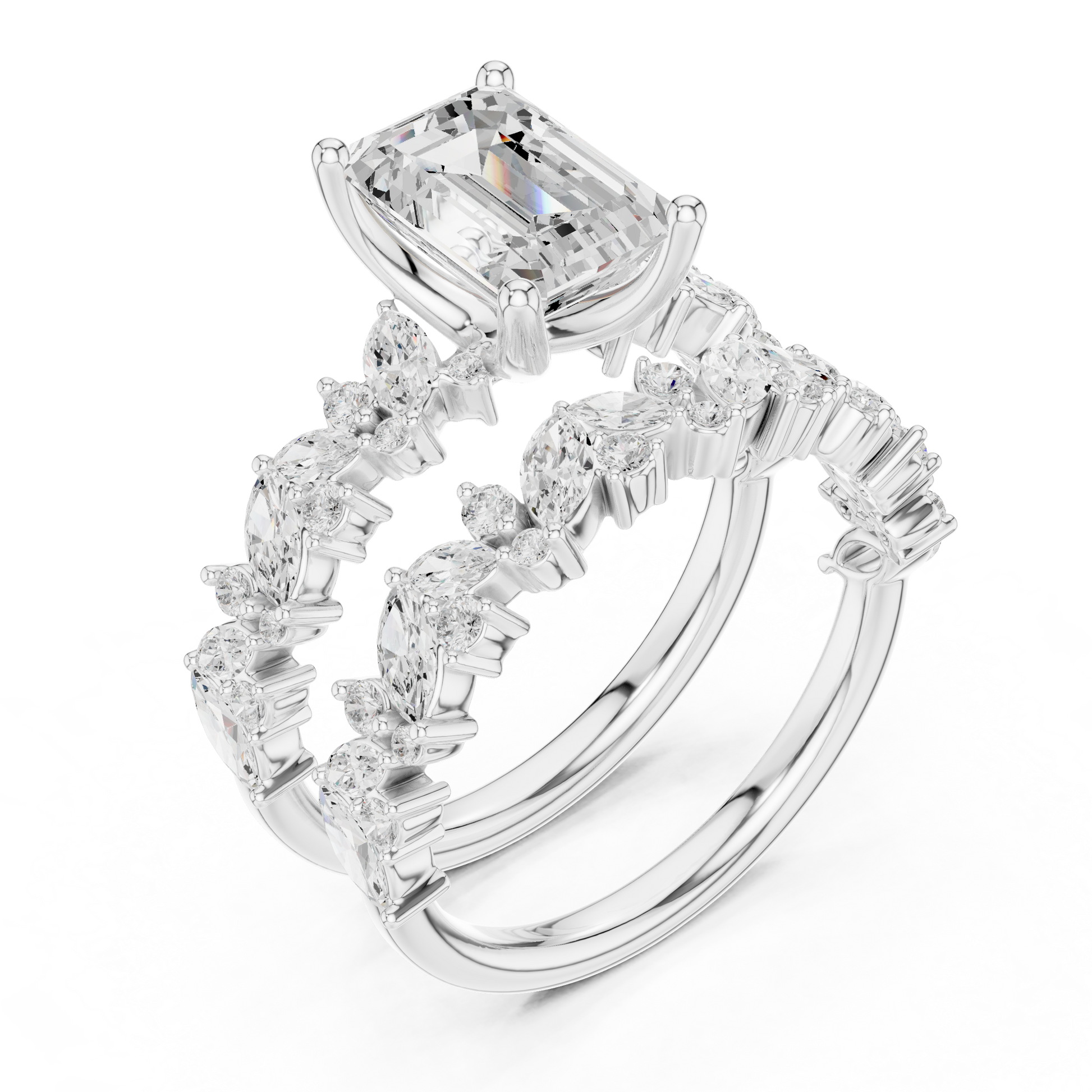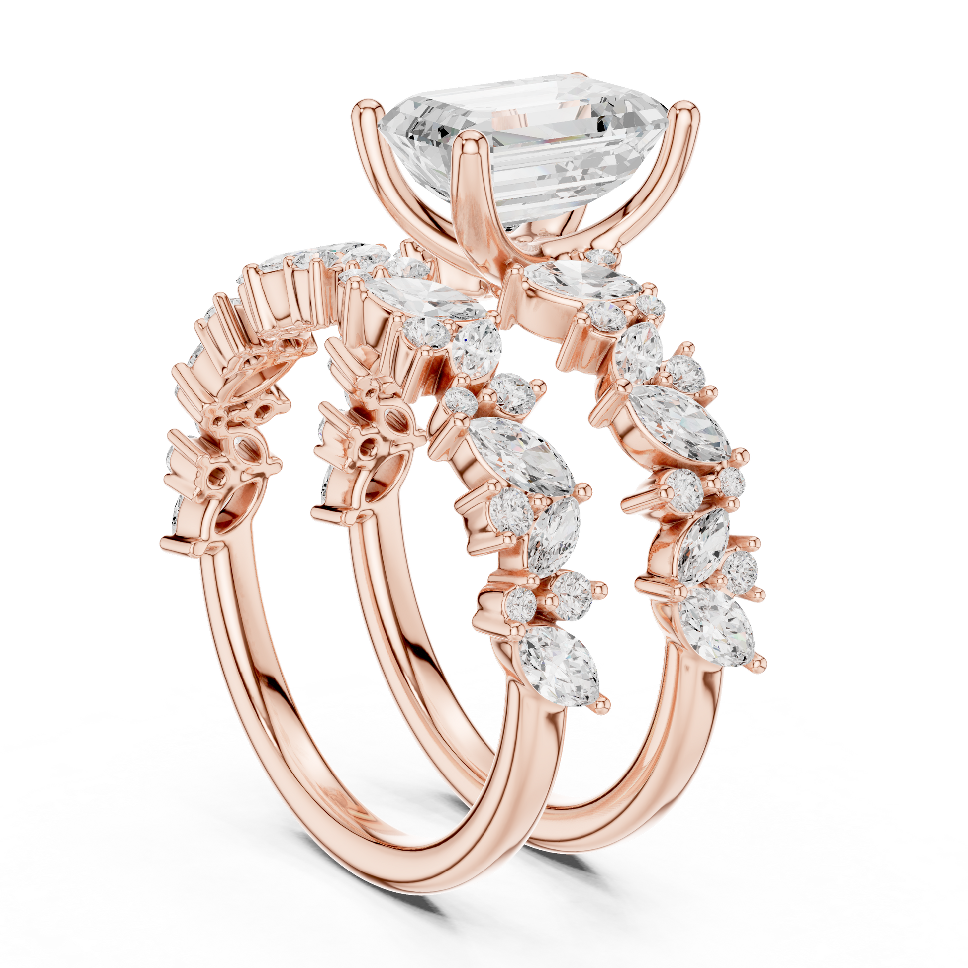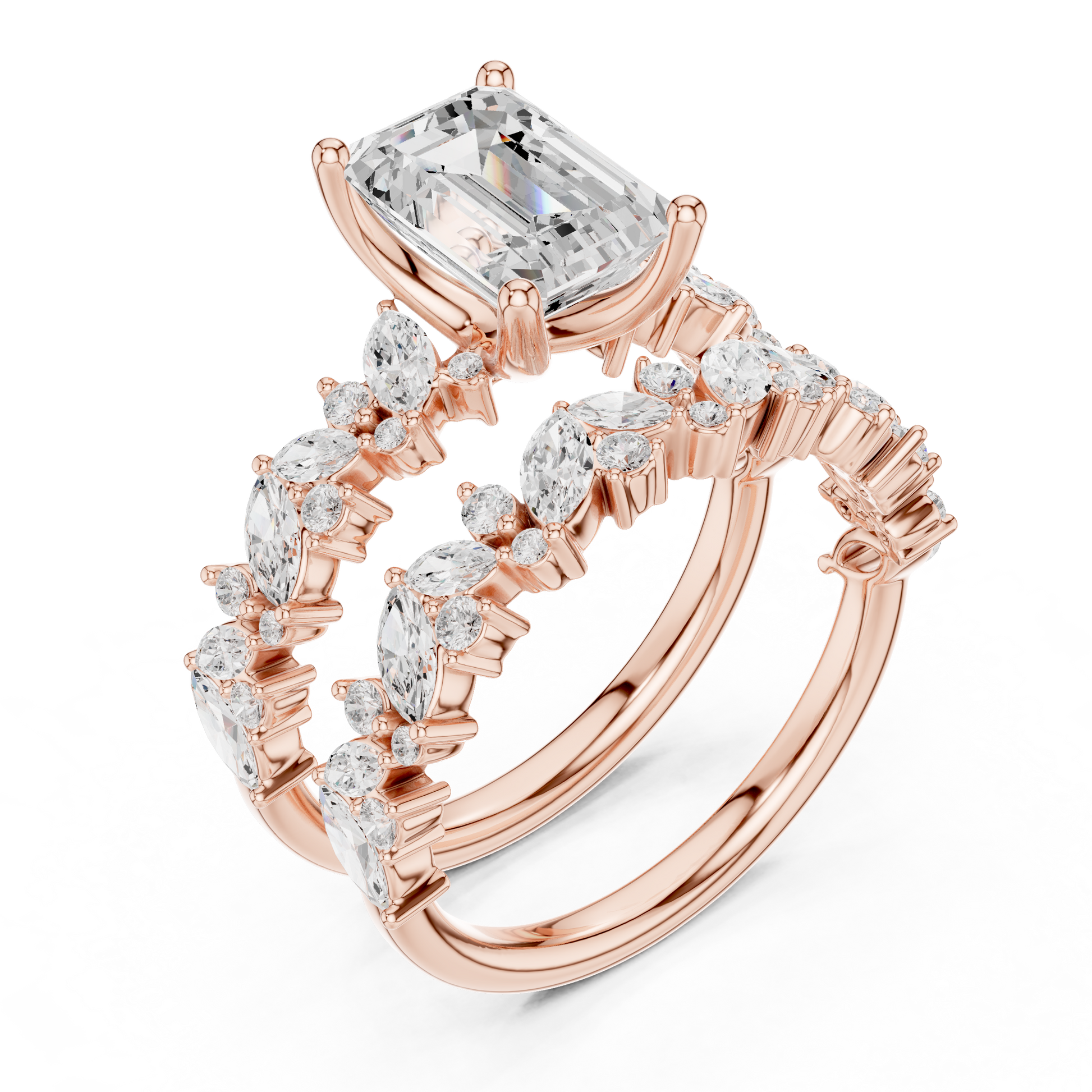 This elegant bridal set features a stunning emerald-cut center diamond secured in a refined gold setting, paired perfectly with a coordinating diamond wedding band. Marquise and round diamonds are artfully arranged along both bands, creating a graceful leaf-like pattern that adds dimension, brilliance, and timeless charm. The clean lines of the emerald cut contrast beautifully with the soft sparkle of the accent stones, resulting in a sophisticated yet romantic design. Together, the rings create a harmonious and radiant statement, ideal for celebrating enduring love and modern luxury.
