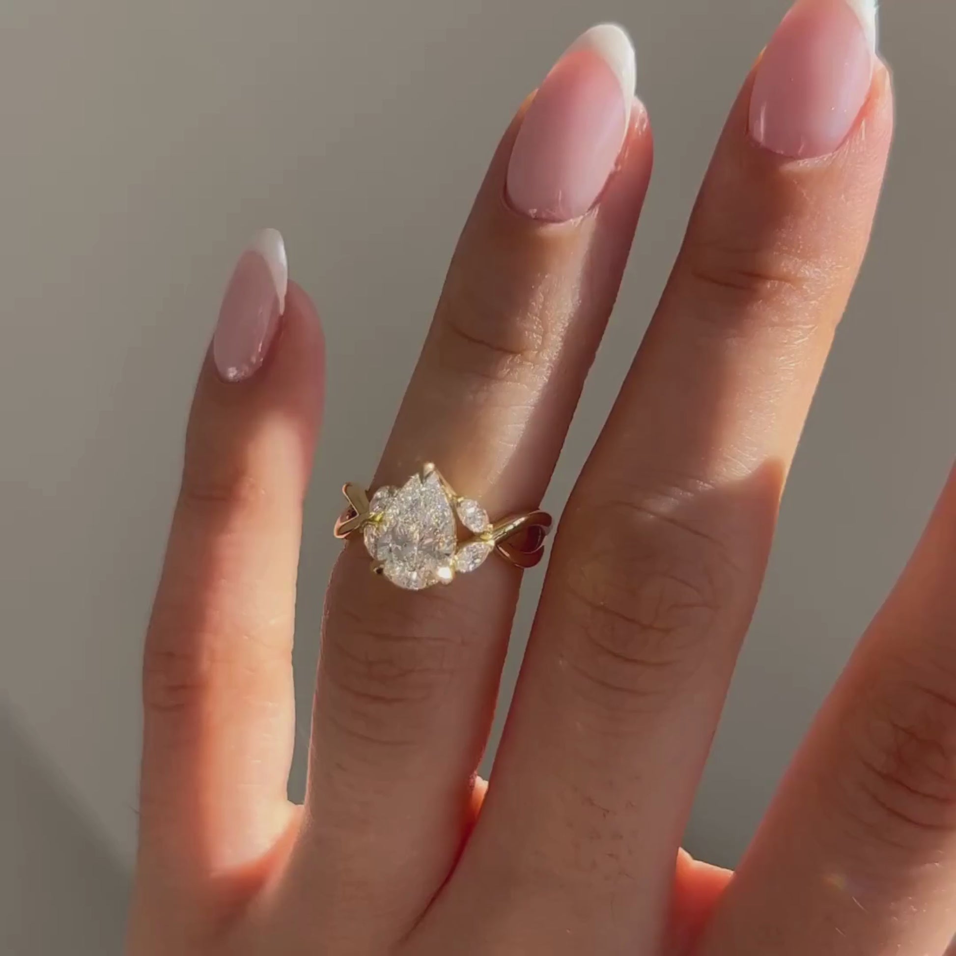 This striking oval solitaire ring showcases a radiant Pear-shaped center stone framed by subtle marquise side accent stones that enhance brilliance and depth. The sculpted gold band features elegant curves that add a bold yet refined character to the design. Balancing modern artistry with timeless elegance, this ring is crafted to stand out as a luxurious engagement or statement piece.