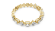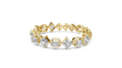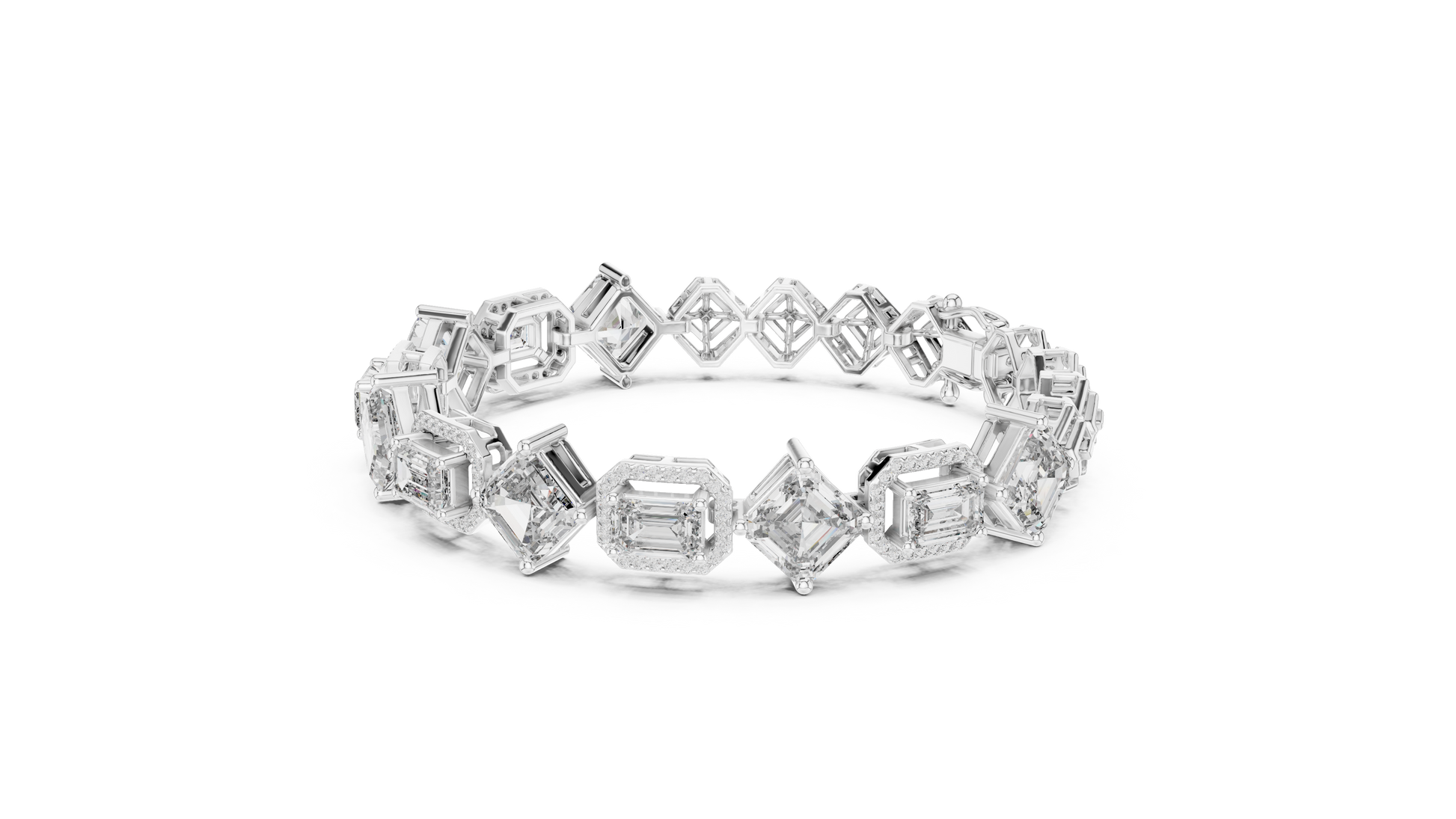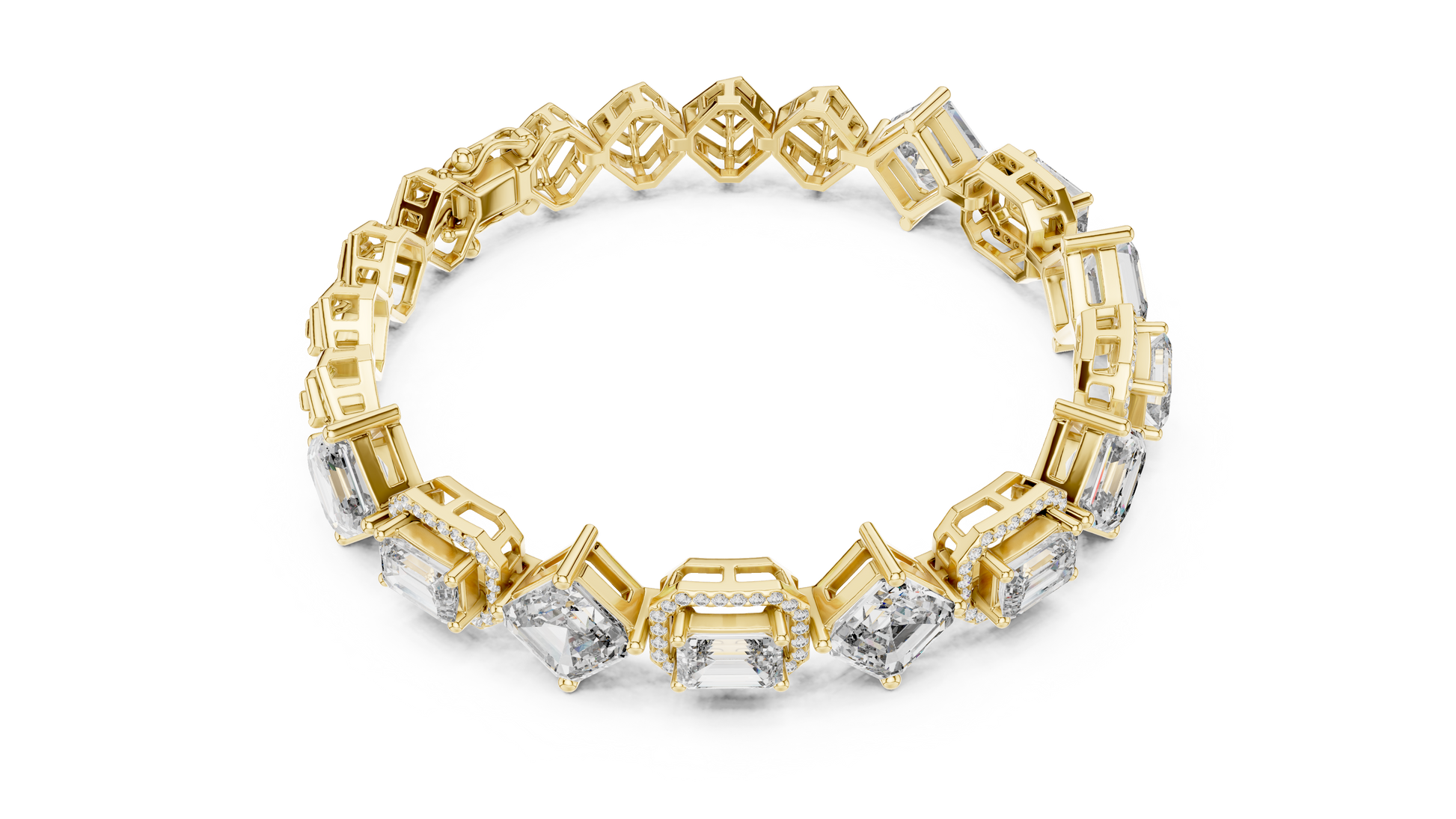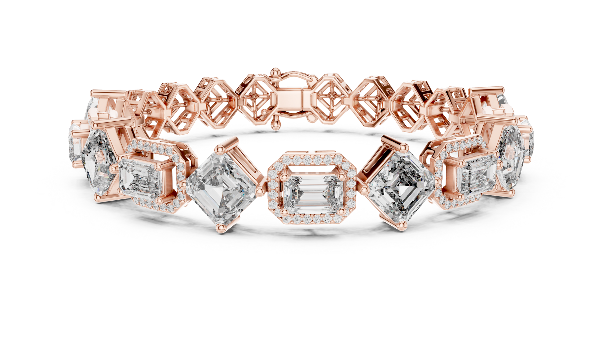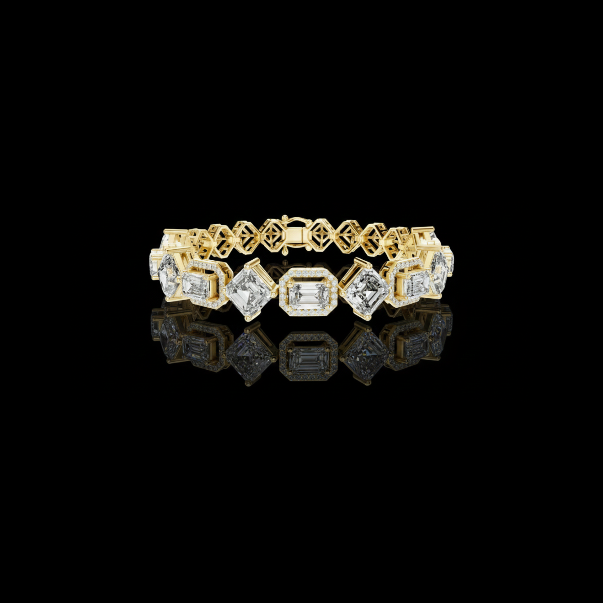 This striking bracelet features a bold geometric composition of emerald-cut diamonds, artfully alternating with angled diamond stations to create a dynamic, architectural silhouette. Each center stone is secured in polished gold, enhanced by refined diamond halos and an intricate open-gallery construction that allows light to flow through every facet. A modern statement of fine craftsmanship, this bracelet blends contemporary geometry with timeless luxury, making it a standout piece for collectors and elevated occasions alike.