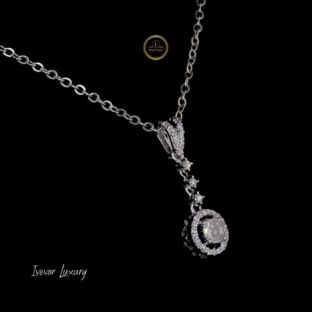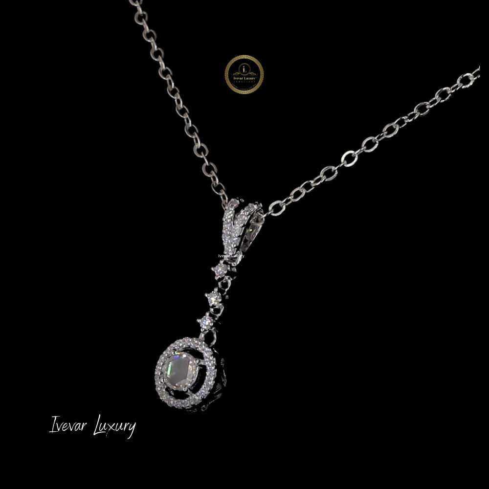 The pendant consists of a pavé-set diamond bail leading to a cascade of smaller, brilliant-cut diamonds. This cascade terminates in a prominent, circular rose-cut natural diamond set within a shimmering halo of smaller diamonds. The use of both brilliant-cut accents and the soft glow of the rose-cut center stone adds dimension and depth to the piece. It is a sophisticated, versatile necklace that is perfect for adding an elegant touch to both formal and everyday attire.