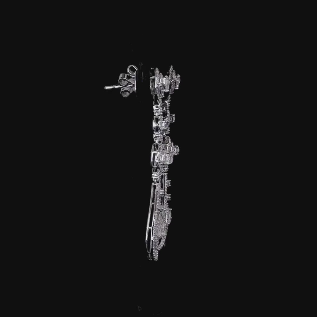 This magnificent pair of long drop earrings is crafted in 14K gold (appearing as white gold). They feature an elegant, articulated design that maximizes movement and brilliance.