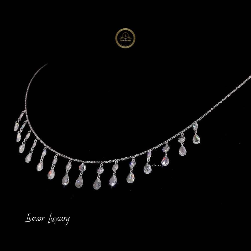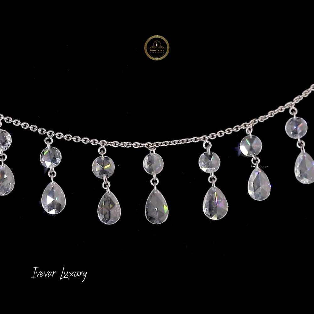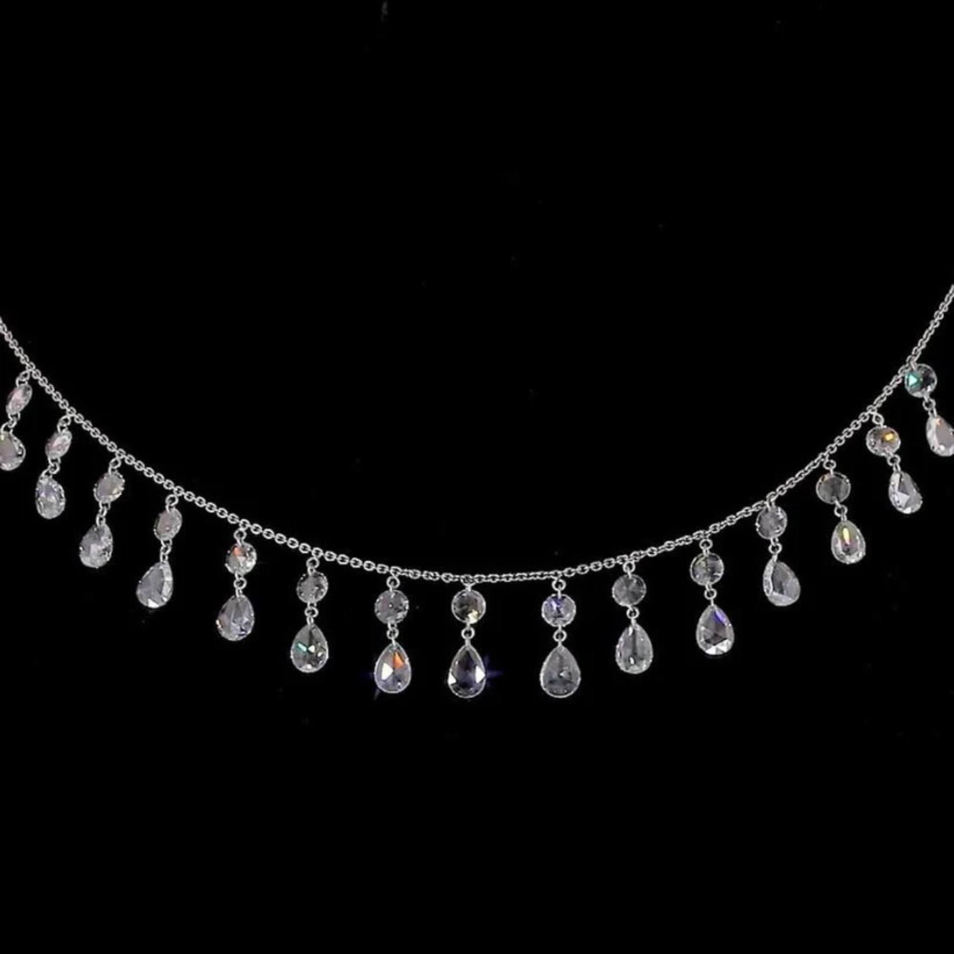 The design consists of a delicate chain from which multiple pear-shaped and teardrop rose-cut diamonds are suspended at varying lengths, creating a waterfall or fringe effect. Each diamond drop is set to maximize movement and catch the light, offering a gentle, shimmering brilliance characteristic of the rose cut. This exquisite piece is a dramatic statement, perfectly suited to be worn as a choker or collar, adding timeless luxury and an opulent, sparkling accent to an evening gown.
