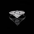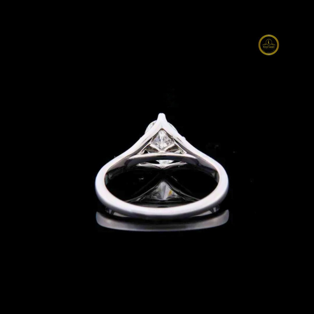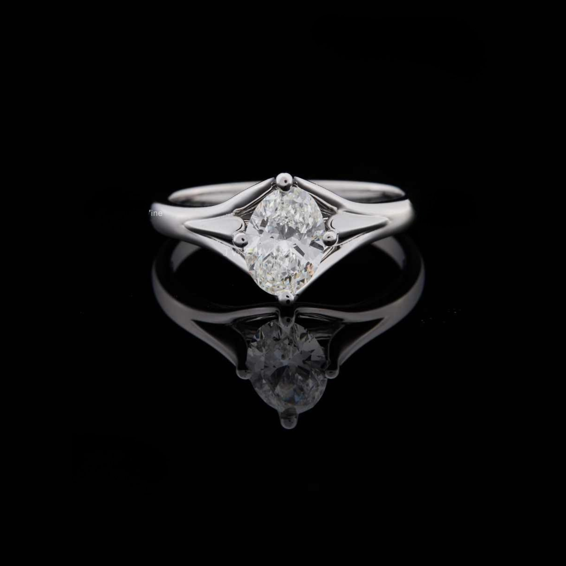 This stunning solitaire ring features a captivating Oval-cut diamond set securely within a sleek, polished band. The unique setting style elegantly frames the elongated diamond, emphasizing its brilliant sparkle and sophisticated shape.The metal band, possibly white gold or platinum, has a modern design with subtle, stylized shoulders that draw the eye toward the central stone. This piece is a perfect blend of classic elegance and contemporary flair, making it an ideal choice for an engagement ring or a timeless statement accessory by Ivevar.