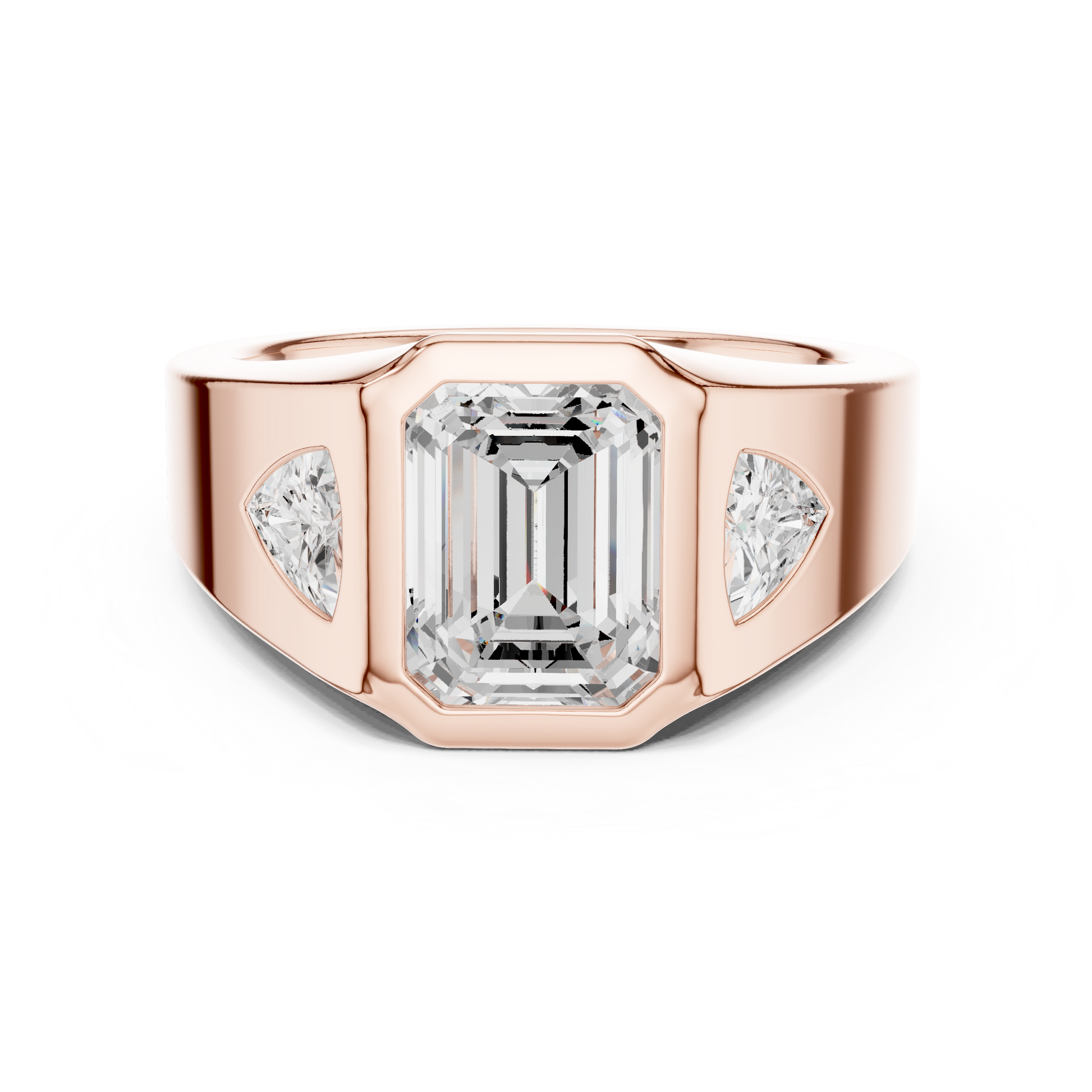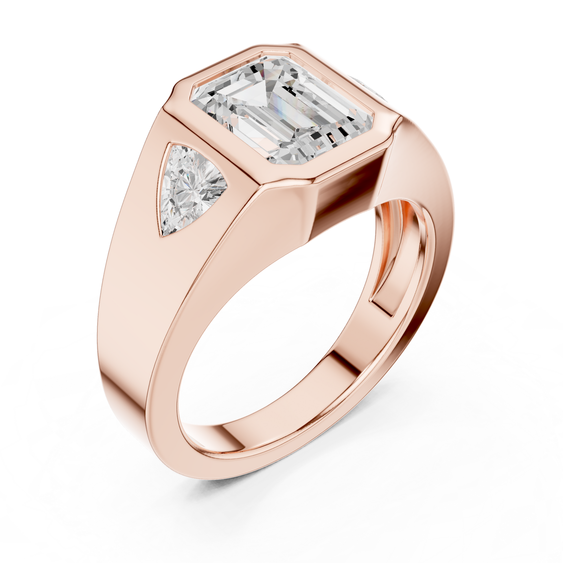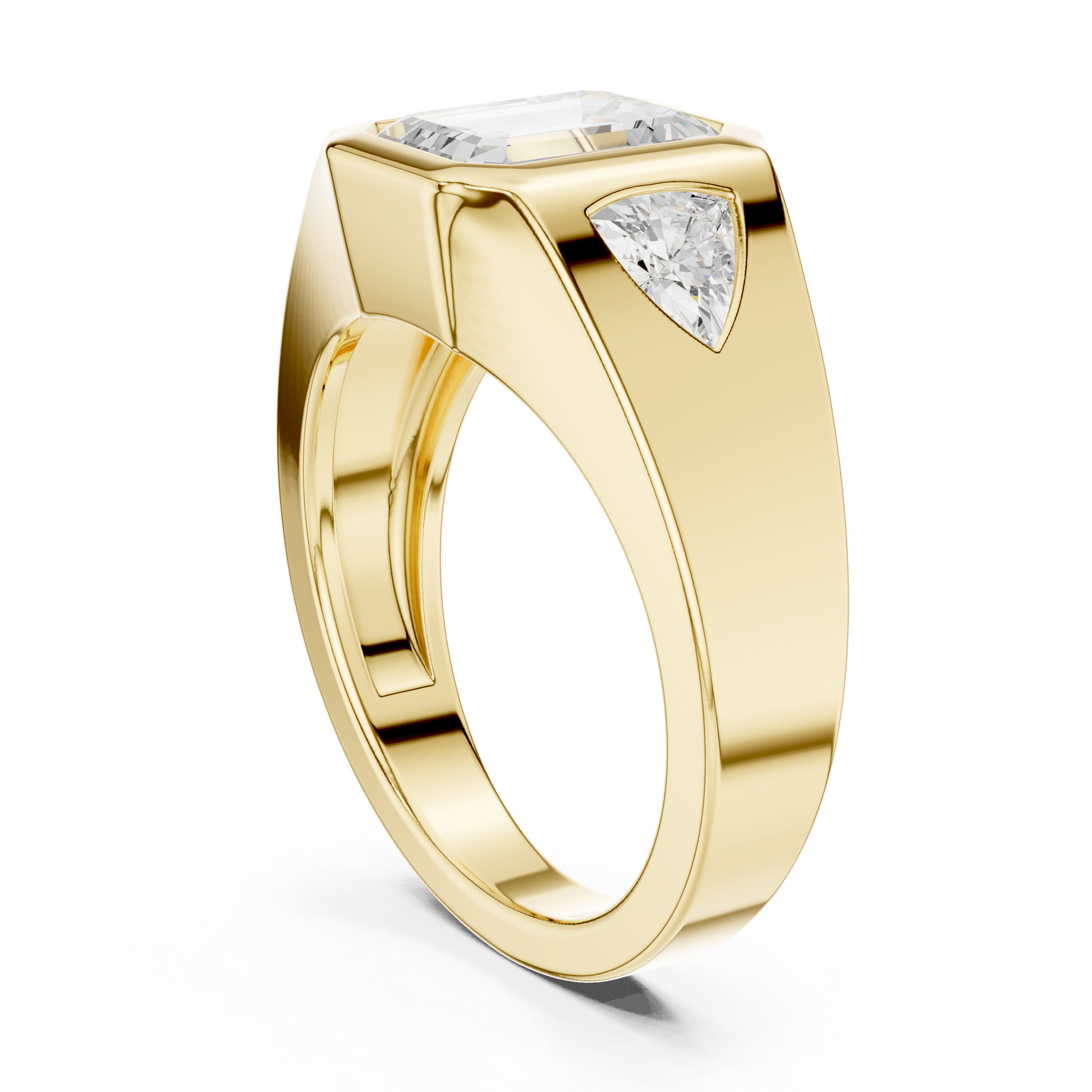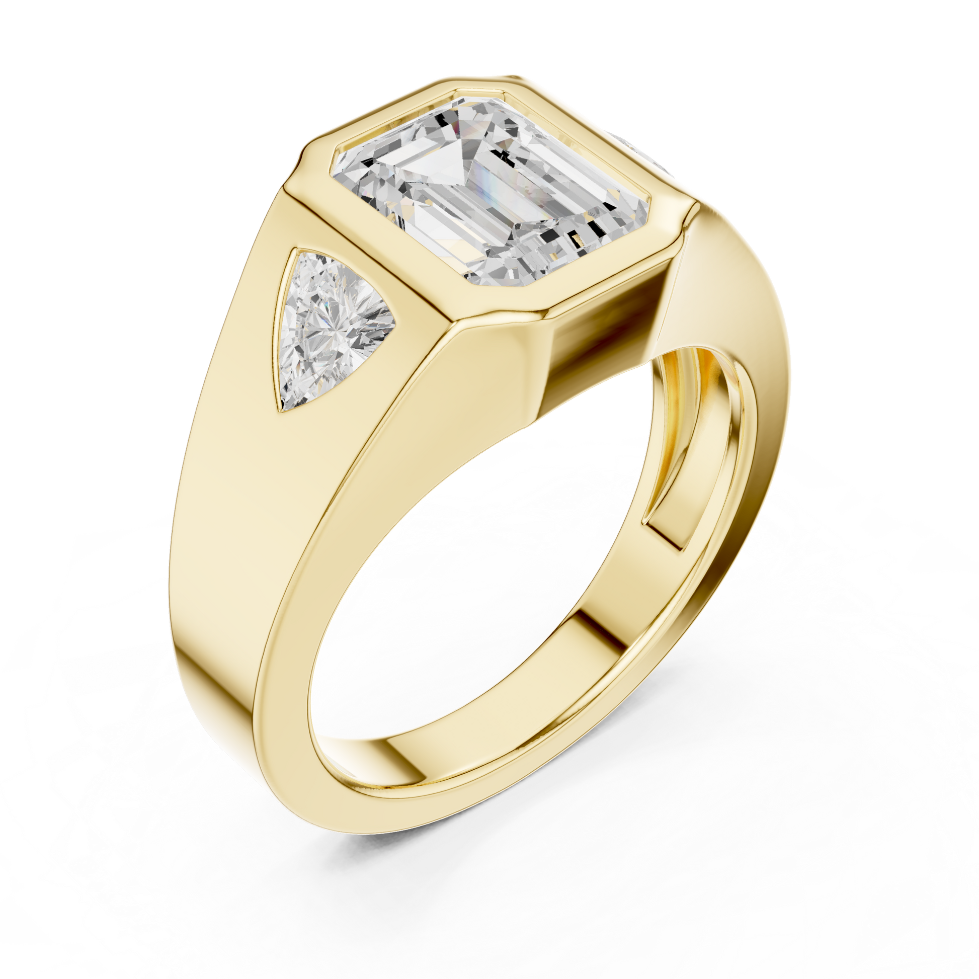 This striking ring features a commanding emerald-cut center diamond secured in a sleek bezel setting, complemented by trillion side diamonds for added brilliance. Crafted in polished gold, the bold band and architectural design create a powerful yet refined statement. Perfect for modern engagements, milestone celebrations, or elevated everyday luxury, this ring blends contemporary strength with timeless elegance.
