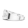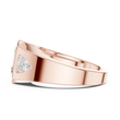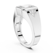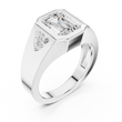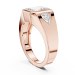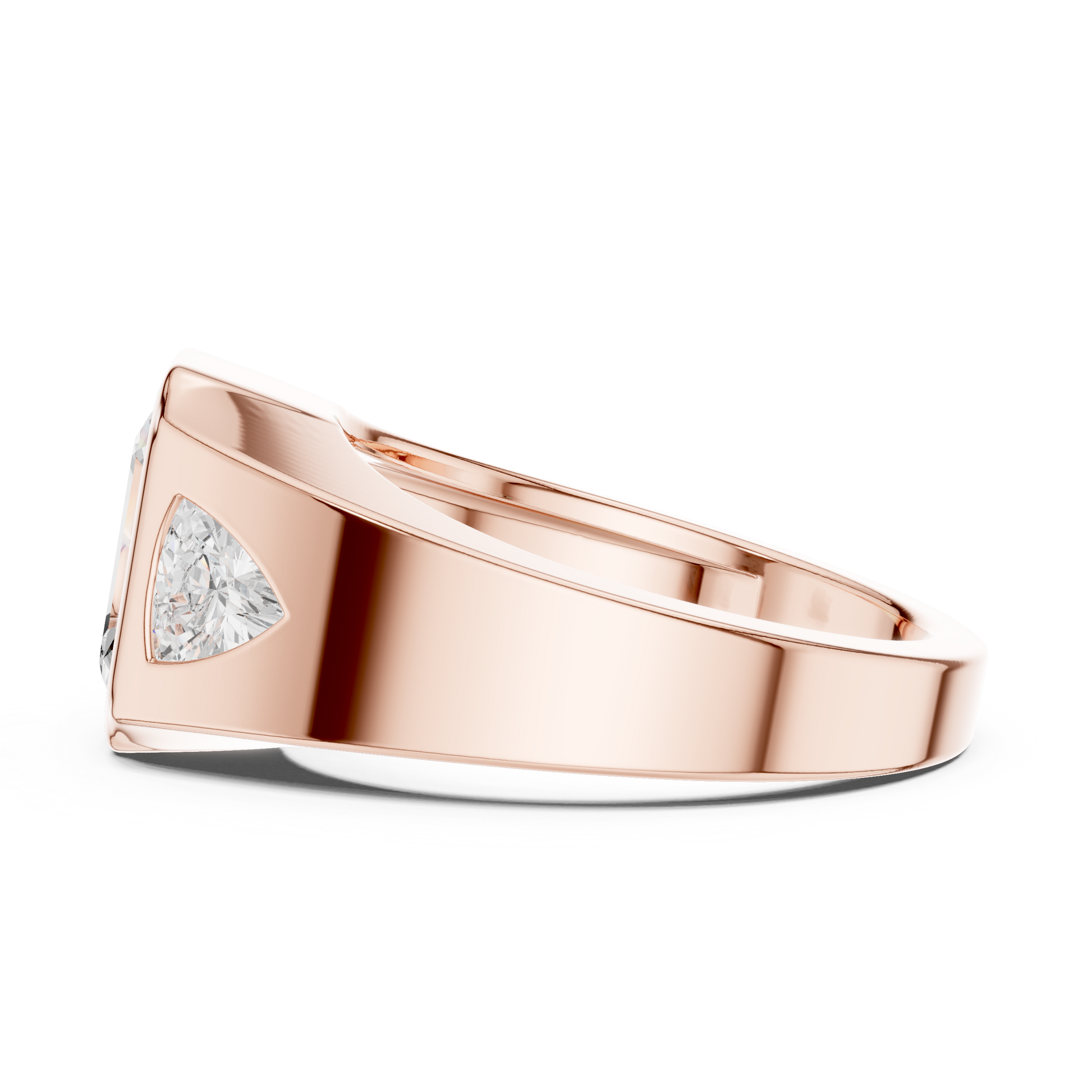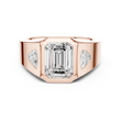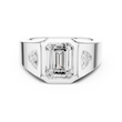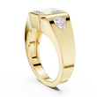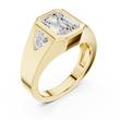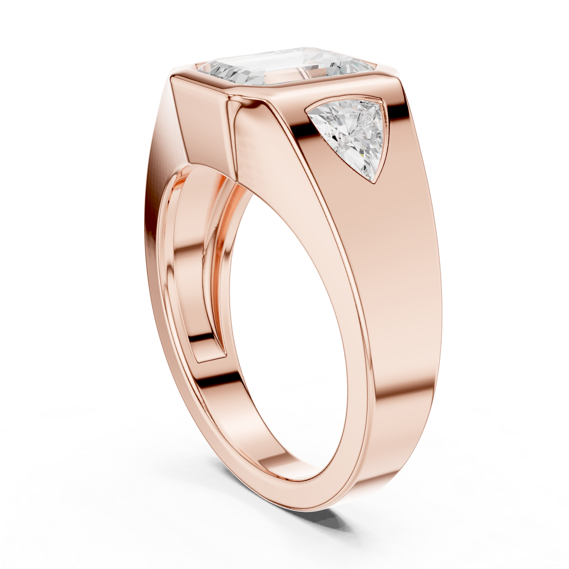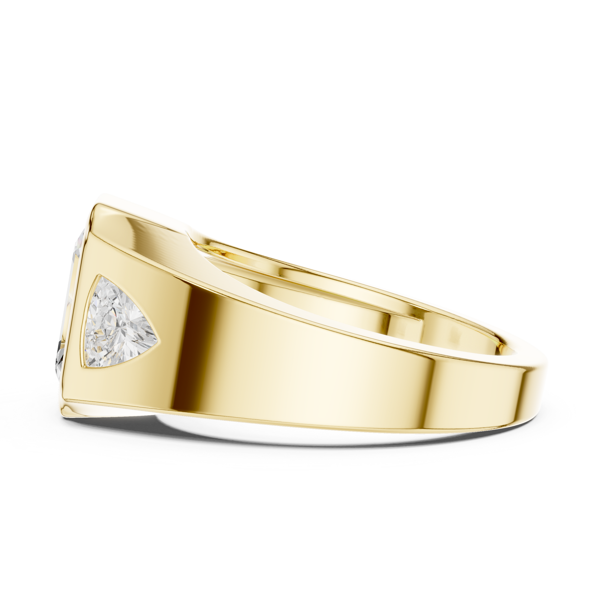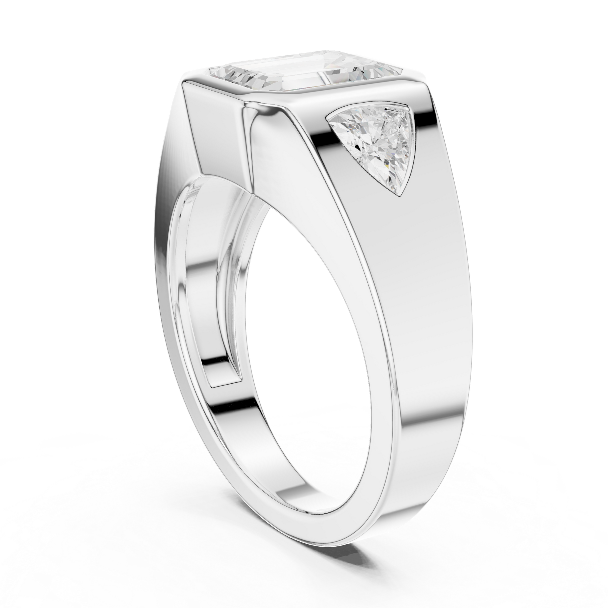This striking ring features a commanding emerald-cut center diamond secured in a sleek bezel setting, complemented by trillion side diamonds for added brilliance. Crafted in polished gold, the bold band and architectural design create a powerful yet refined statement. Perfect for modern engagements, milestone celebrations, or elevated everyday luxury, this ring blends contemporary strength with timeless elegance.