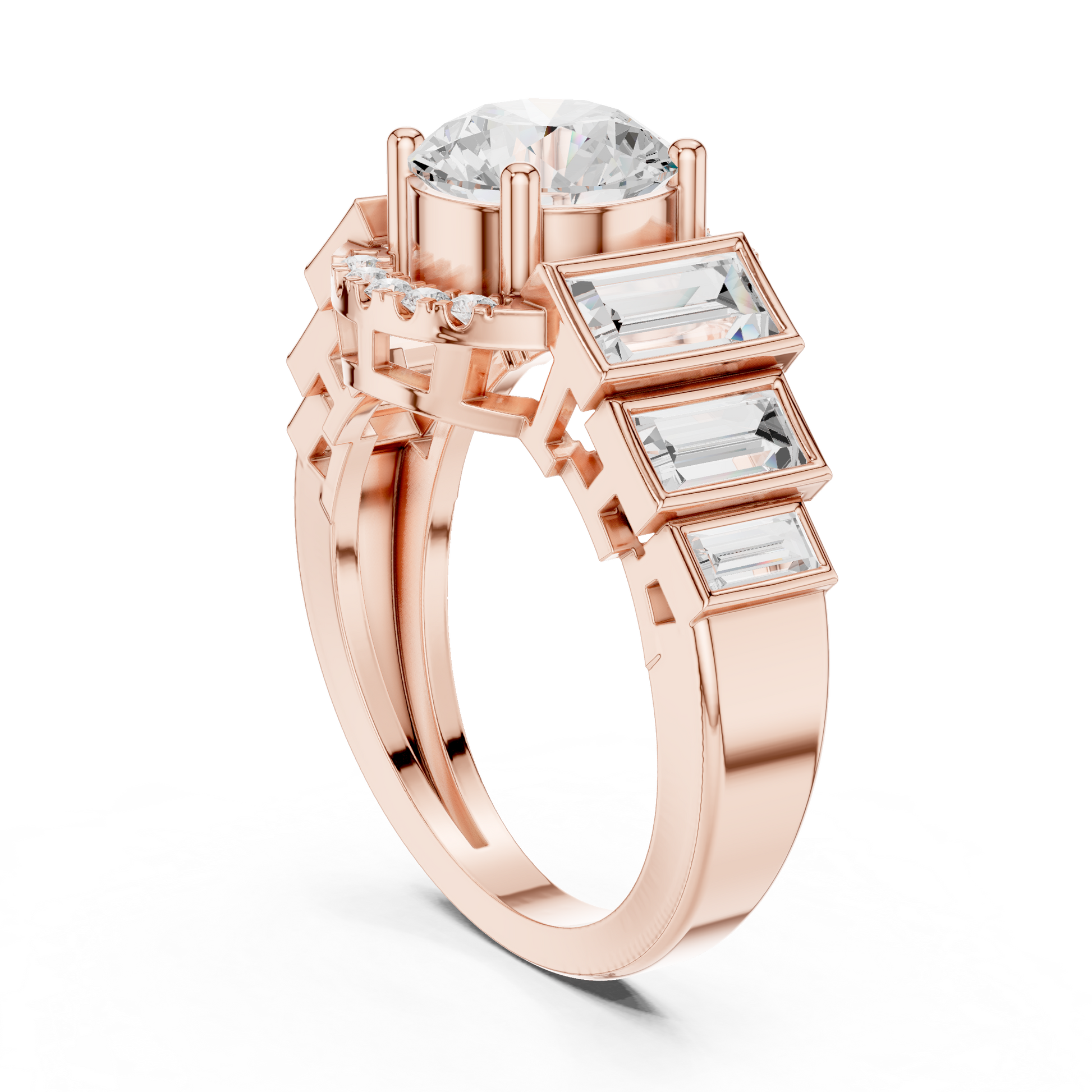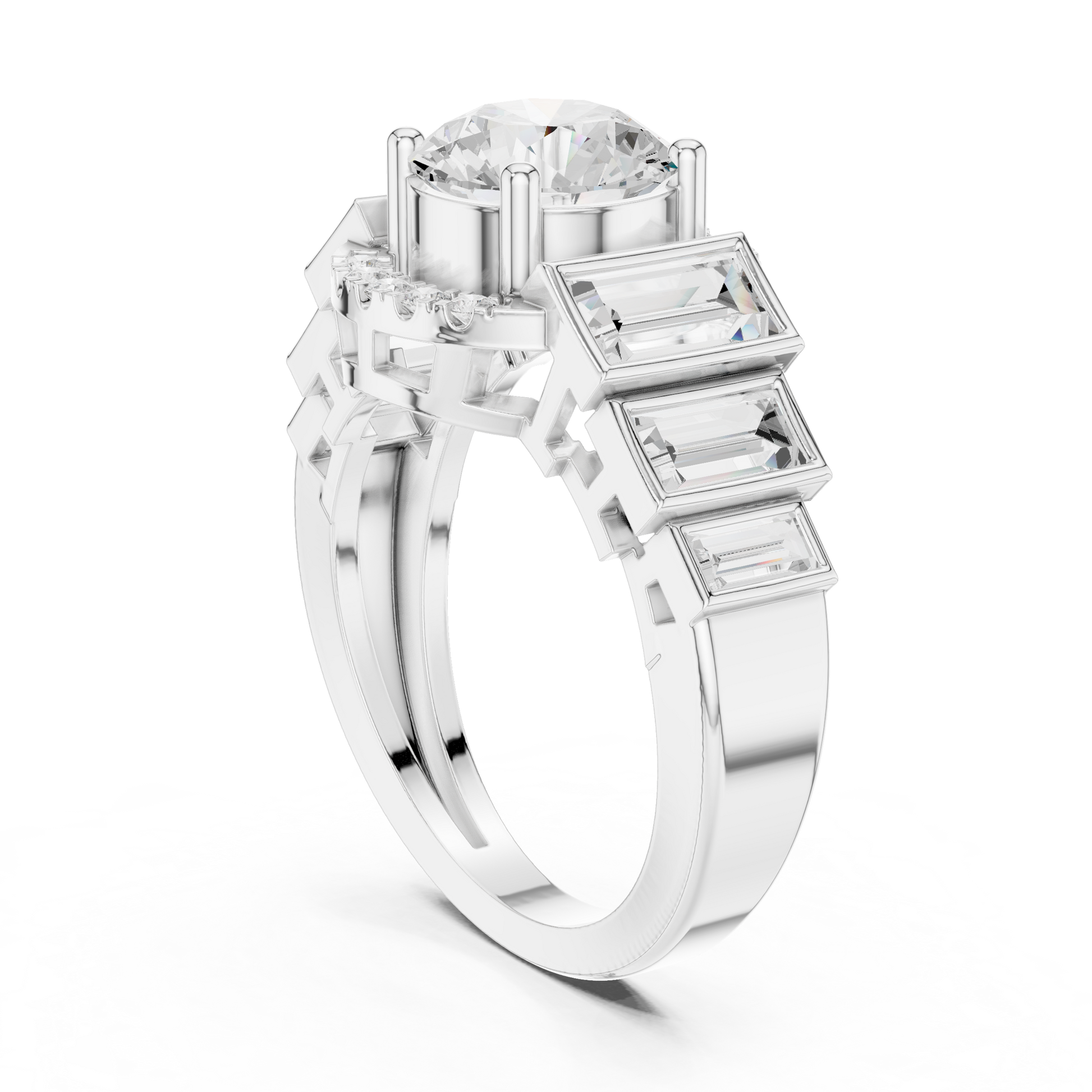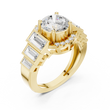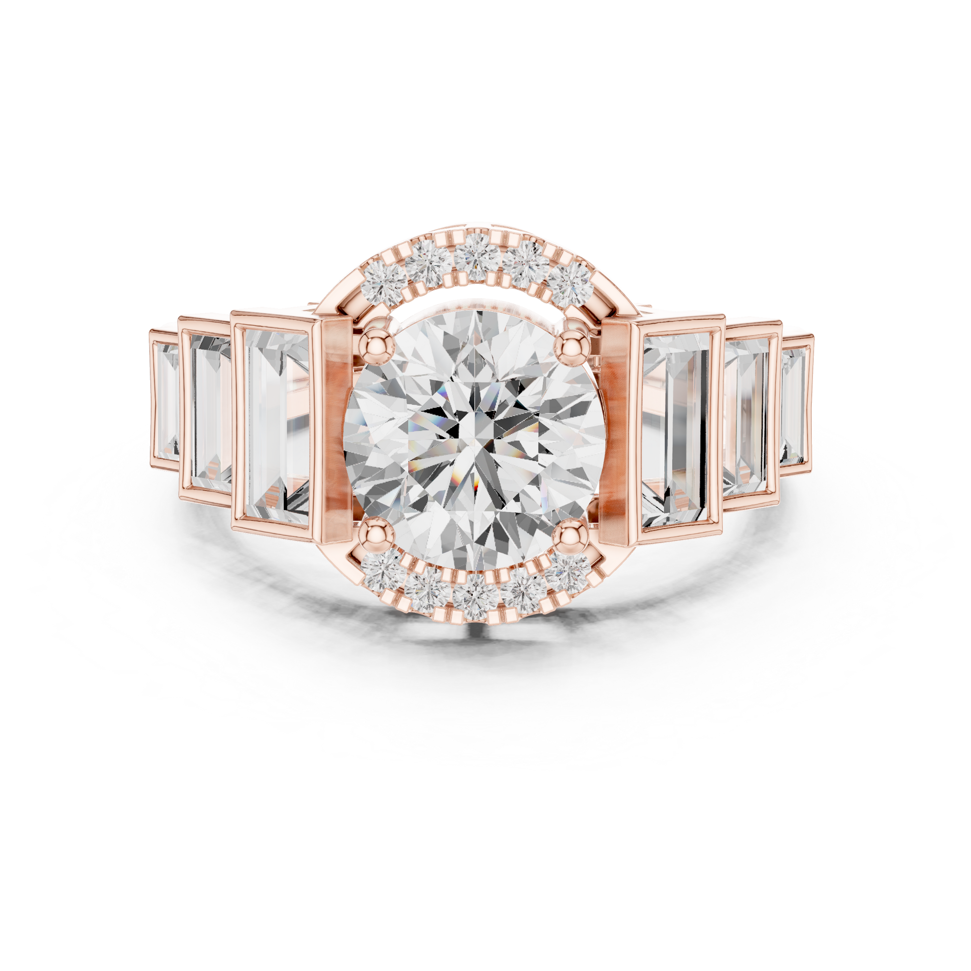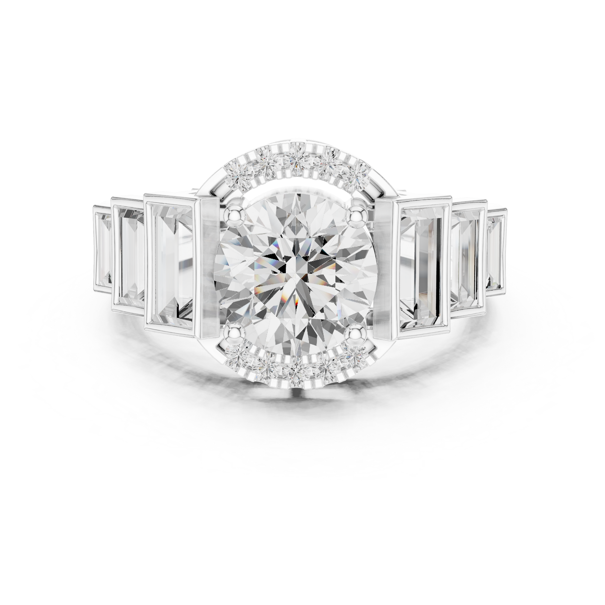 This striking gold ring features a brilliant round-cut diamond elegantly framed by sculpted baguette side panels, creating a bold architectural silhouette. A delicate pave halo encircles the center stone, adding refined sparkle while enhancing its depth and brilliance. The structured design balances modern geometry with timeless luxury, allowing light to flow effortlessly through every facet. Finished with a smooth, high-polish band, this ring is designed for those who appreciate distinctive craftsmanship, contemporary elegance, and statement-making bridal jewelry.