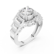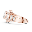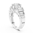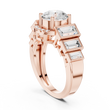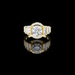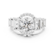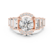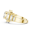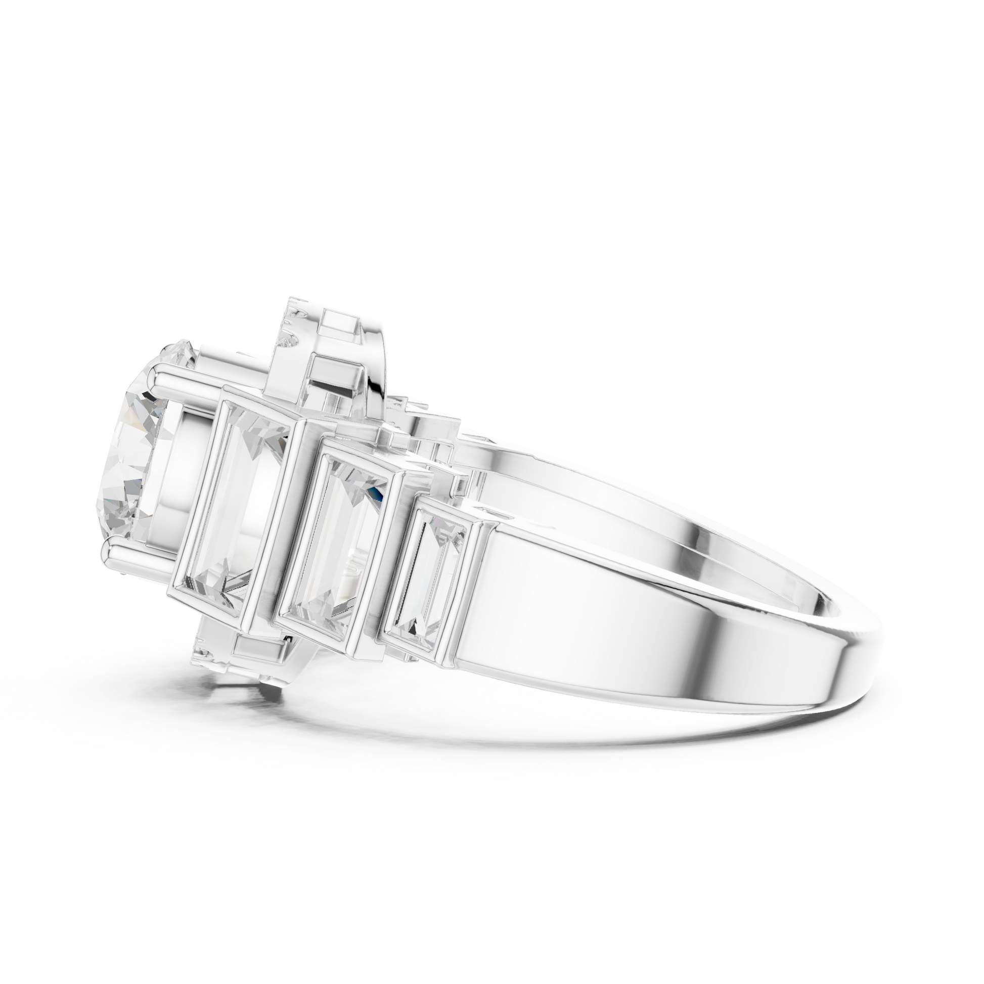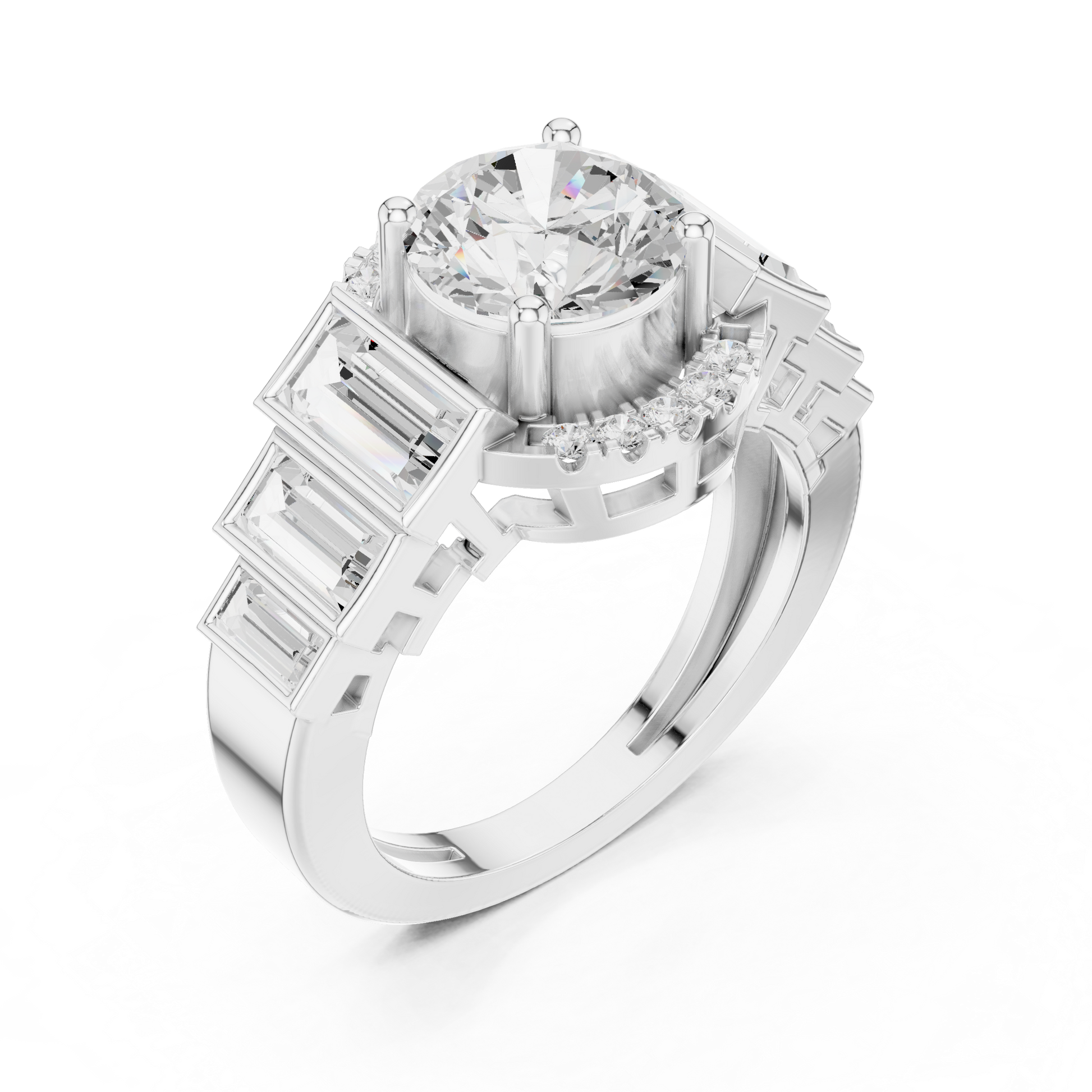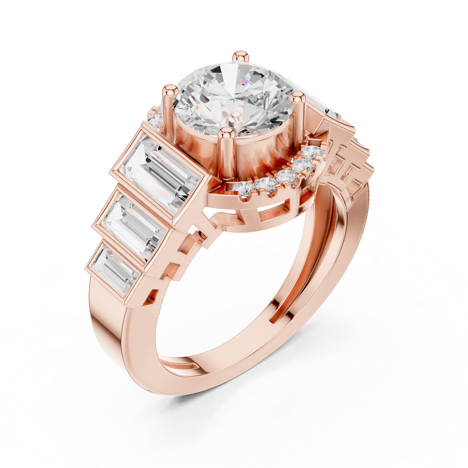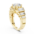 This striking gold ring features a brilliant round-cut diamond elegantly framed by sculpted baguette side panels, creating a bold architectural silhouette. A delicate pave halo encircles the center stone, adding refined sparkle while enhancing its depth and brilliance. The structured design balances modern geometry with timeless luxury, allowing light to flow effortlessly through every facet. Finished with a smooth, high-polish band, this ring is designed for those who appreciate distinctive craftsmanship, contemporary elegance, and statement-making bridal jewelry.