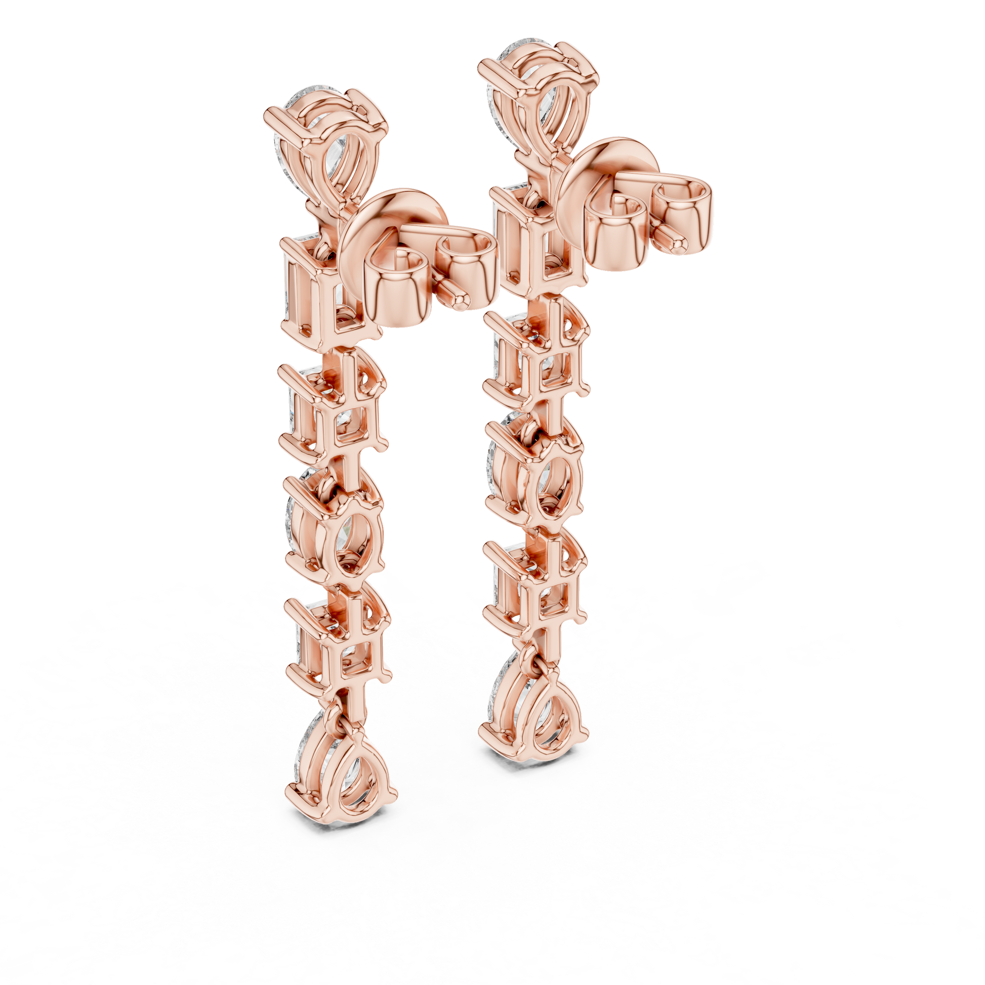 The Celestial Cascade Diamond Drop Earrings showcase a captivating journey of light through a refined sequence of mixed diamond cuts, artfully arranged in a sleek vertical silhouette. Beginning with a pear-cut diamond stud, the design flows through emerald, princess, and oval-cut diamonds, finishing with a pear-shaped drop that adds graceful movement and sparkle.Expertly crafted in high, each diamond is secured in delicate prong settings that highlight its unique shape while maintaining harmony and balance.