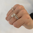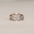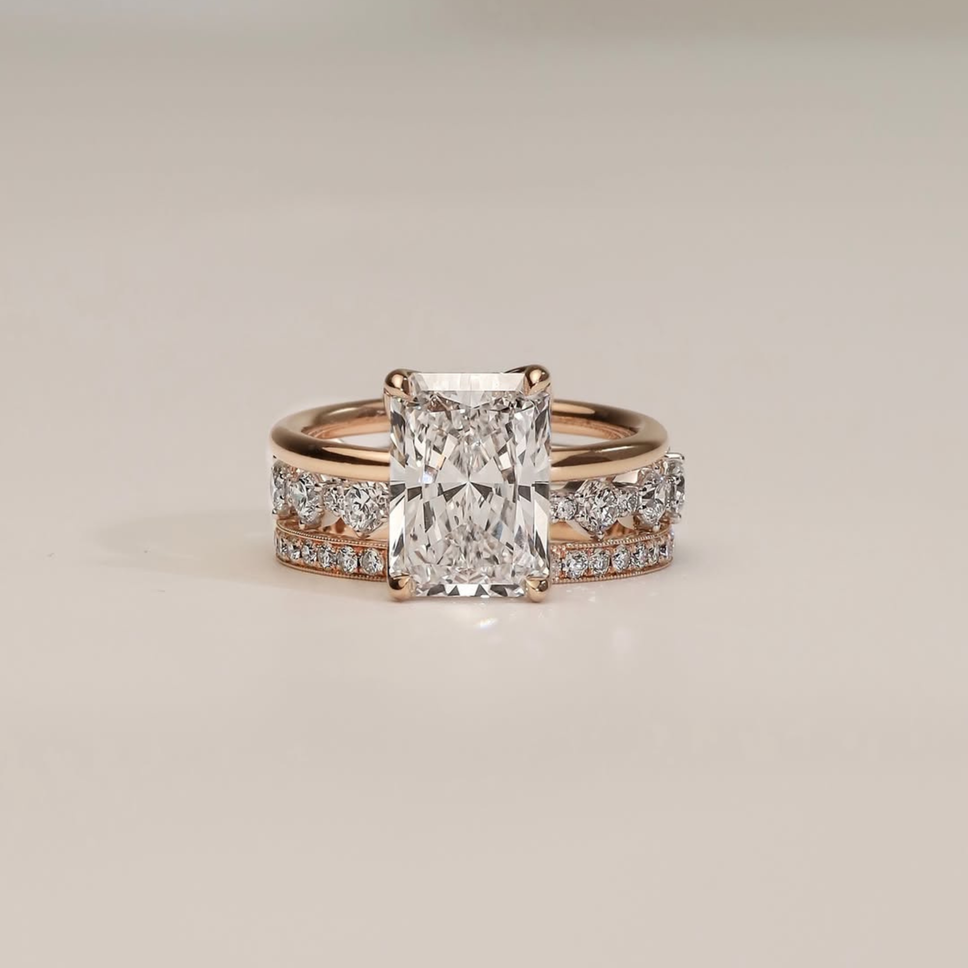 This exquisite ring set features a radiant cut diamond that captures light with exceptional brilliance and sharp geometry. Set in warm rose gold, the center stone is elevated by a refined layered band design, accented with shimmering pavé diamonds that add depth and dimension.The stacked silhouette creates a bold yet elegant presence, blending modern craftsmanship with timeless bridal luxury. Perfect for those who desire a distinctive engagement or bridal look that feels both architectural and romantic, this design is made to stand out while remaining endlessly wearable.
