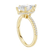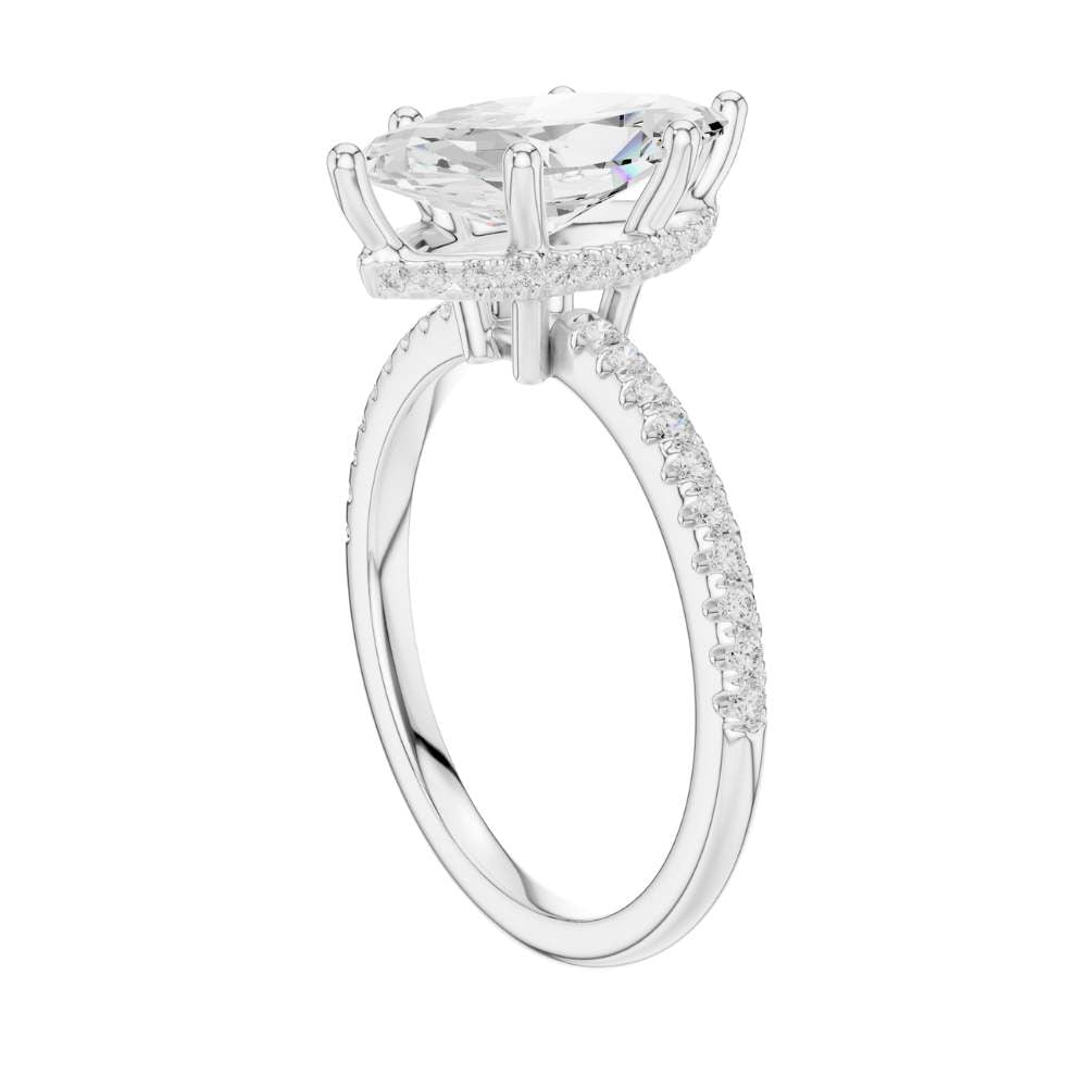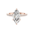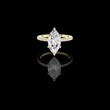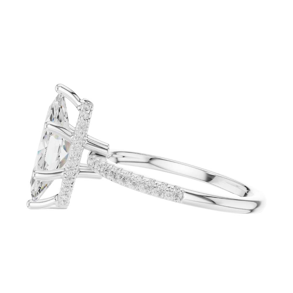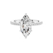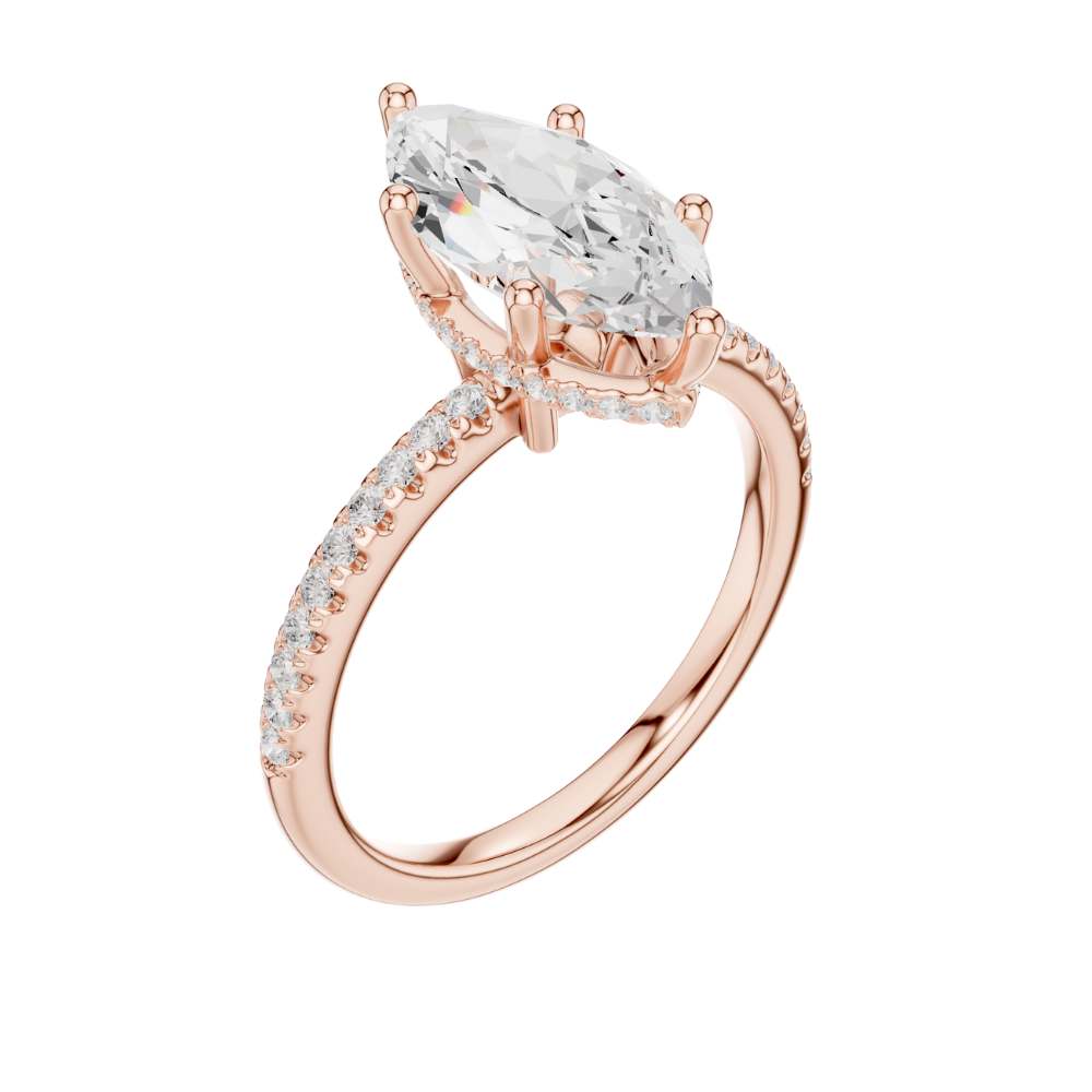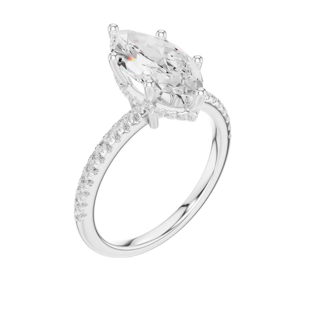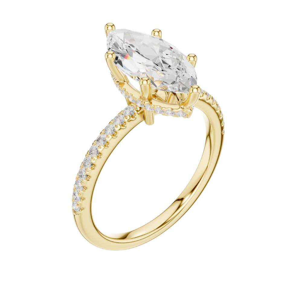 This stunning engagement ring features a radiant marquise-cut diamond set vertically to elongate the finger and maximize brilliance. The center stone is secured in a refined six-prong gold setting, while the slim band is adorned with delicate pave-set diamonds that add continuous sparkle from every angle. Elegant yet striking, this design blends vintage-inspired charm with modern sophistication, making it a captivating choice for a timeless and romantic proposal.