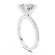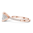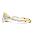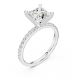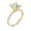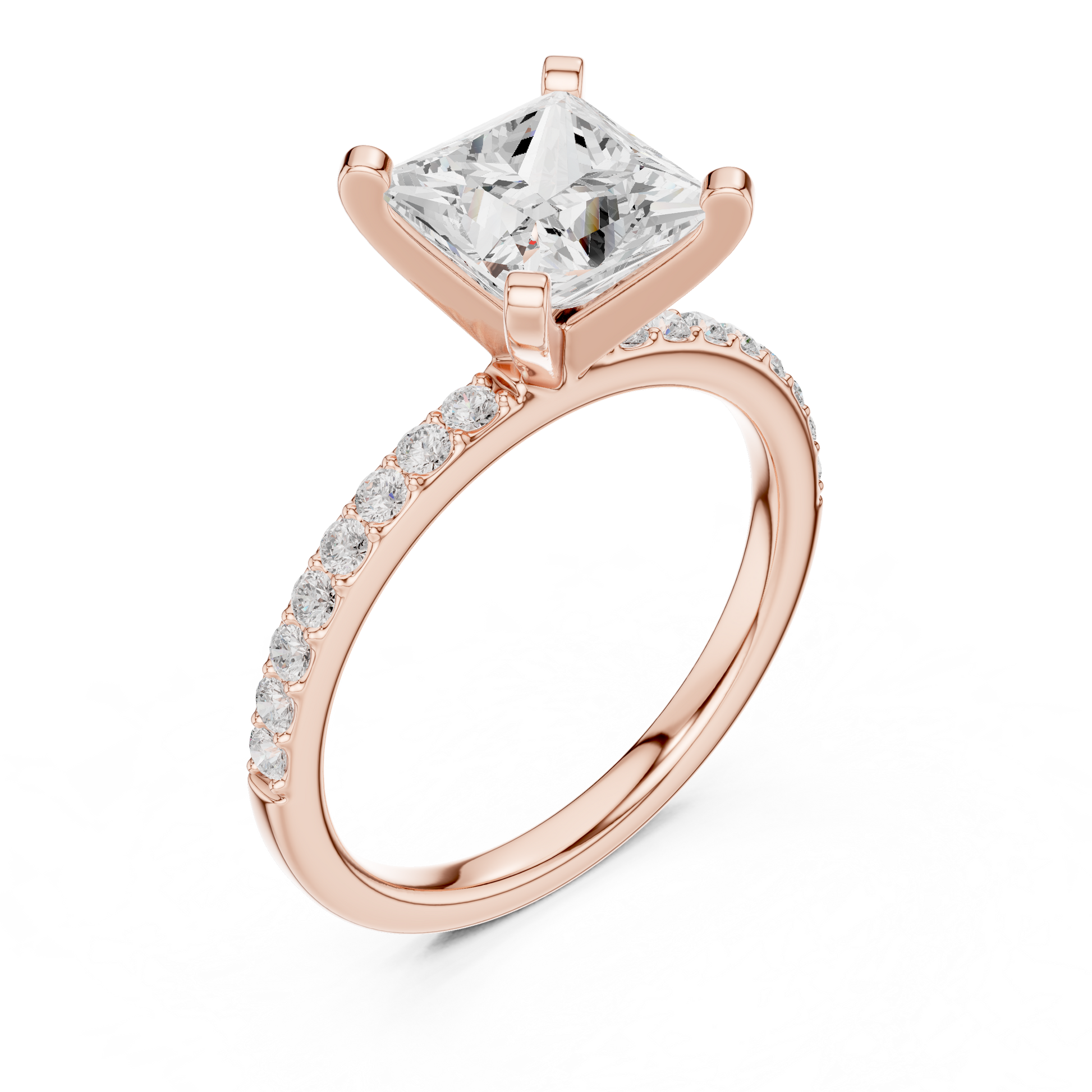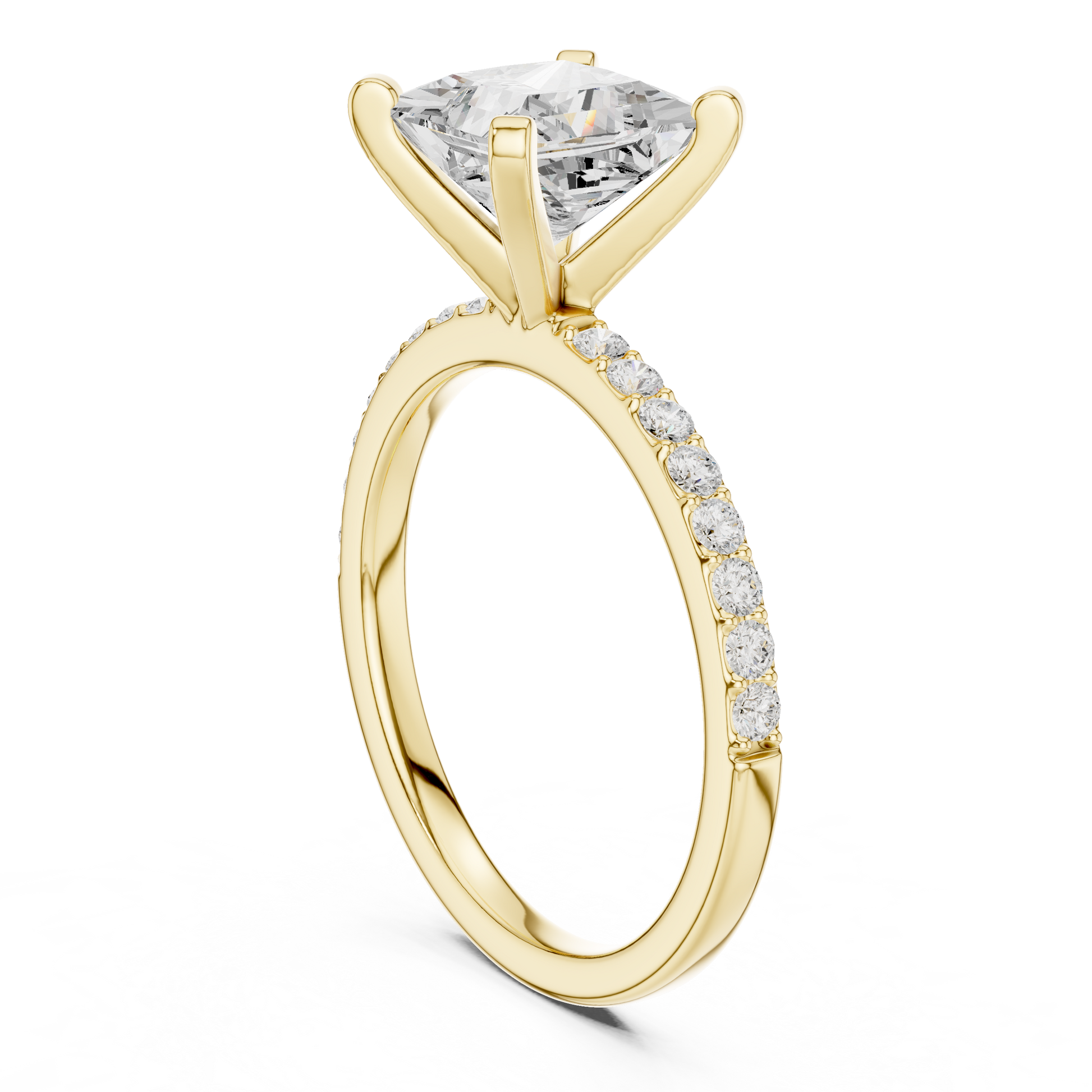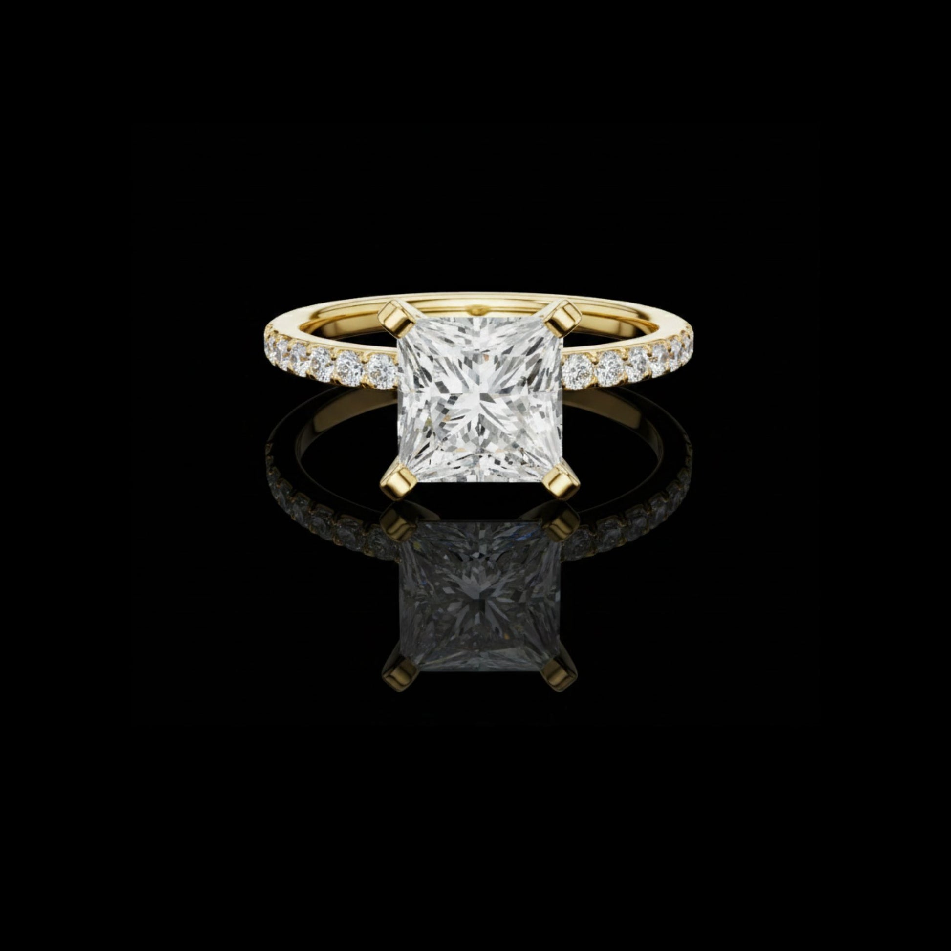 This captivating ring showcases a brilliant princess-cut diamond as its centerpiece, set in a luxurious gold band. The shank is adorned with sparkling pavé diamonds, enhancing the ring’s shine and sophistication. Perfect for those who appreciate modern elegance, this piece combines sharp geometry with timeless beauty. The exquisite craftsmanship and high-quality diamonds make it an exceptional symbol of love and commitment.