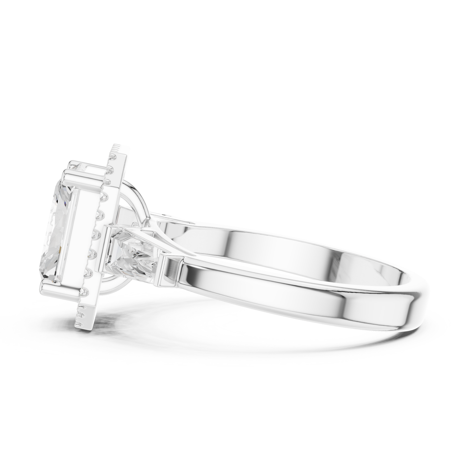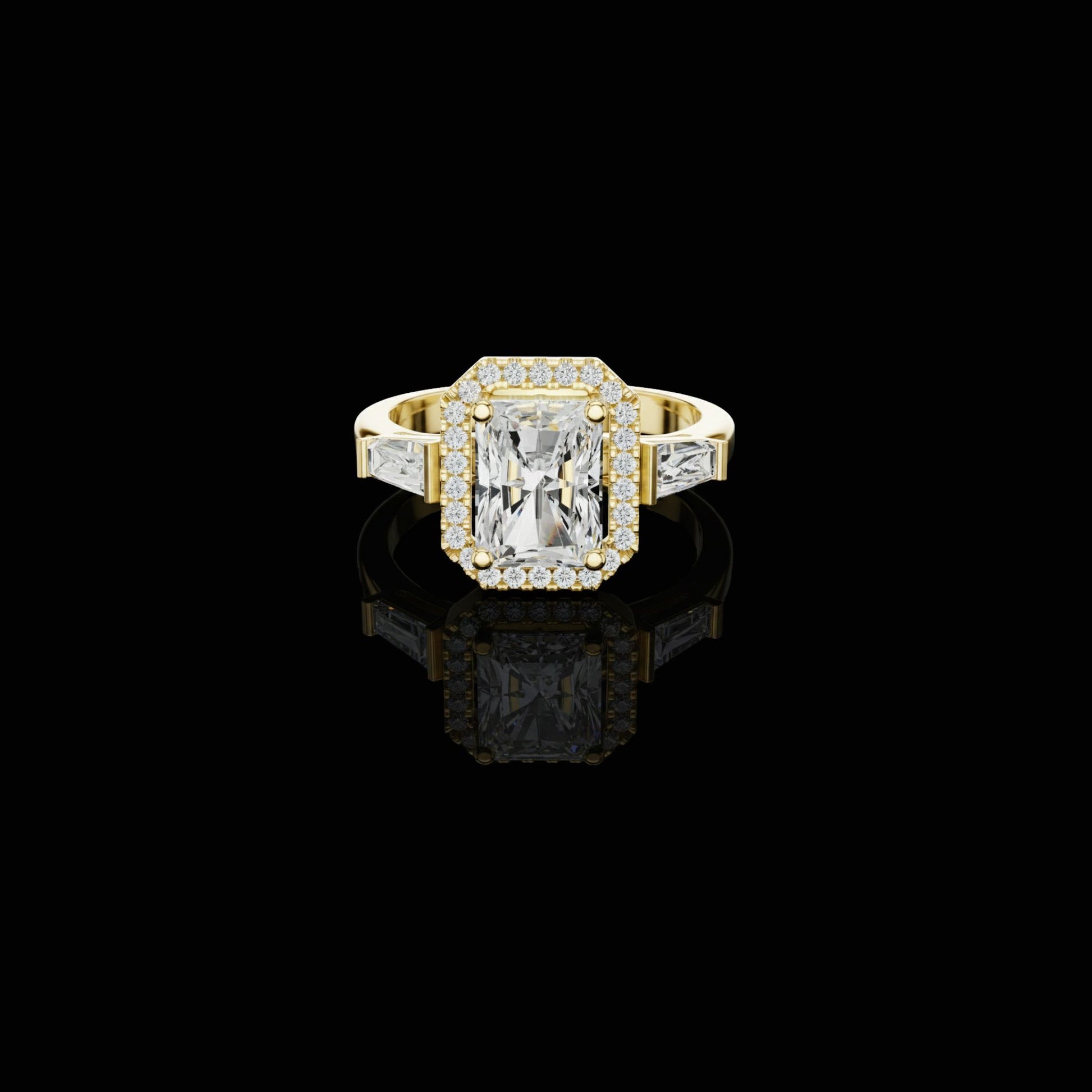 Command attention with this exceptional emerald-cut diamond halo ring, exquisitely crafted in gold by Ivevar Luxury. The bold emerald-shaped center diamond is framed by a radiant pavé diamond halo, enhancing its clean lines and mirror-like brilliance. Flanked by elegant trillion cut side diamonds, this design delivers a perfect balance of modern sophistication and timeless luxury. Ideal for engagements, anniversaries, and high-jewelry collectors, this ring represents strength, elegance, and enduring love.
