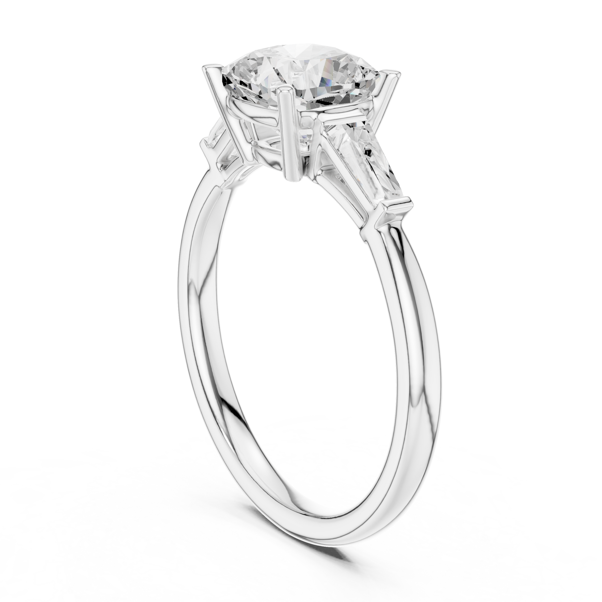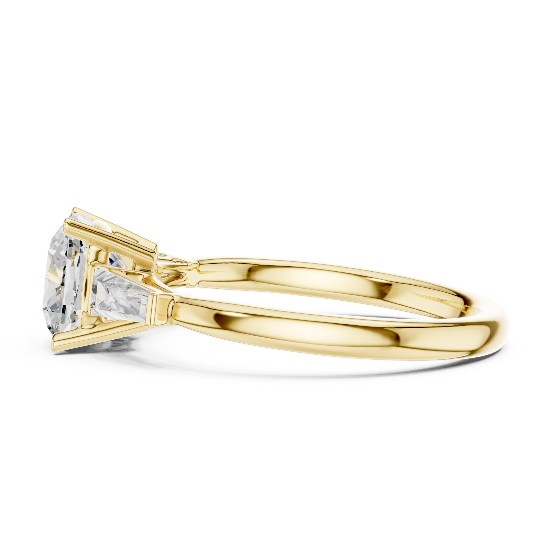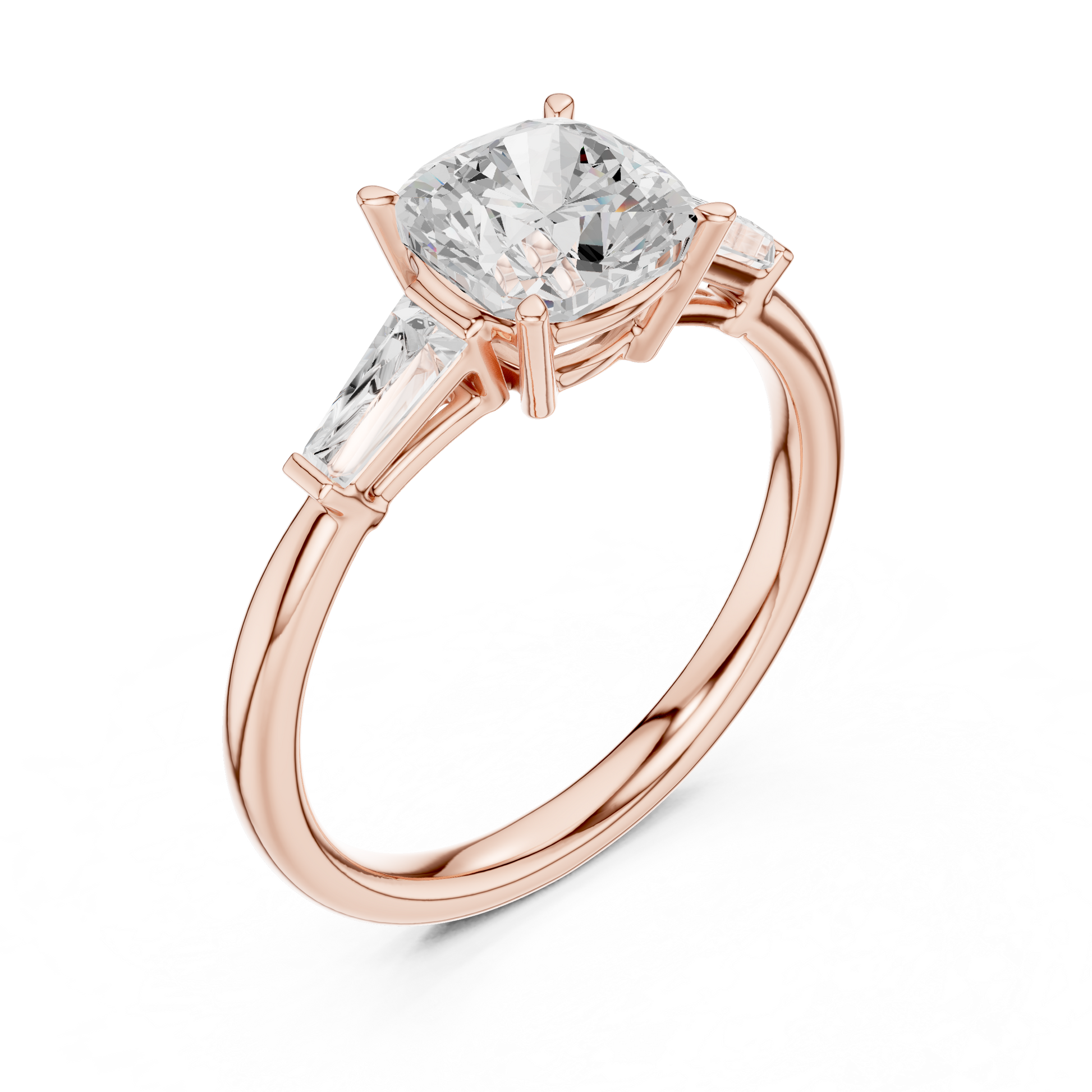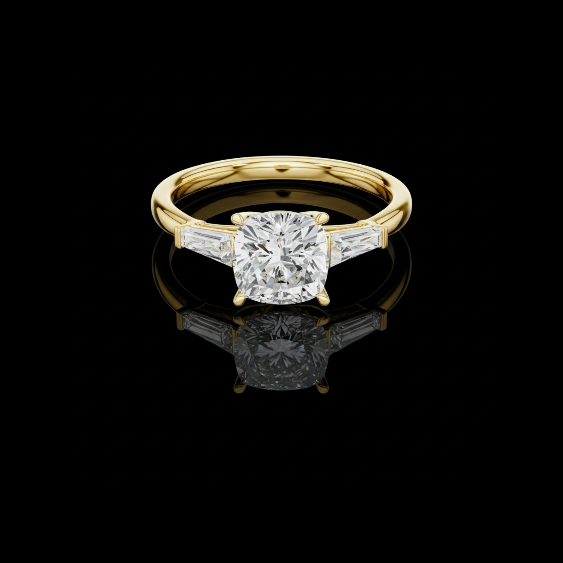 Experience refined elegance with this exceptional engagement ring from Ivevar Luxury, masterfully crafted to highlight timeless beauty and modern sophistication. The design features a radiant cushion-cut center diamond, celebrated for its soft corners and brilliant fire, securely held in a classic four-prong gold setting. Sleek tapered baguette side diamonds gracefully flank the center stone, enhancing its presence while adding a clean, architectural touch.