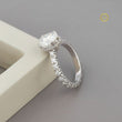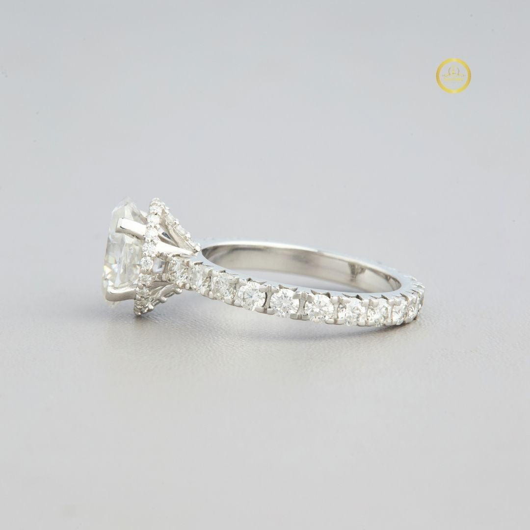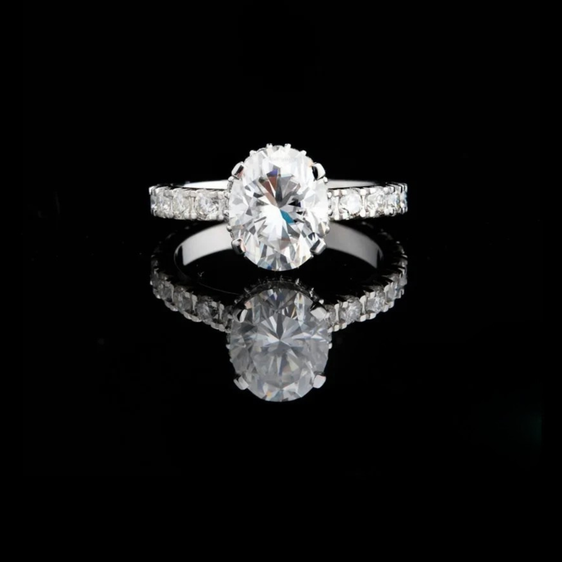 This magnificent engagement ring features a large, exceptionally brilliant oval-cut diamond as its focal point. The central stone is held securely by a simple prong setting that allows its maximum fire and sparkle to be displayed. The band is crafted from polished white precious metal and showcases a continuous line of large, channel-set or shared-prong-set round diamonds, creating a luxurious, high-impact eternity style.