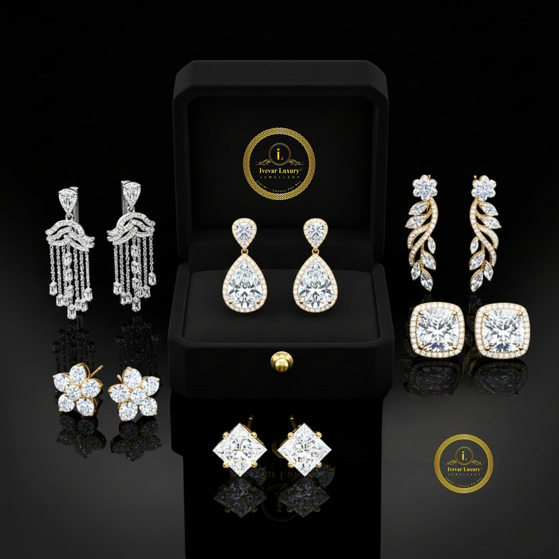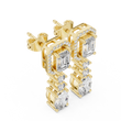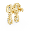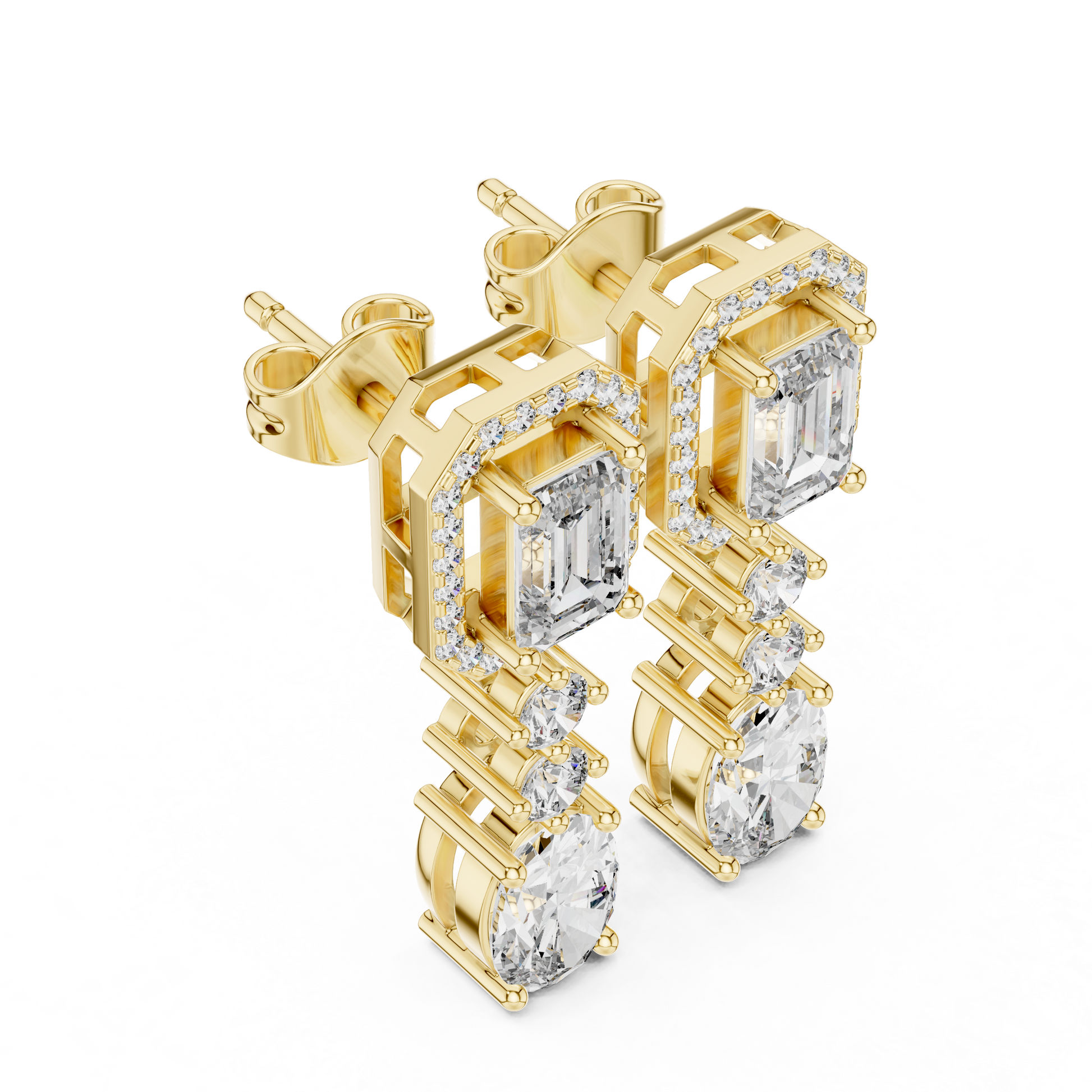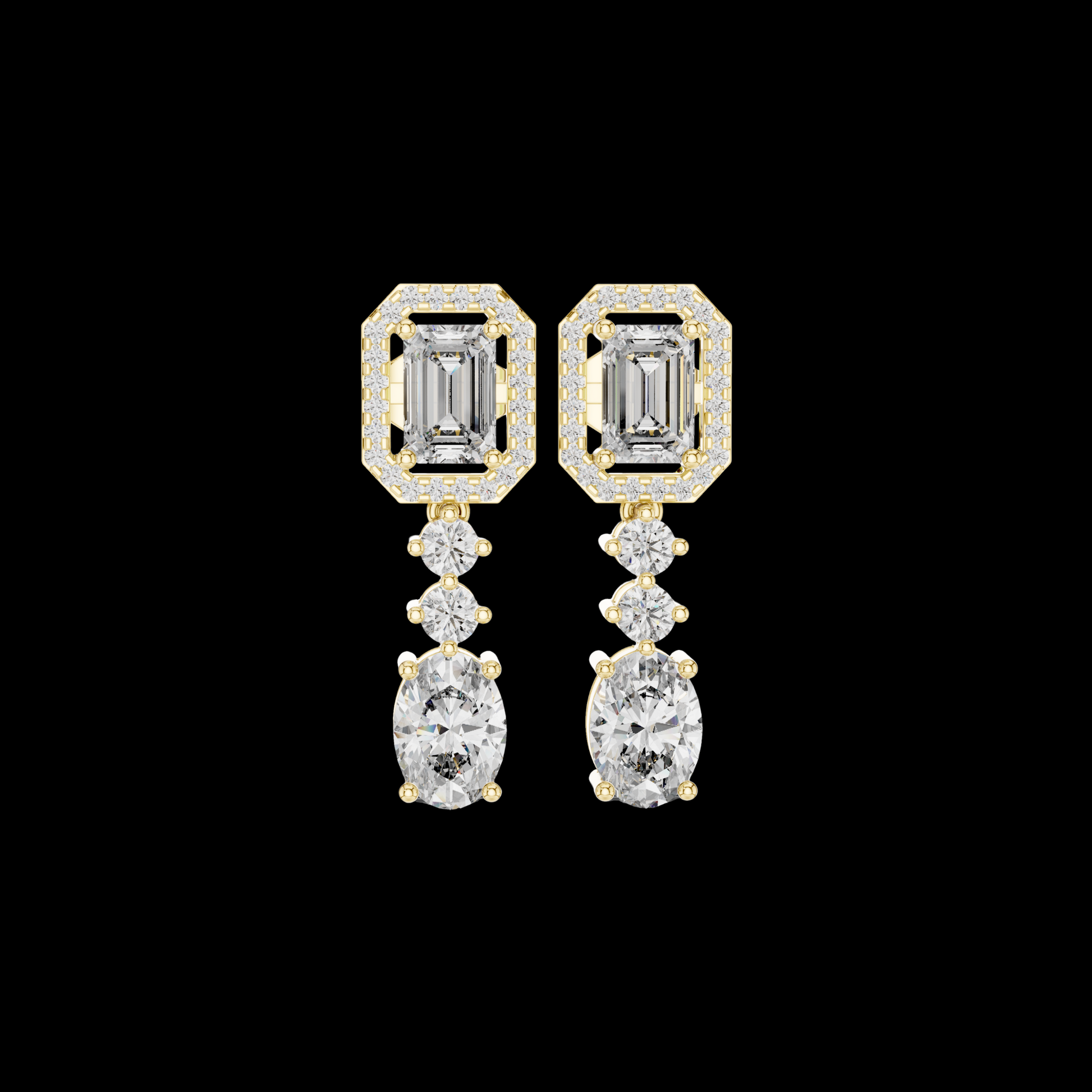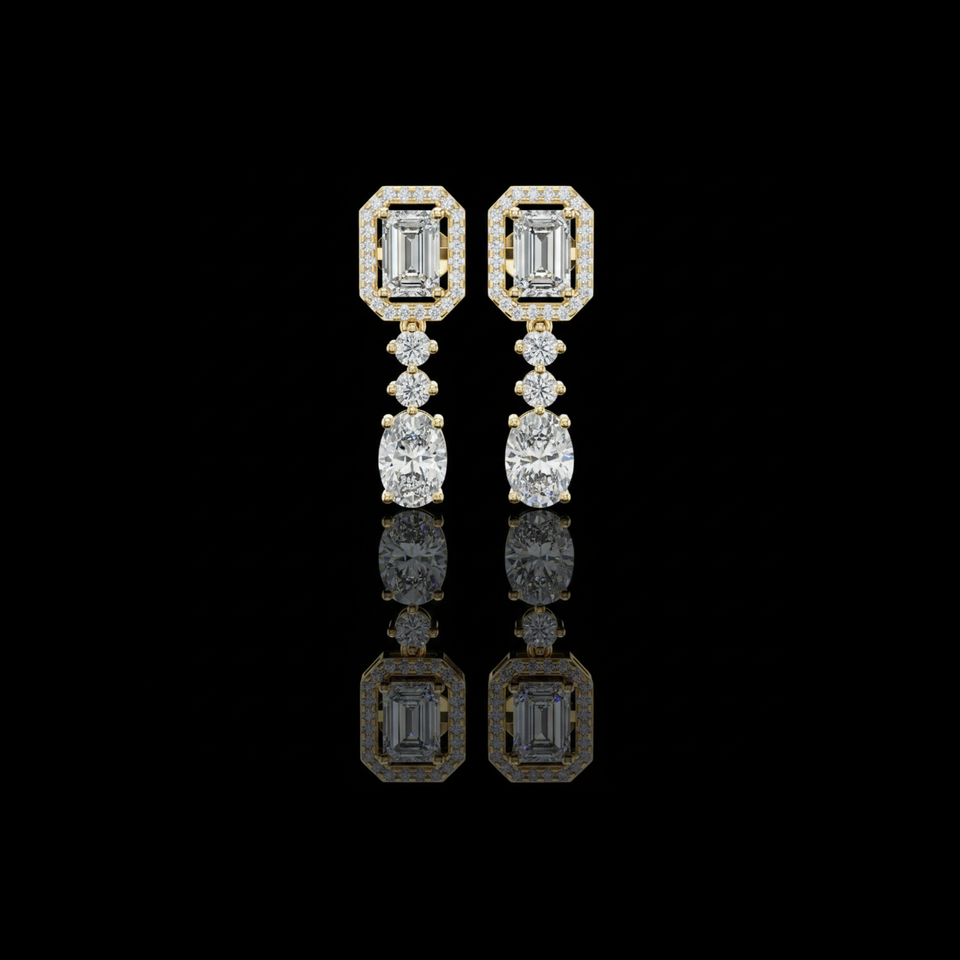 Command attention with these extraordinary diamond drop earrings, inspired by the bold geometry of Art Deco design. Featuring emerald-cut diamonds framed by pavé halos, each earring descends into a luminous trio of round brilliant and oval-cut diamonds. The graceful drop creates captivating movement and sparkle, while the setting enhances every facet. Perfect for evening glamour, formal occasions, or red-carpet moments, these earrings embody luxury craftsmanship, timeless elegance, and statement-worthy brilliance.