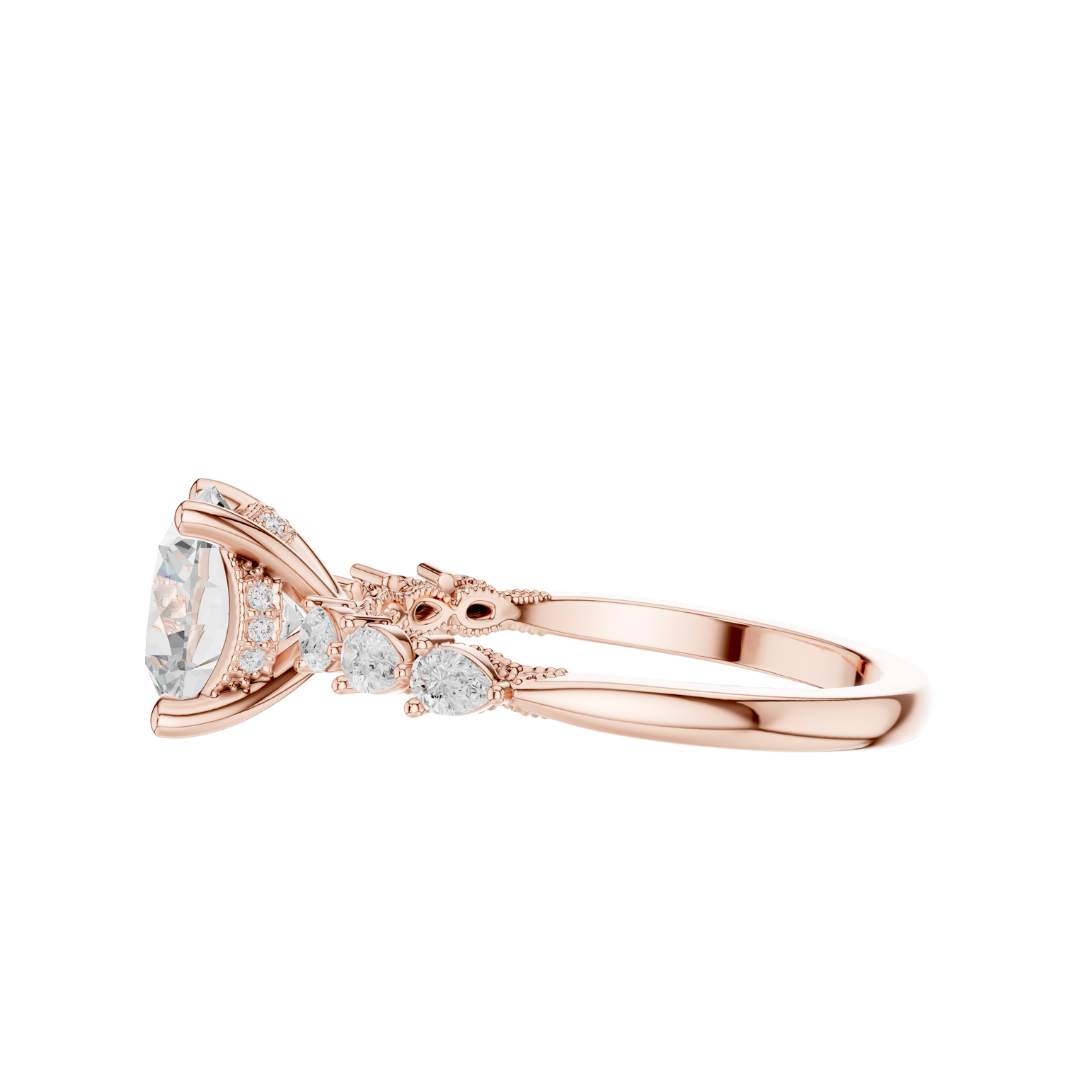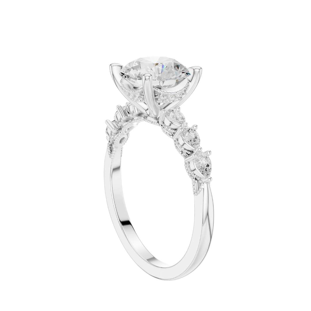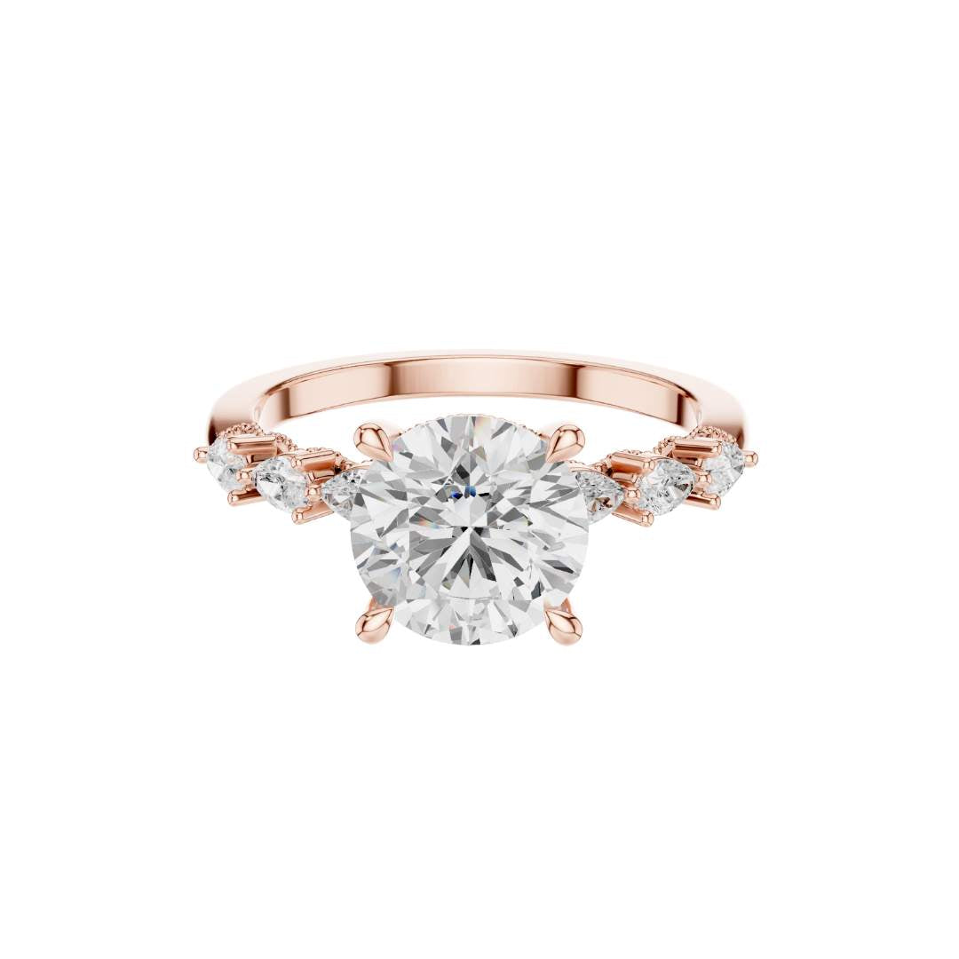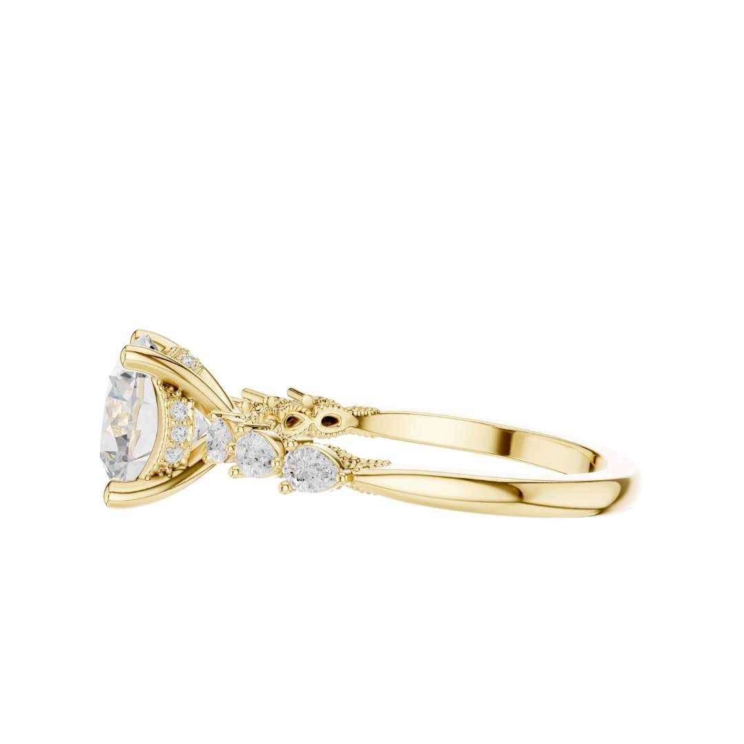 This stunning ring features a brilliant round-cut center diamond set in classic gold, supported by four elegant prongs for maximum light return. Along the band, pear side stones and petite diamonds create a graceful cascade of sparkle, adding dimension and sophistication to the design. Blending timeless charm with refined detailing, this ring offers a romantic, radiant look that beautifully highlights the center stone’s fire and brilliance.