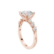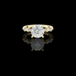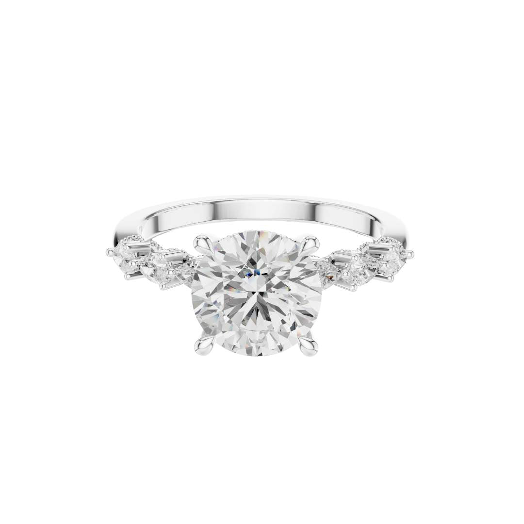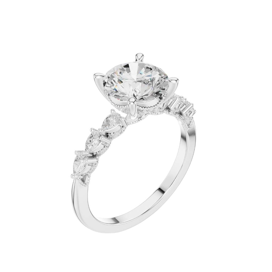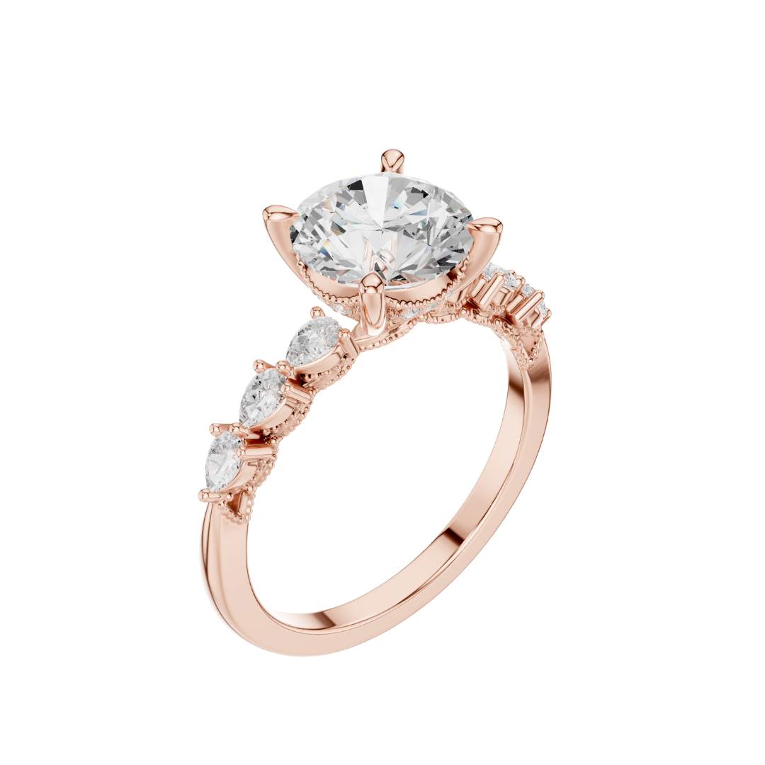 This stunning ring features a brilliant round-cut center diamond set in classic gold, supported by four elegant prongs for maximum light return. Along the band, pear side stones and petite diamonds create a graceful cascade of sparkle, adding dimension and sophistication to the design. Blending timeless charm with refined detailing, this ring offers a romantic, radiant look that beautifully highlights the center stone’s fire and brilliance.