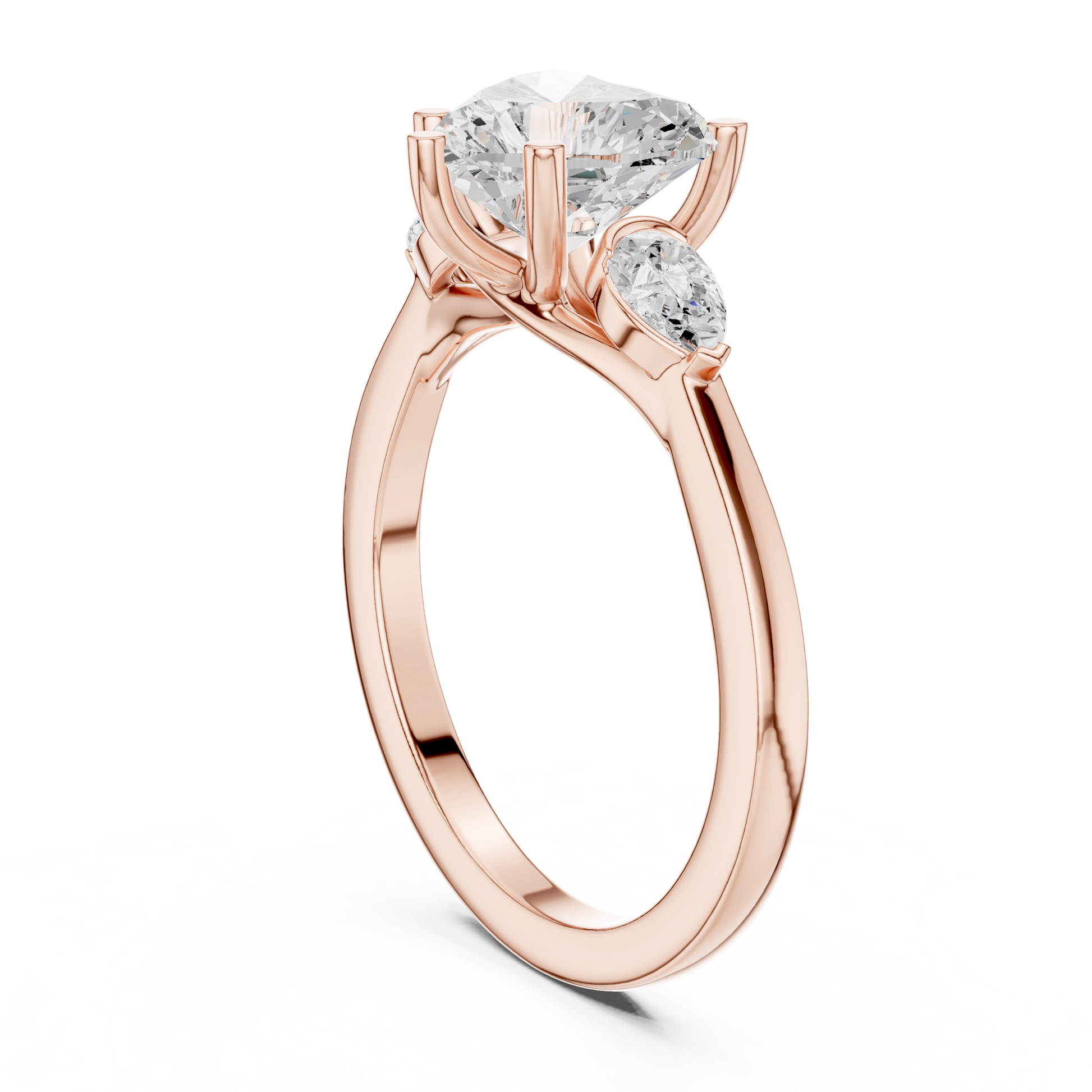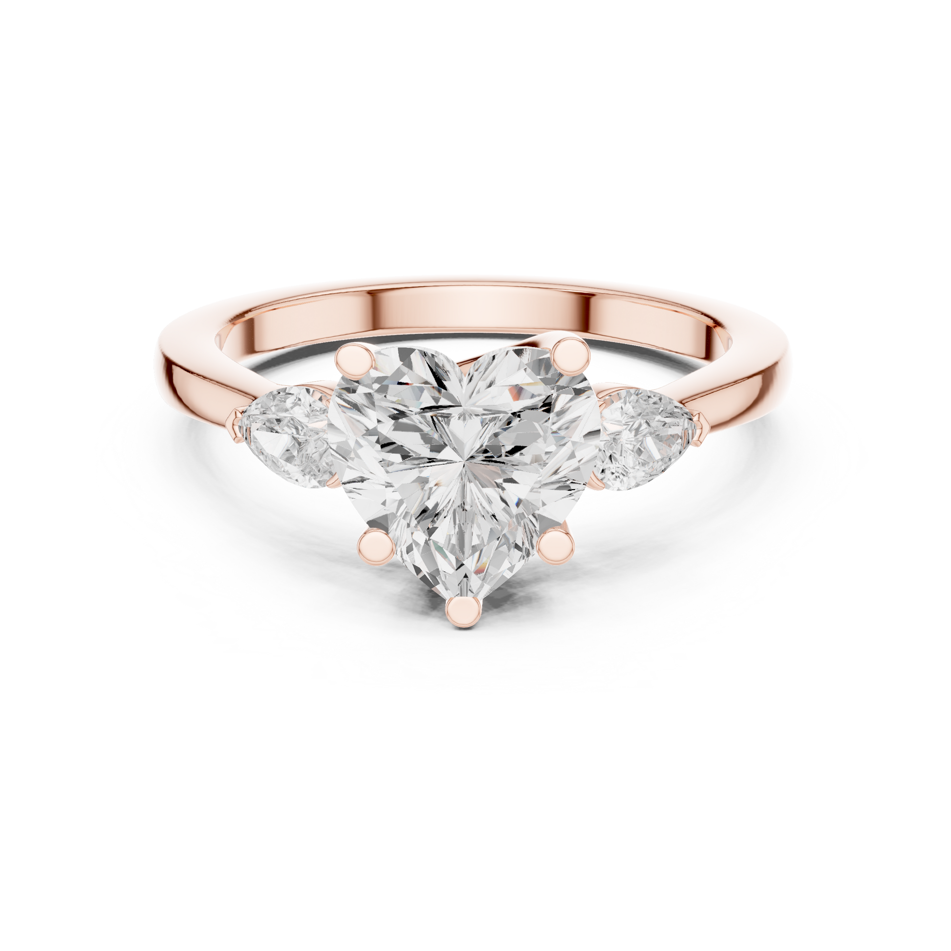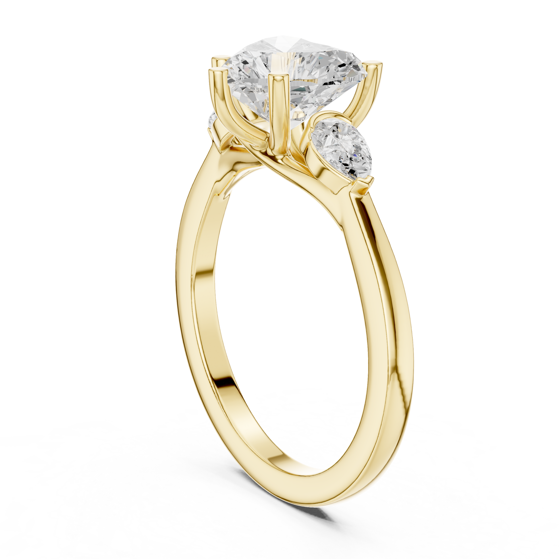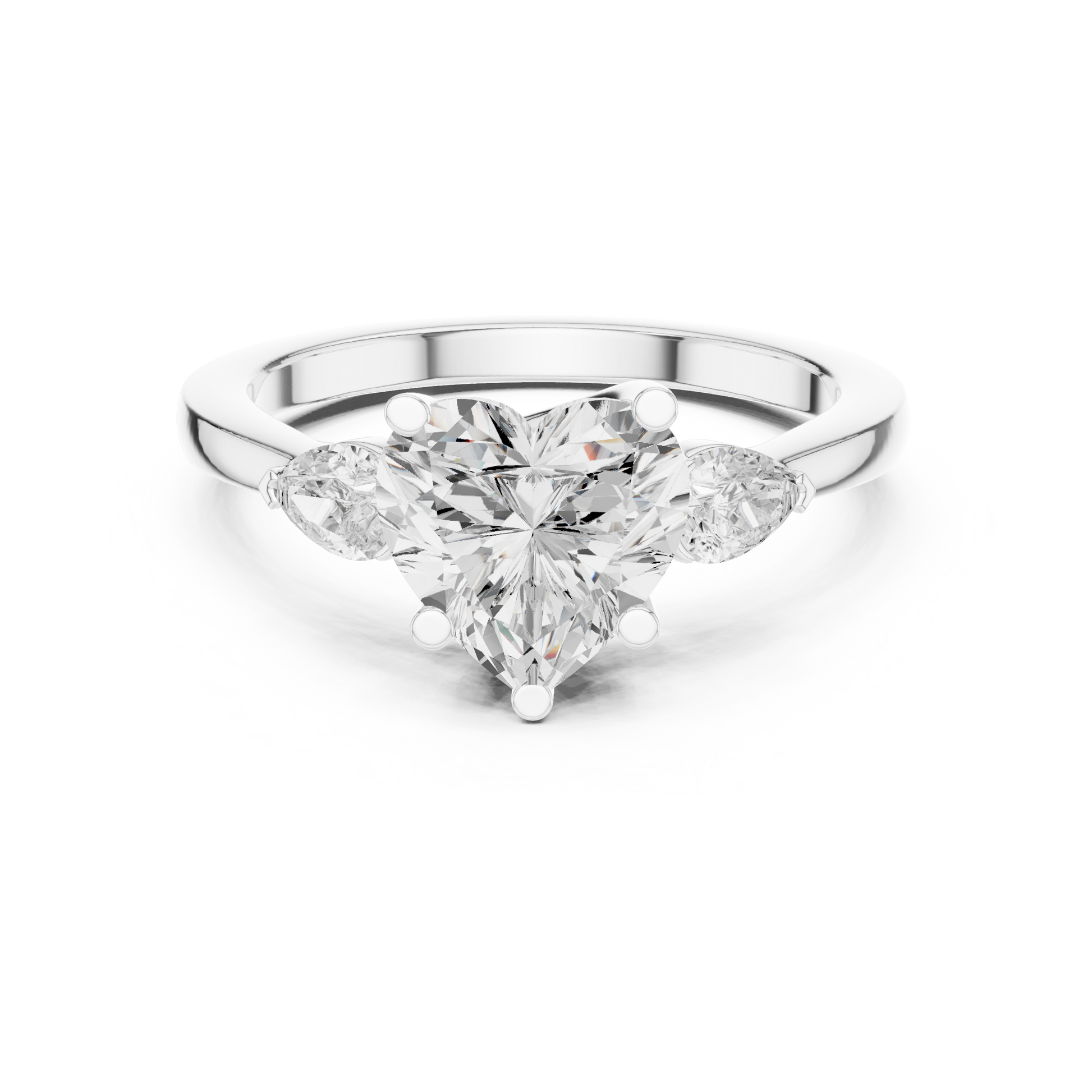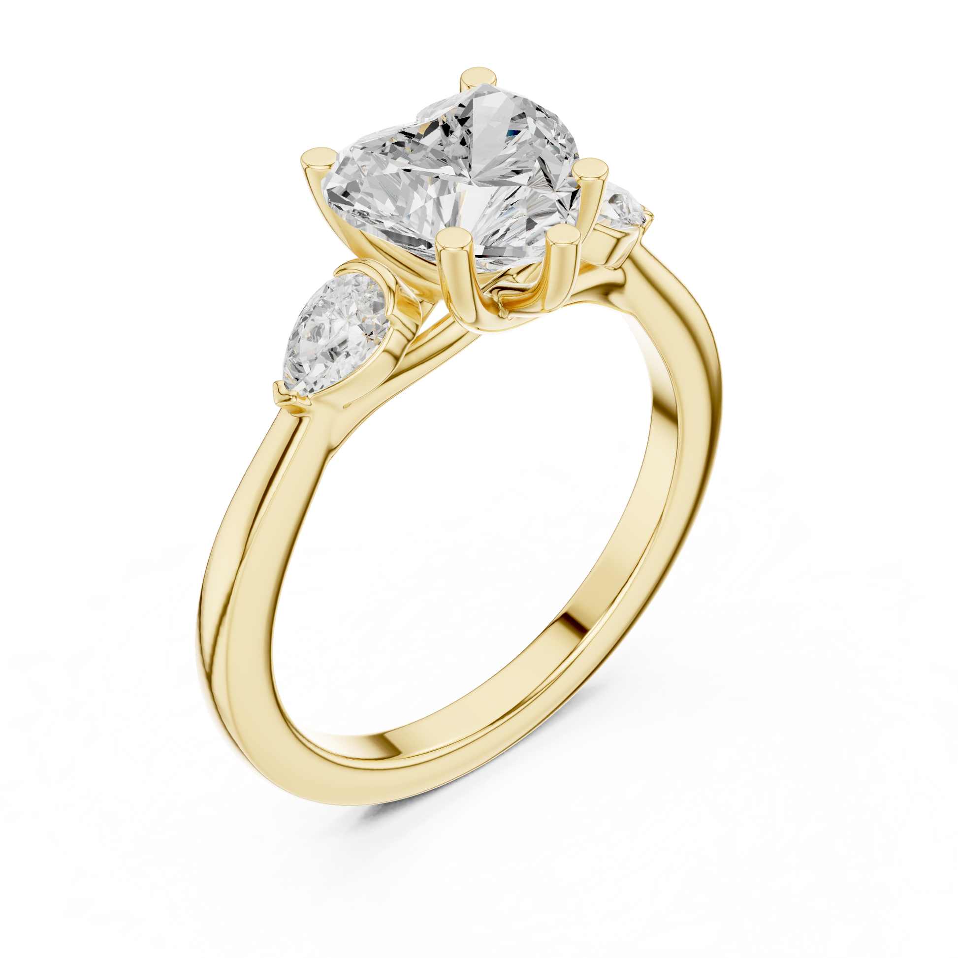 Celebrate love in its purest form with this enchanting heart-shaped three-stone engagement ring. The dazzling heart-cut center diamond is gracefully flanked by two shimmering pear-shaped side stones, creating a soft, romantic silhouette that sparkles from every angle. Crafted in glowing gold, the ring blends elegance, symbolism, and brilliance—perfect for someone who cherishes meaningful details and radiant beauty. A true declaration of love, designed to shine forever.