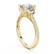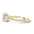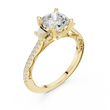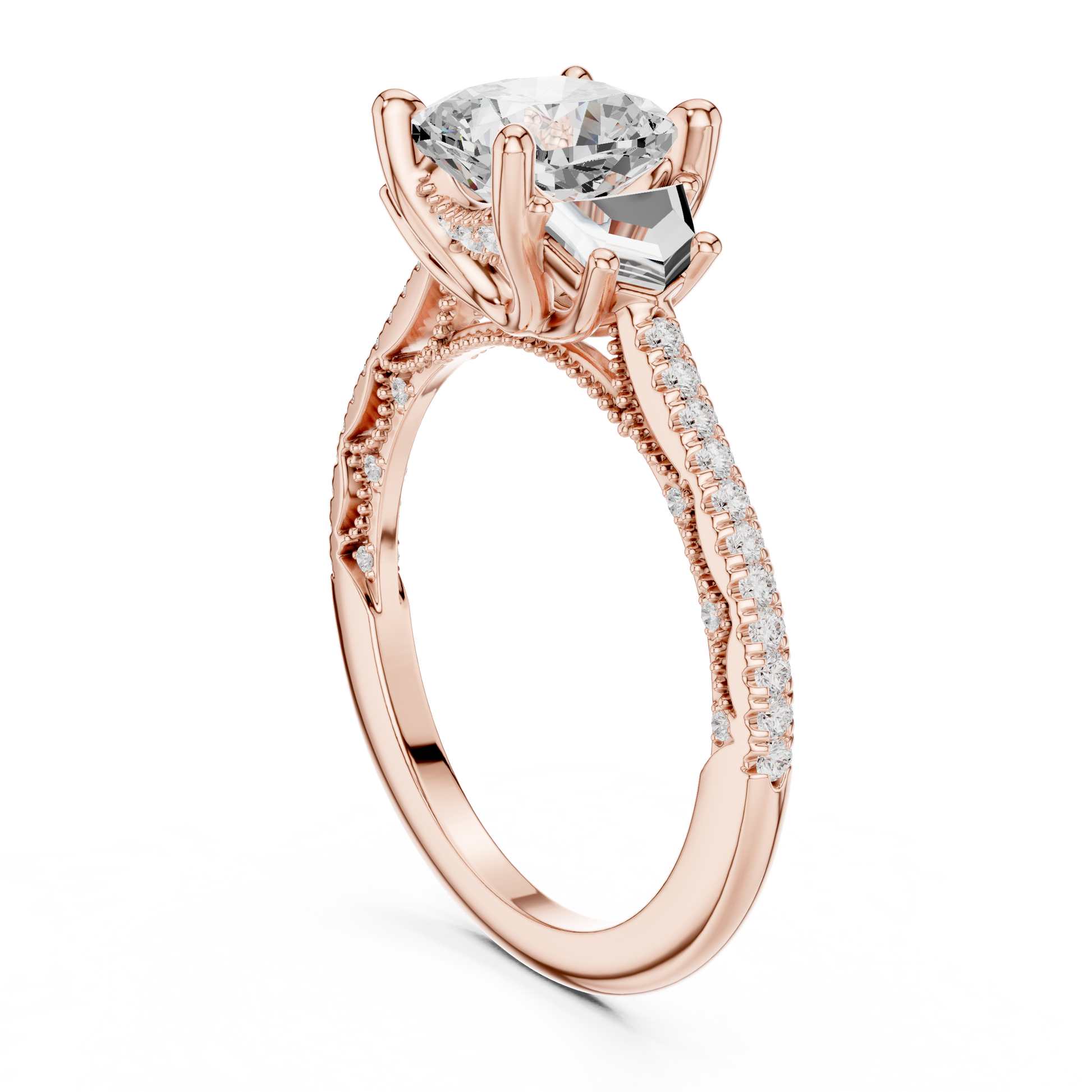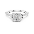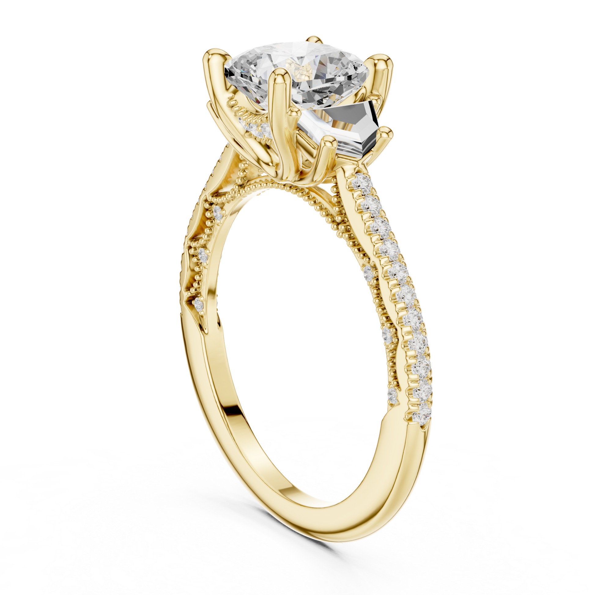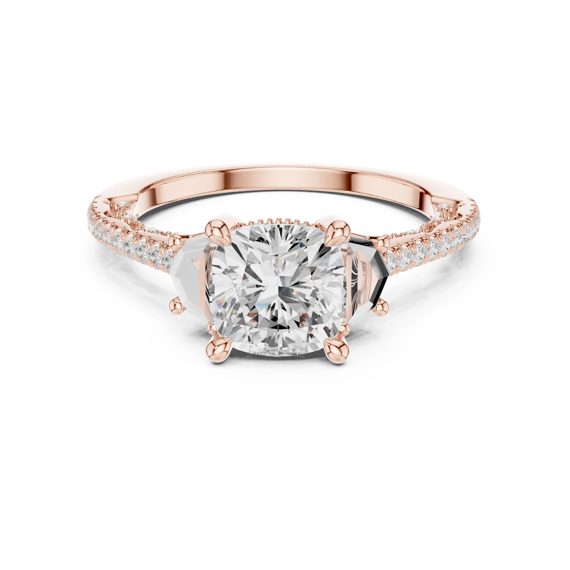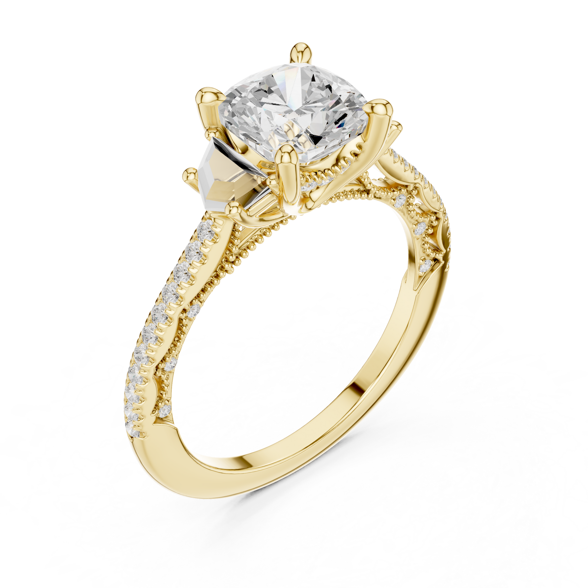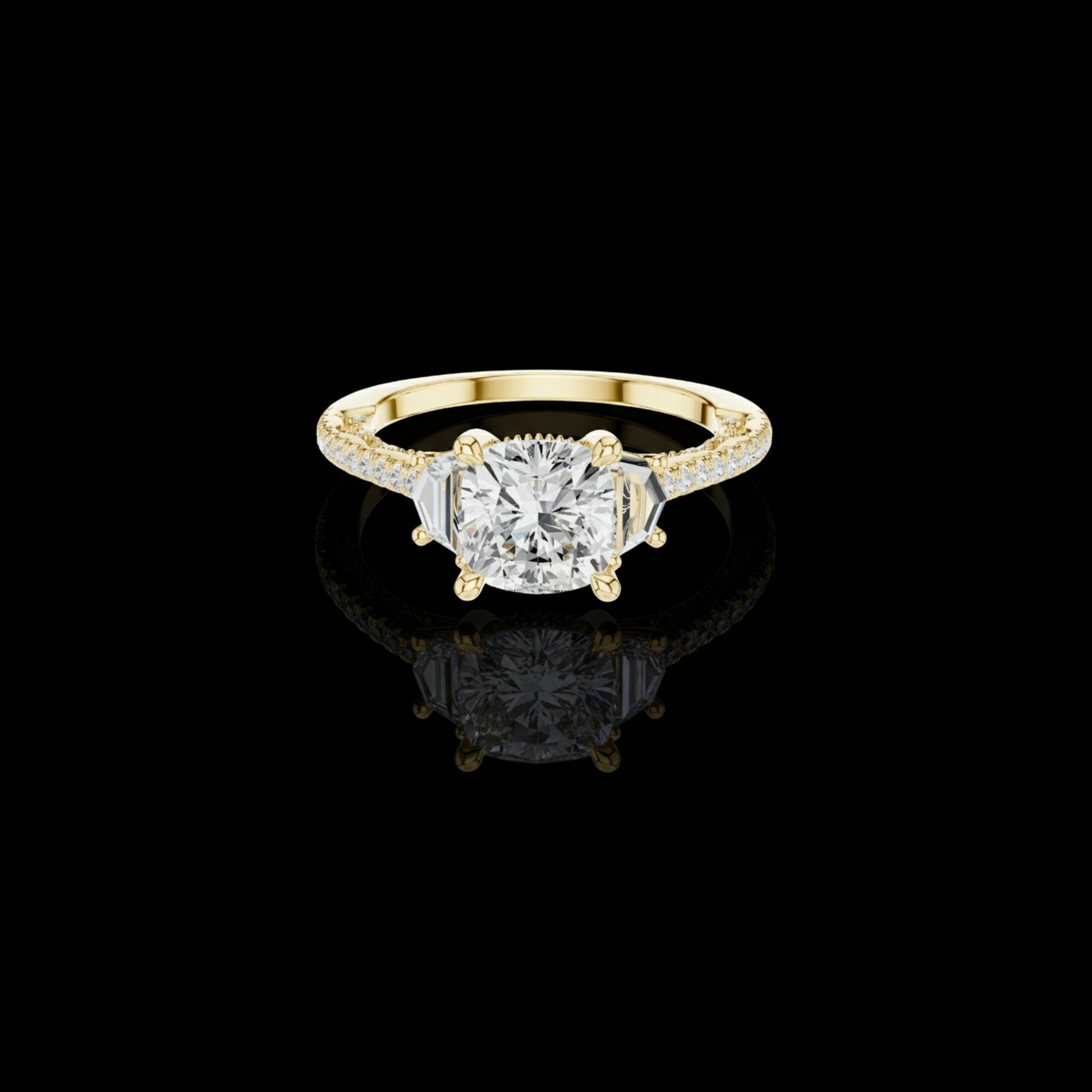 This stunning ring features a brilliant cushion-cut center diamond, beautifully accented by sleek cadillac side stones that enhance its sparkle and presence. Crafted in rich gold, the delicate pavé-set band adds refined brilliance while maintaining a timeless silhouette. The balanced design blends modern elegance with classic charm, making this ring a perfect symbol of everlasting love, commitment, and sophistication.
