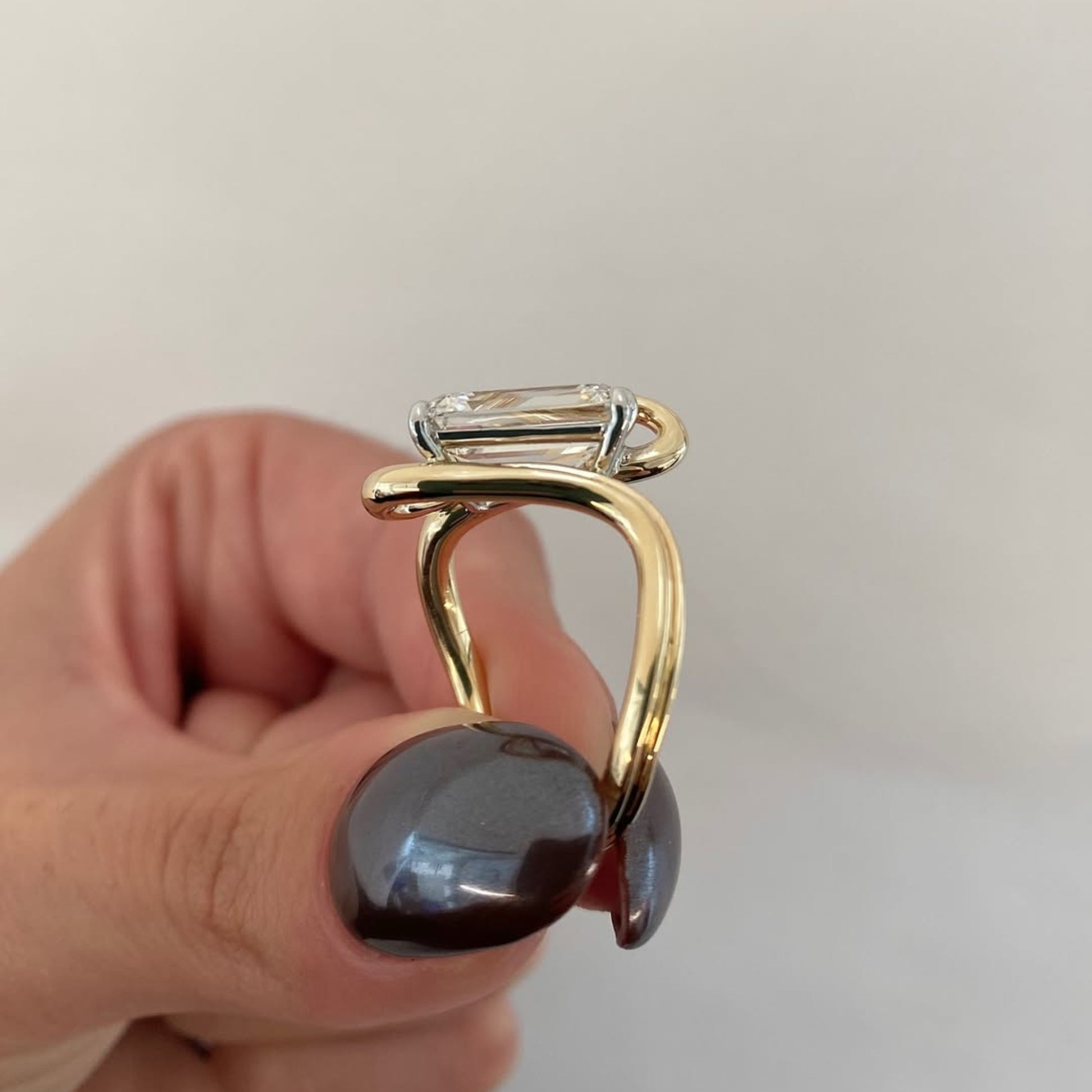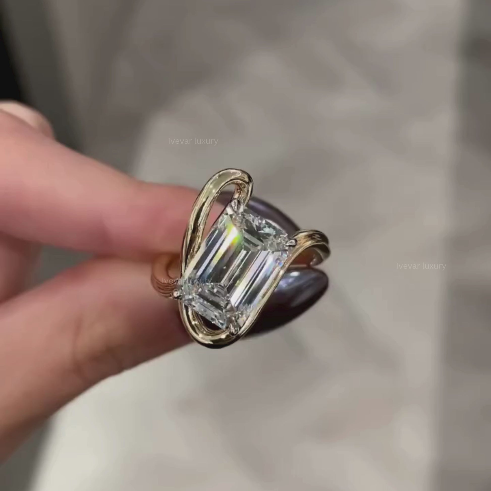 Bold geometry meets fluid elegance in this striking emerald-cut diamond ring. The center stone features crisp step-cut facets that create a mesmerizing hall-of-mirrors effect, celebrated for its clarity and architectural beauty. Set in a modern four-prong mount, the diamond appears to float effortlessly within the design. This contemporary silhouette adds movement, dimension, and artistic character while maintaining a refined luxury aesthetic. Perfect for those seeking a modern engagement ring or a statement piece that blends minimalism with bold design, this ring is a true expression of modern fine jewelry craftsmanship.