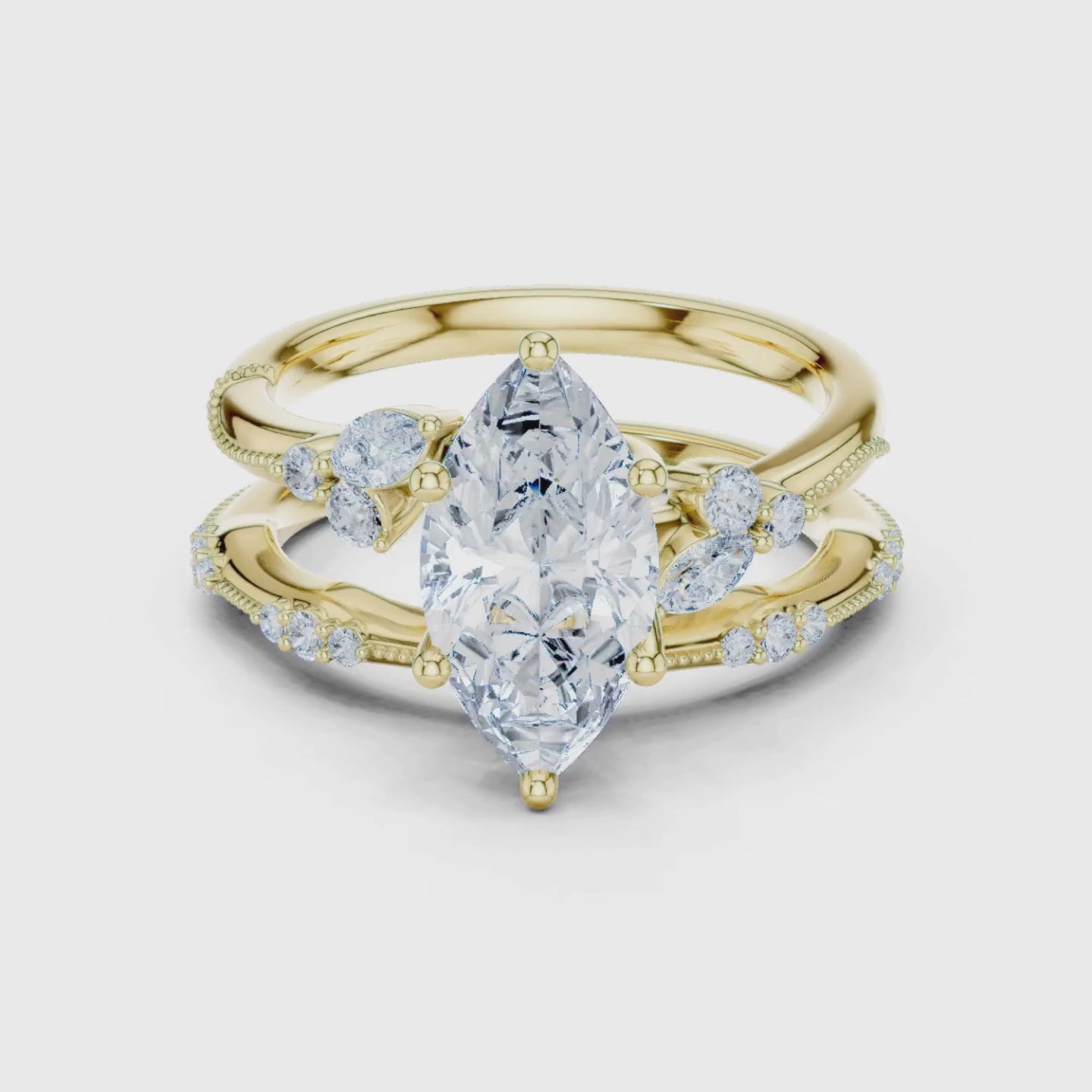 This elegant gold ring showcases a brilliant marquise-cut center diamond set in a refined prong setting. Delicate round diamond accents along the band add extra sparkle, while the matching diamond band completes the look with timeless sophistication. Designed for engagements, weddings, or special milestones, this marquise diamond ring set offers a perfect balance of classic luxury and modern elegance.