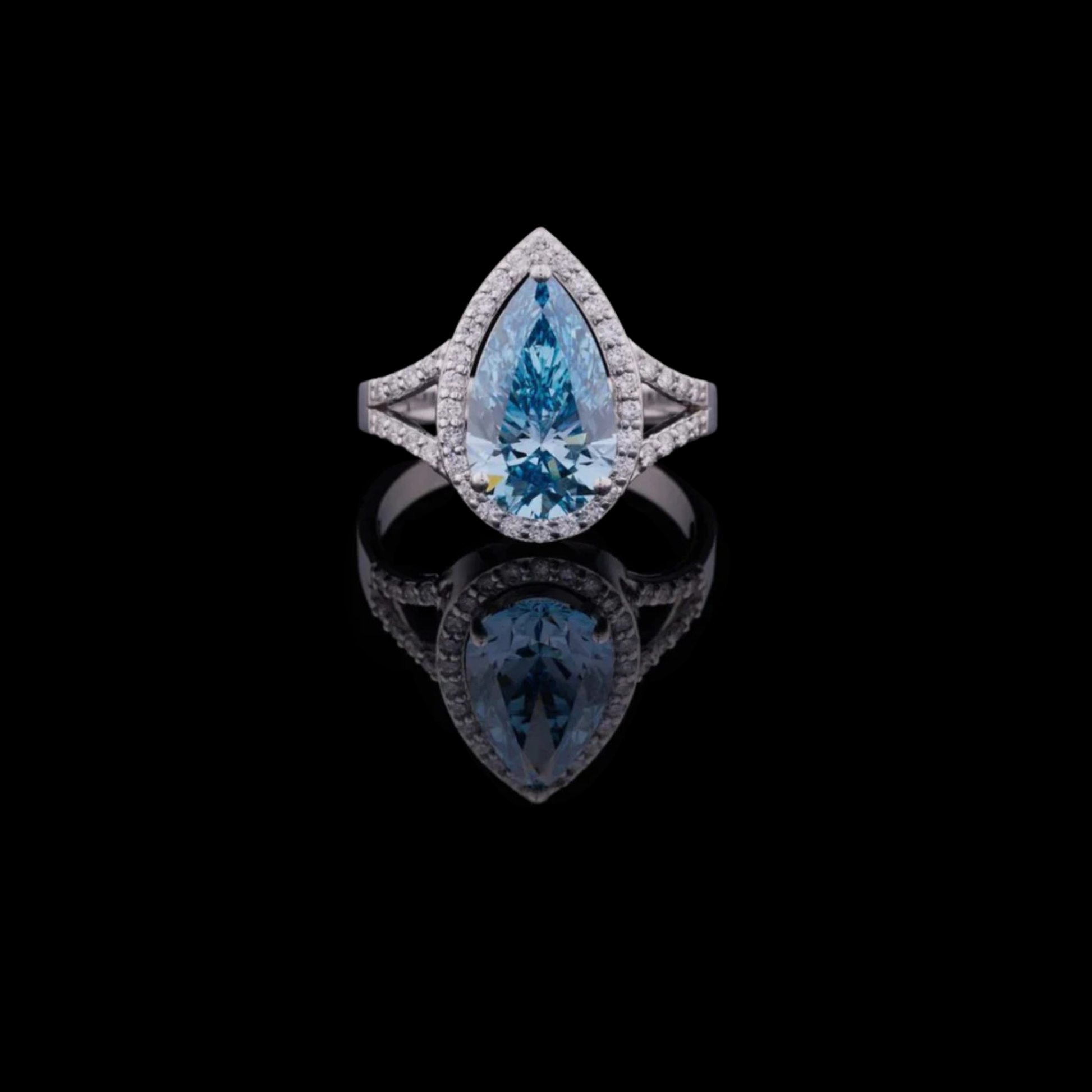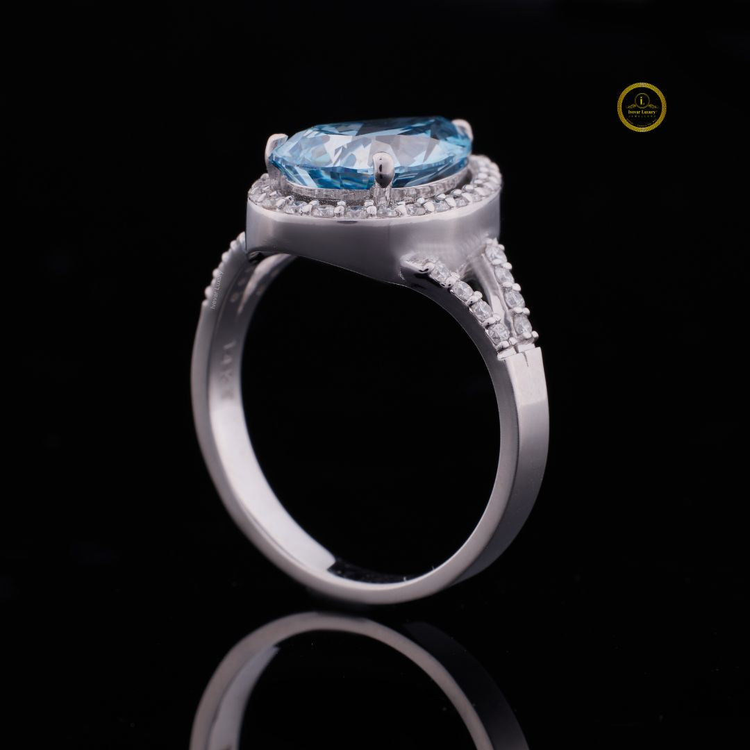 Introducing the Blue Pear Cut Diamond Halo Ring by Ivevar Luxury a masterpiece that radiates sophistication and timeless beauty. This exquisite piece features a vibrant blue pear-cut center stone, delicately surrounded by a halo of brilliant diamonds, all set in high-polished gold. The split shank design enhances its brilliance, giving the ring a luxurious and balanced appearance from every angle.