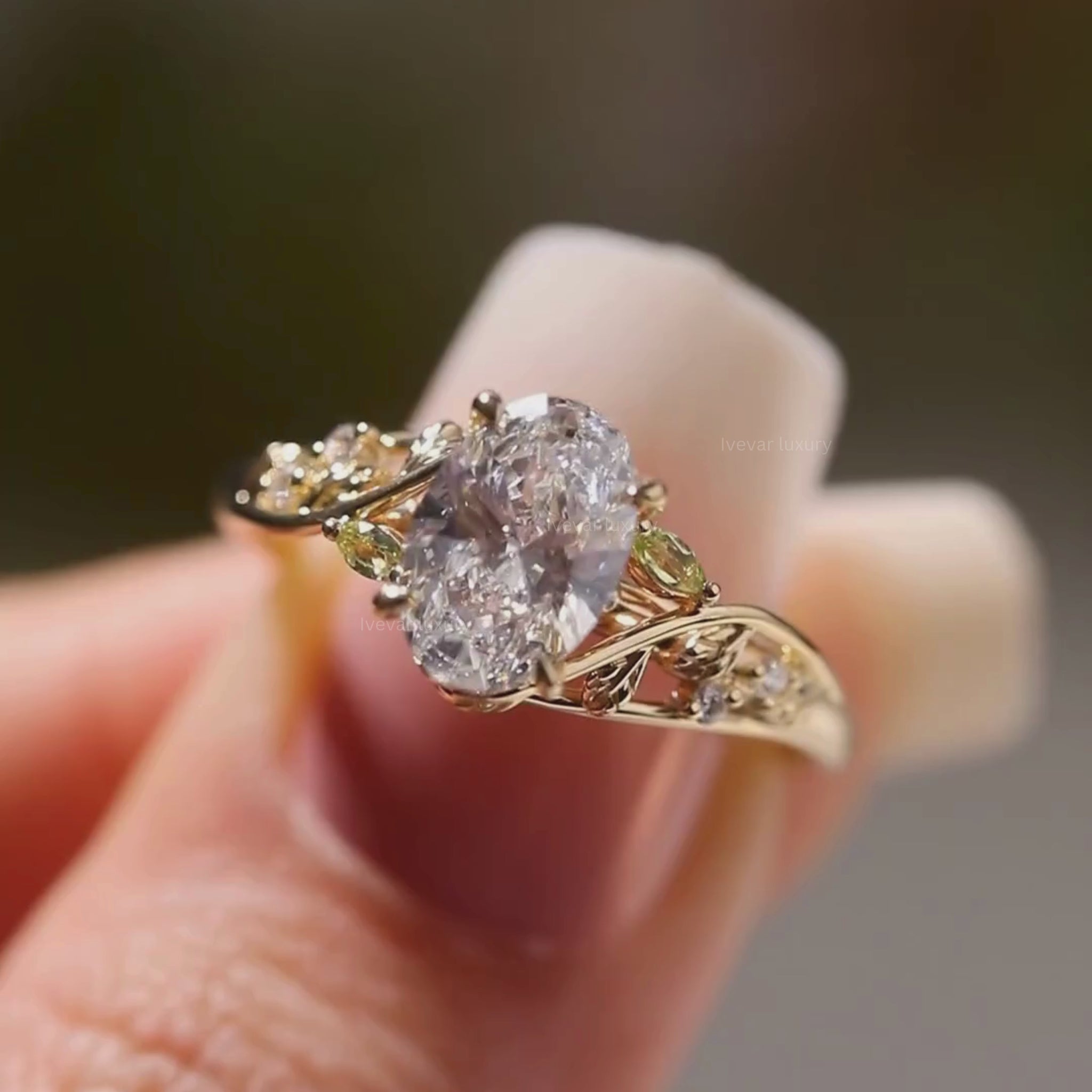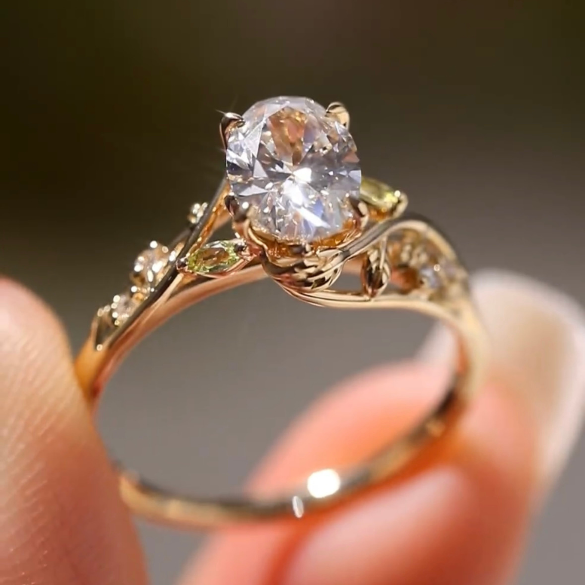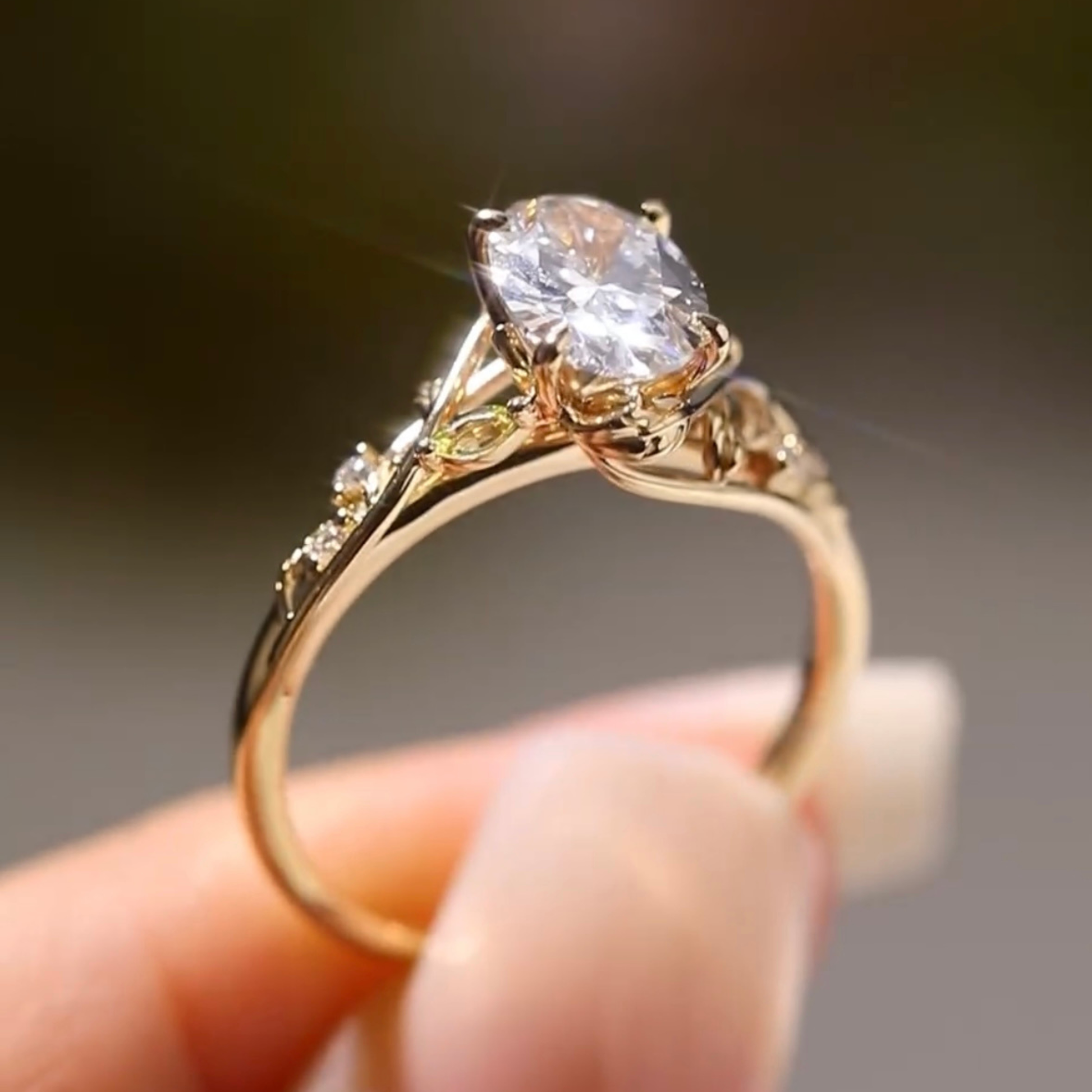 This enchanting ring showcases a brilliant Oval-Cut Diamond, admired for its elongated shape, soft brilliance, and timeless appeal. The center stone is secured in a classic prong setting, allowing light to enhance its natural fire and clarity.The band features leaf-inspired detailing with delicate accent stones, creating a design that feels both organic and luxurious. Crafted in , this ring is perfect as an engagement ring, anniversary gift, or heirloom piece, symbolizing romance, elegance, and everlasting love.