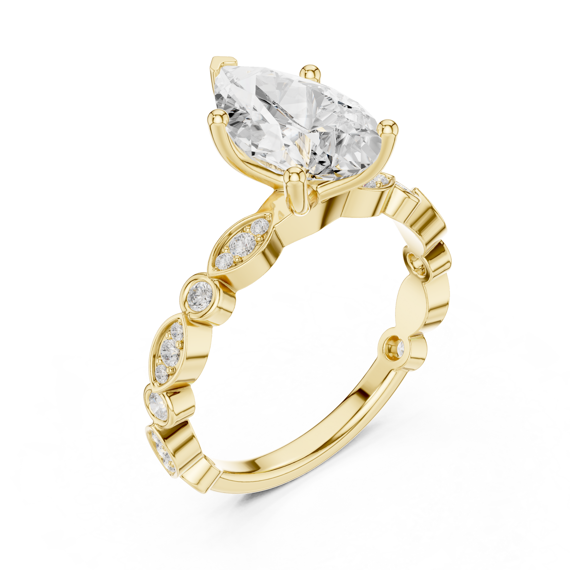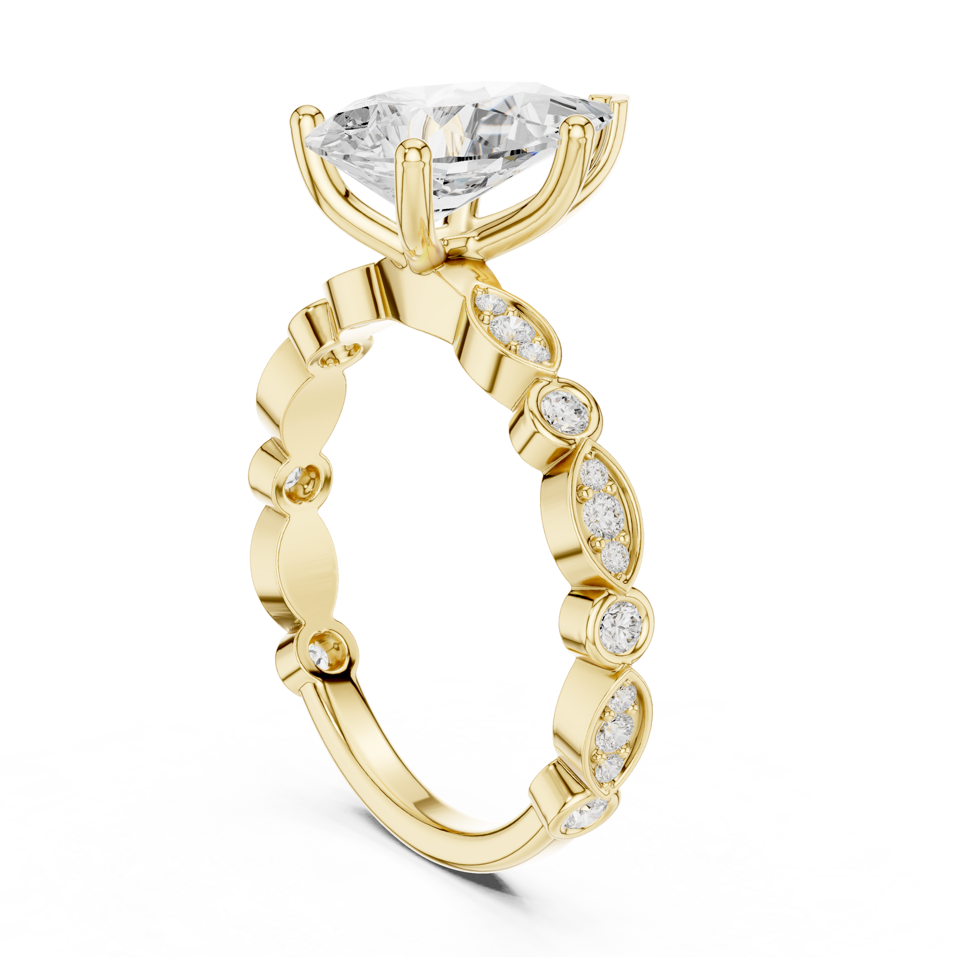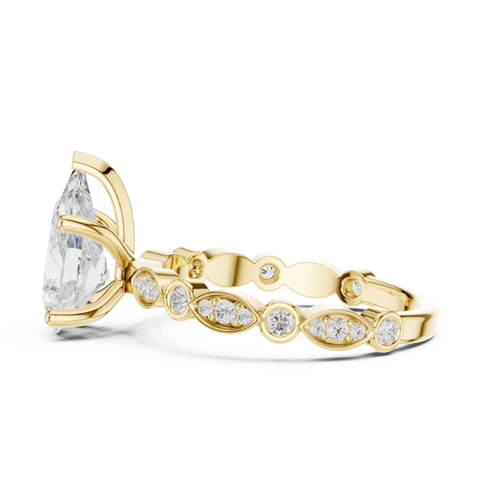 This exquisite engagement ring features a dazzling pear-cut center stone set in a polished gold band accented with vintage-inspired bezel-set diamonds. The blend of classic elegance and artistic detailing creates a timeless, graceful look that shines beautifully from every angle. Perfect for someone who loves a romantic style with a touch of modern brilliance, this ring makes a stunning symbol of love and commitment.