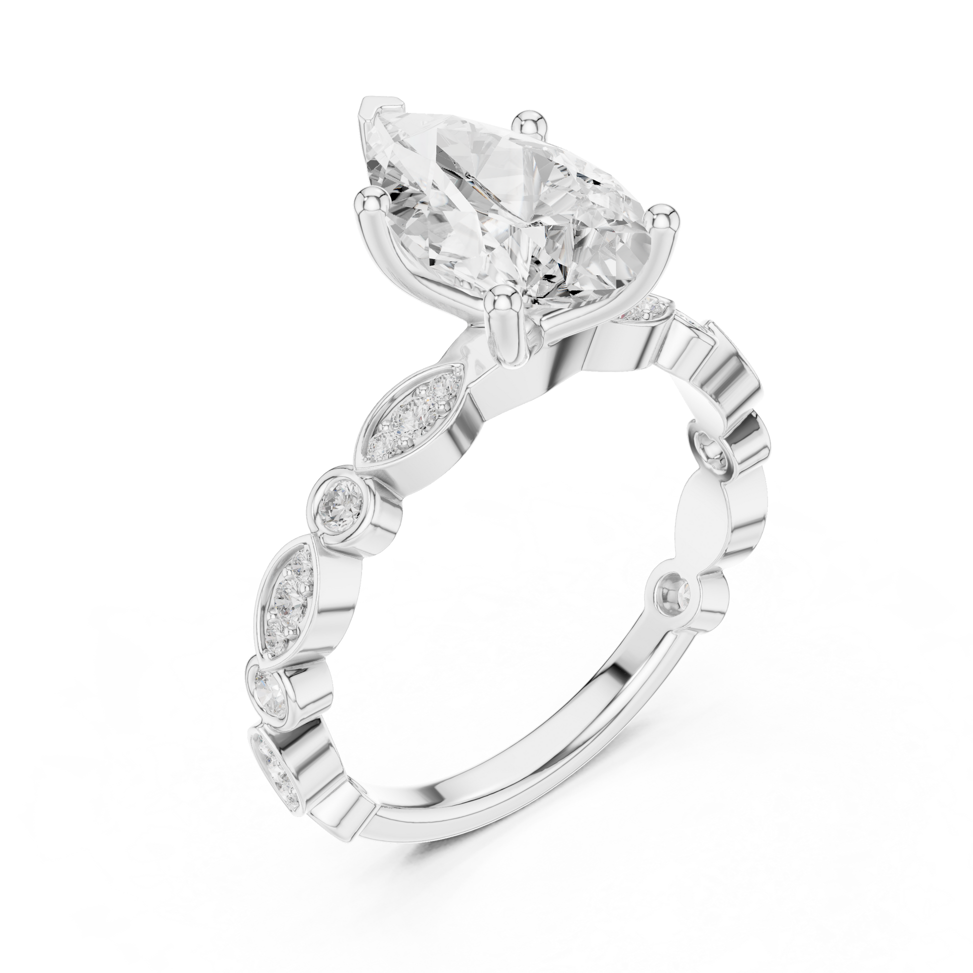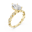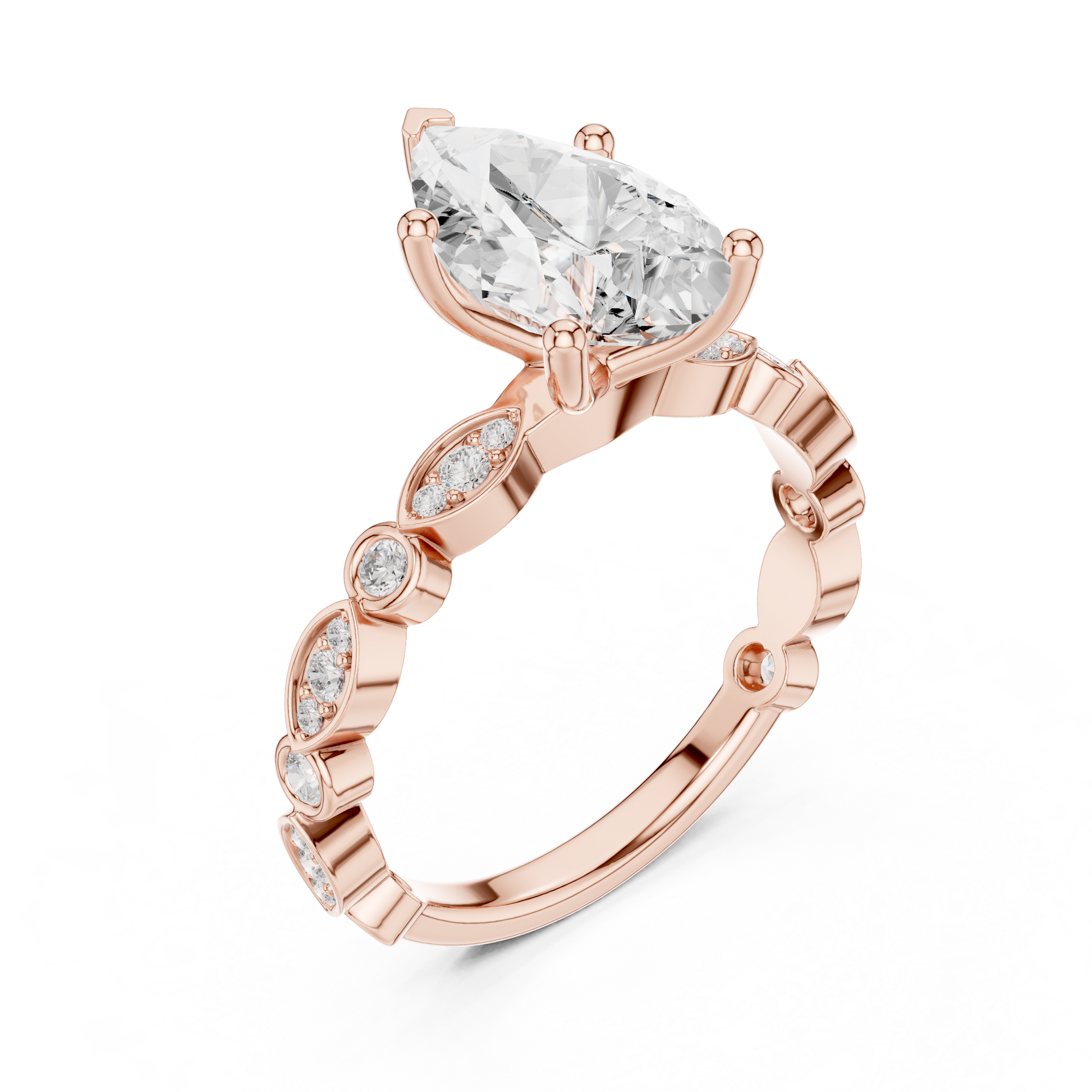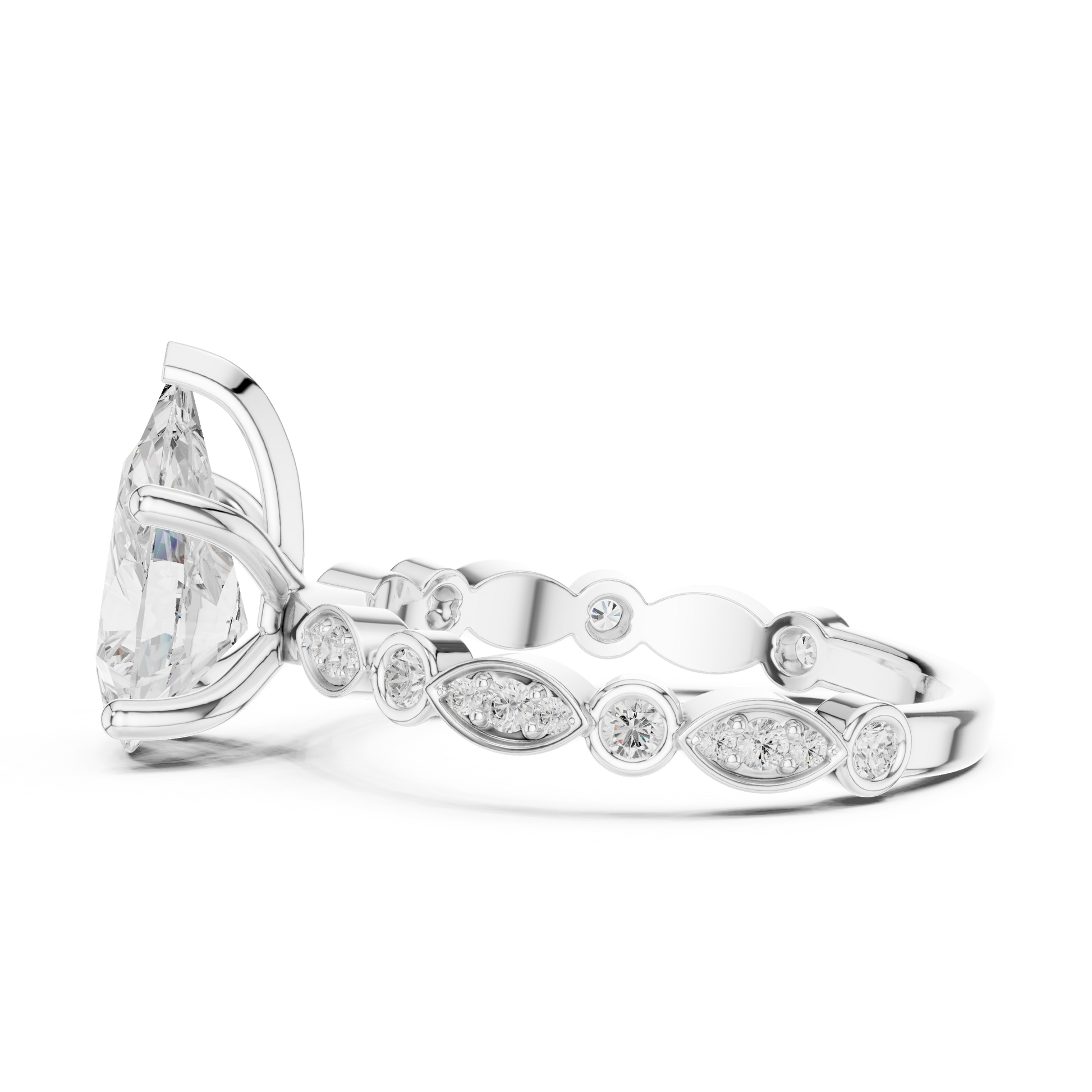 This exquisite engagement ring features a dazzling pear-cut center stone set in a polished gold band accented with vintage-inspired bezel-set diamonds. The blend of classic elegance and artistic detailing creates a timeless, graceful look that shines beautifully from every angle. Perfect for someone who loves a romantic style with a touch of modern brilliance, this ring makes a stunning symbol of love and commitment.