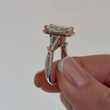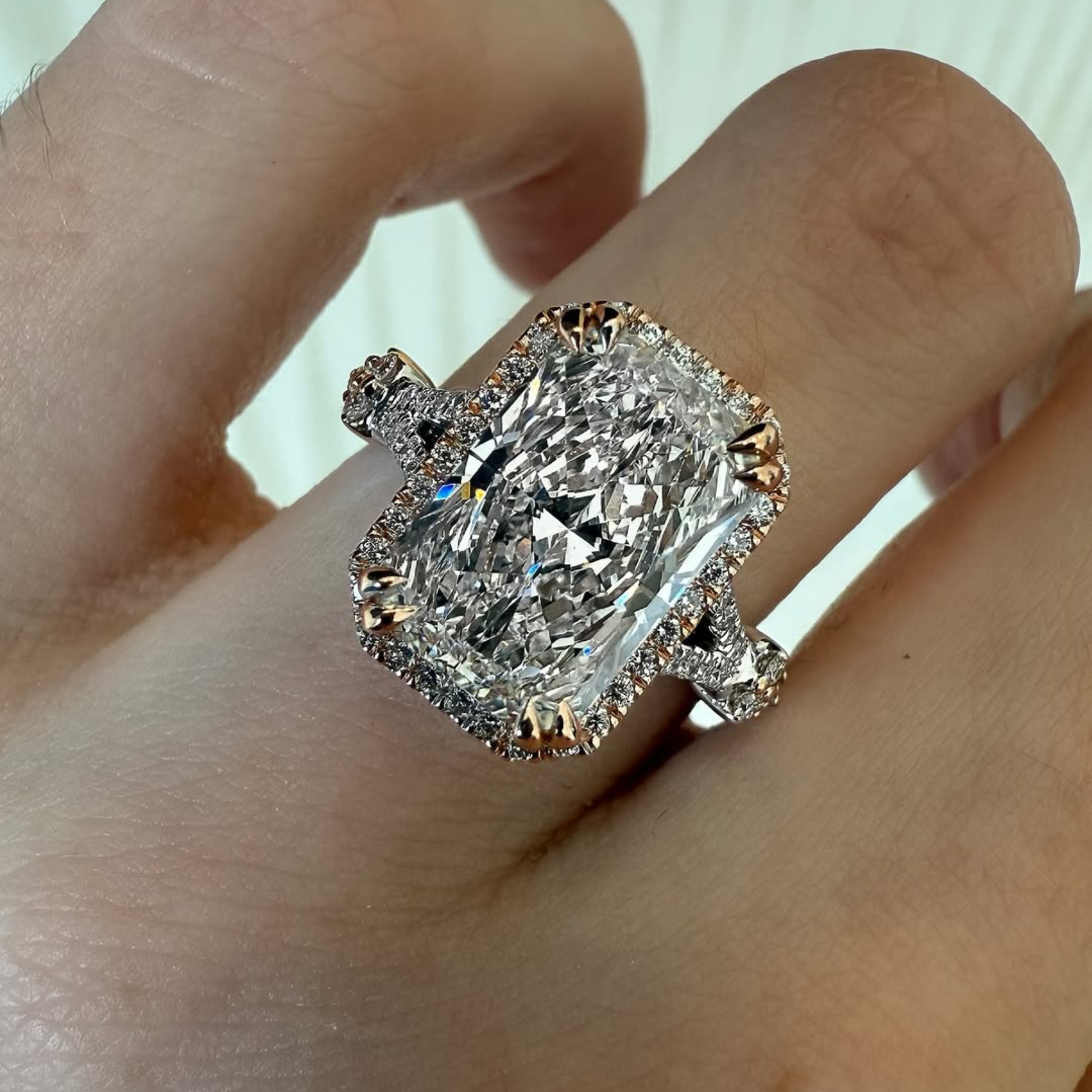 This breathtaking ring showcases a brilliant Radiant-cut diamond that radiates unmatched fire and sparkle. Framed by a delicate diamond halo, the center stone appears even more grand and luminous. The elegant pavé-set band adds refined brilliance, while the distinctive gold prongs bring a touch of vintage romance and secure beauty. Designed for those who desire timeless elegance, this ring is a true symbol of love, luxury, and forever.