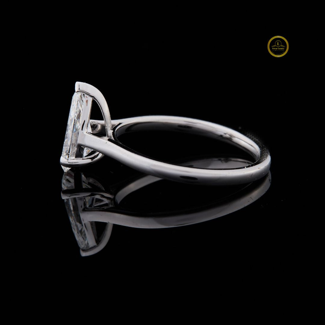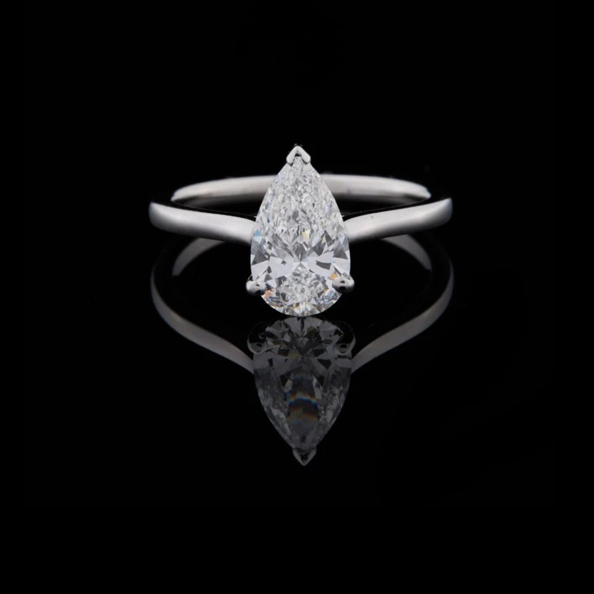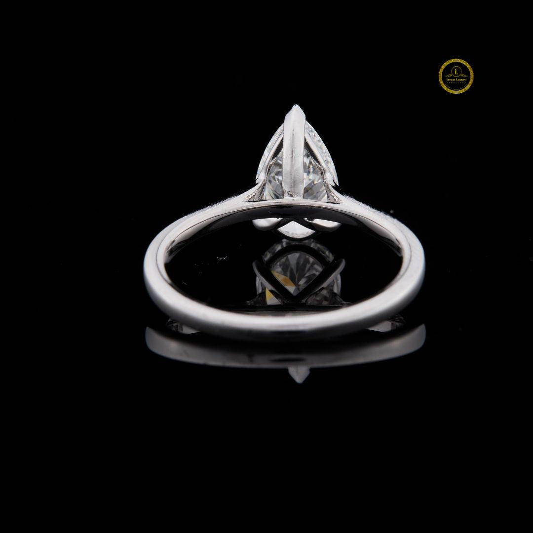 This exquisite ring embodies timeless elegance with a stunning, brilliantly cut pear-shaped diamond as its centerpiece. The diamond's graceful teardrop silhouette is emphasized by a classic and secure V-prong setting at the point and delicate prongs on the curve, allowing maximum light to enhance its fire. The highly polished band is a sleek, unadorned solitaire shank, crafted from lustrous white precious metal. The simple, tapered design draws the eye directly to the magnificent diamond, highlighting the stone's size and unique shape.