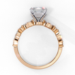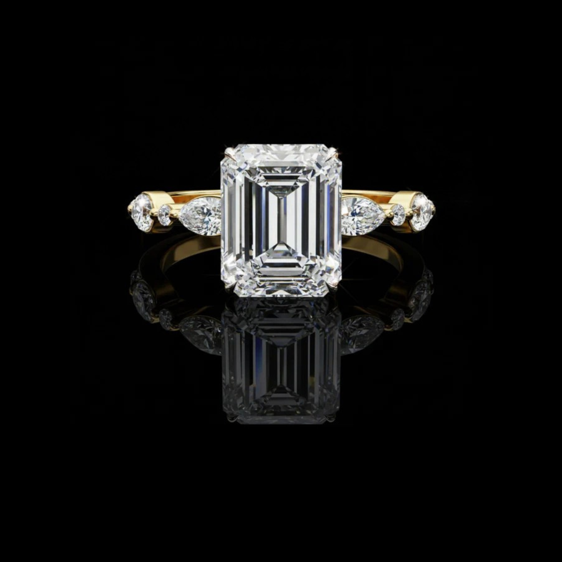 This elegant ring features a striking emerald-cut center diamond known for its clean lines, depth, and mirror-like facets. The center stone is flanked by marquise-shaped diamonds and round accent stones, all set in a polished gold ring. The combination of geometric precision and soft, tapered side stones creates a sophisticated, timeless design that highlights brilliance while maintaining a modern, luxurious feel. Perfect as an engagement ring or statement piece, it blends classic glamour with contemporary elegance.